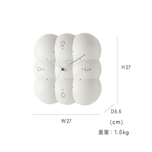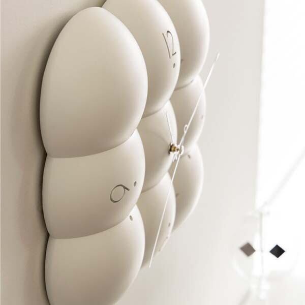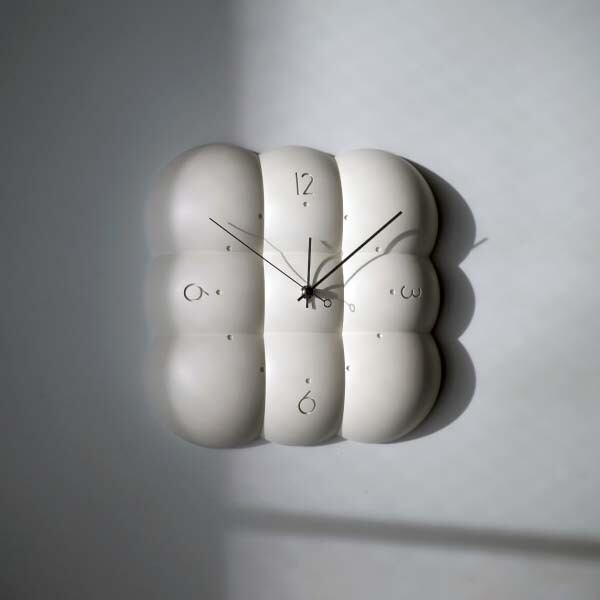 ボリュームのある膨らみに光沢のあるシルバーの針がポストモダンを連想させるデザイン。つい目が留まる、もこもこと膨らむ視覚的なユニークさ。さりげなく彫られた数字や特徴的なフォルムがやさしい陰影を作りだします。オフホワイトのカラーリングと、ゆるやかなカーブの連続に穏やかさを感じます。