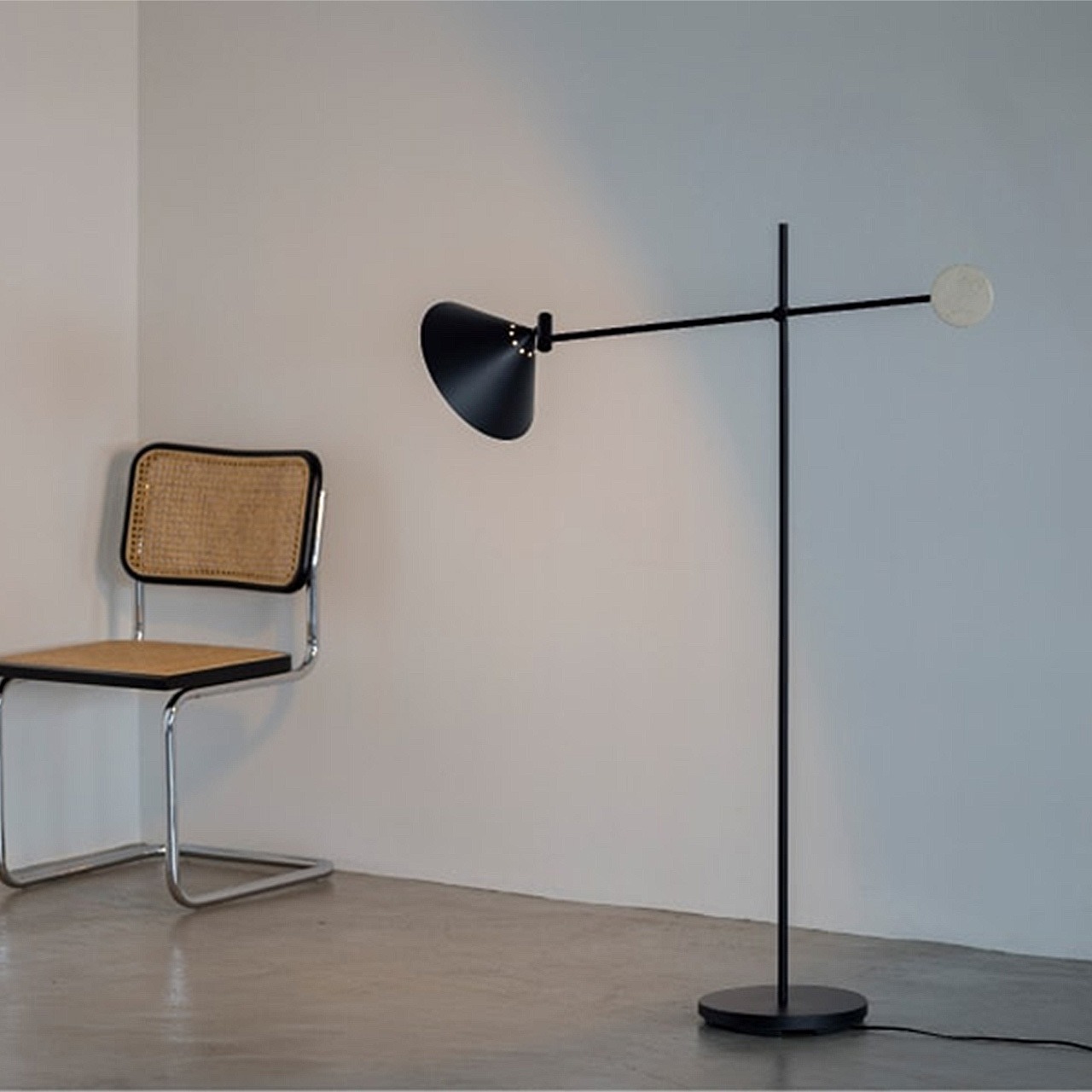 ミニマリズムを意識しながらも、◯や△の形状を取り入れたバランス感覚に優れたフロアライト。艶のないブラックカラーに添えた大理石が、自然素材ならではの温度感をプラスしています。直立にスタイリングすれば、アッパーライトとしても機能するフレキシブルなデザイン。アームとセードの角度は無段階で調節が可能。