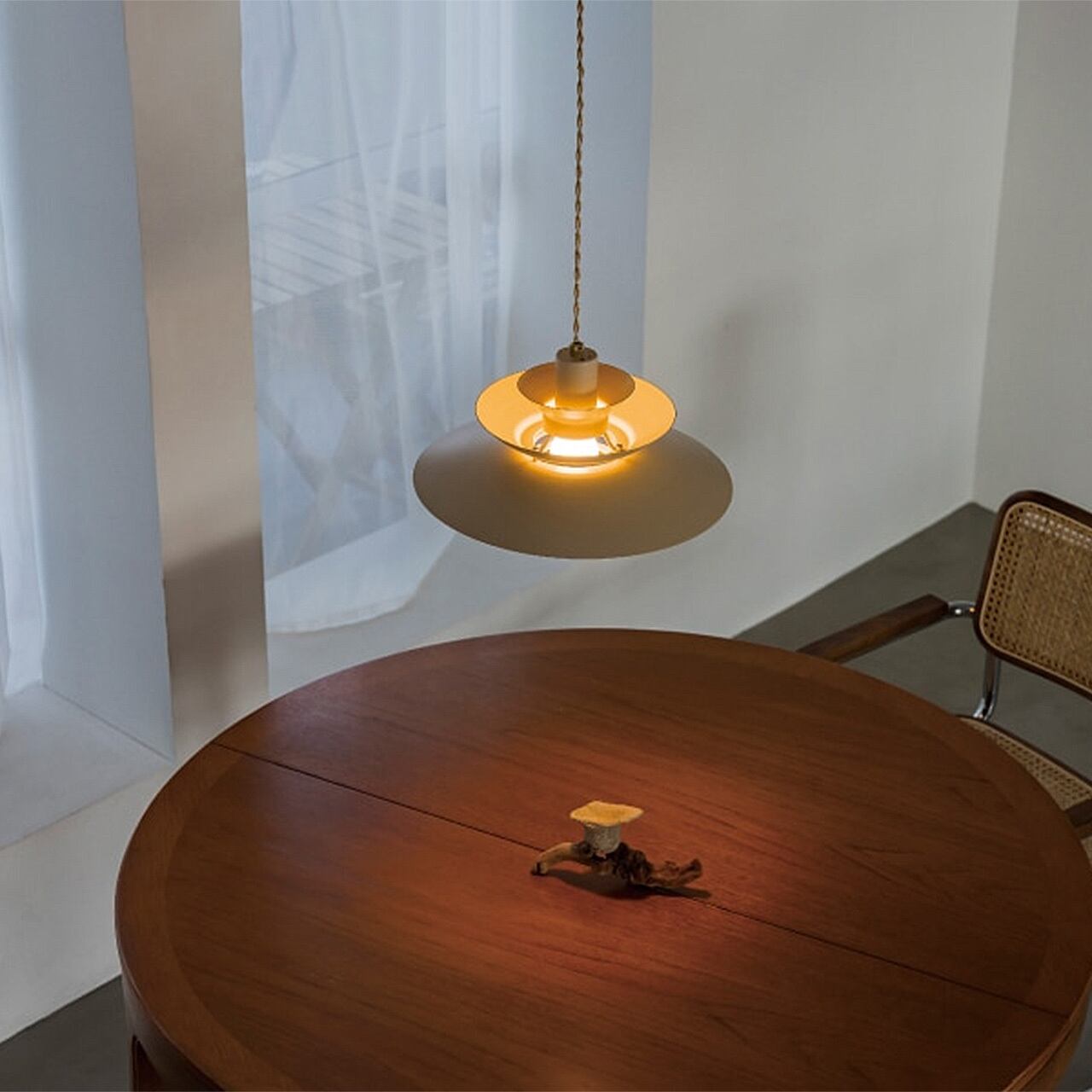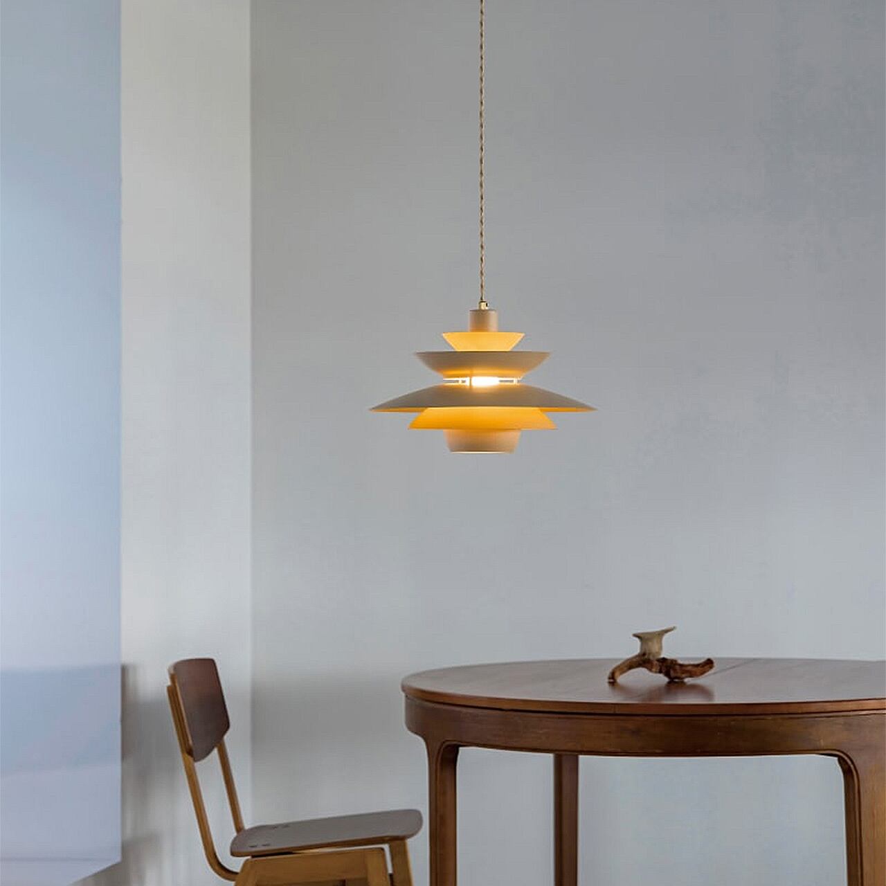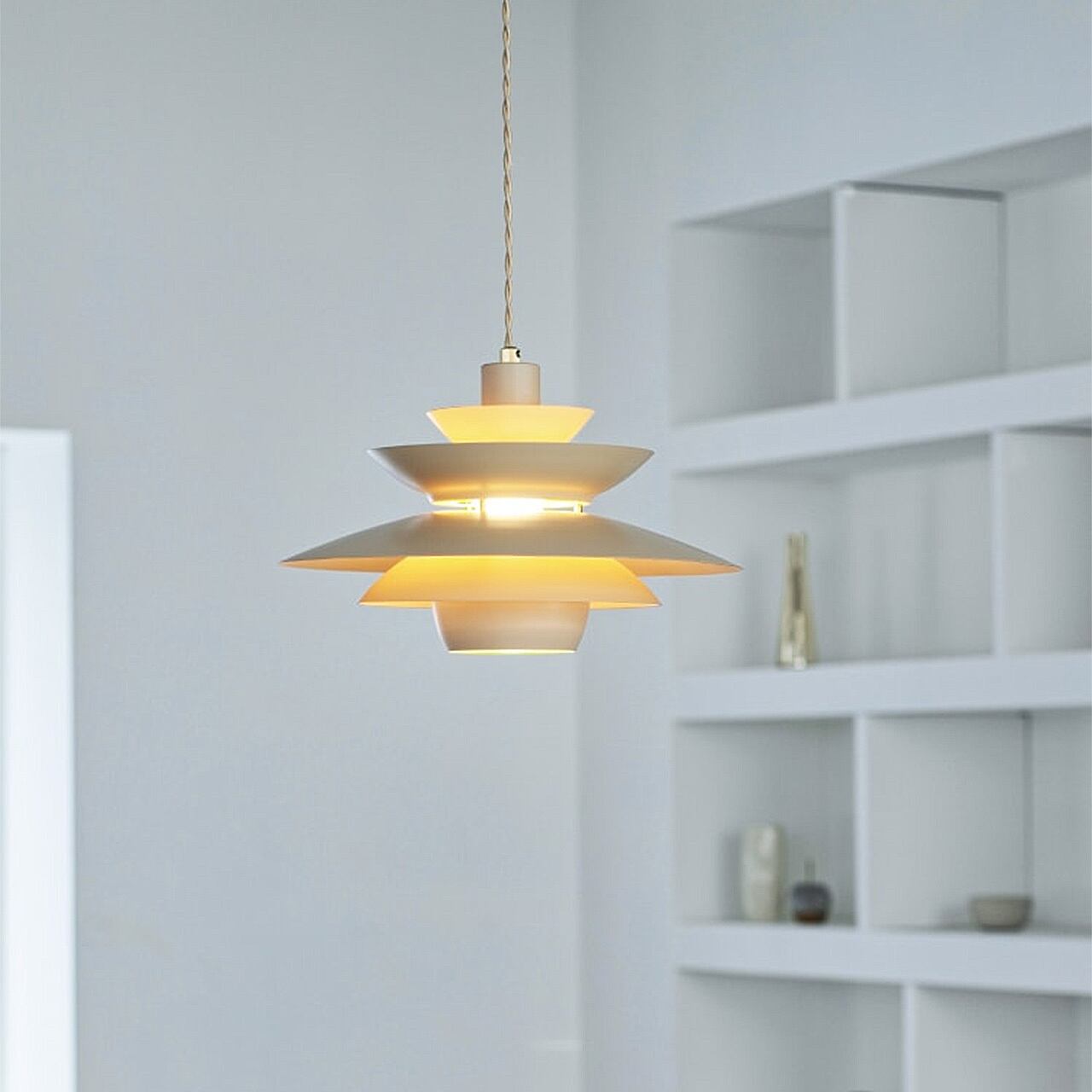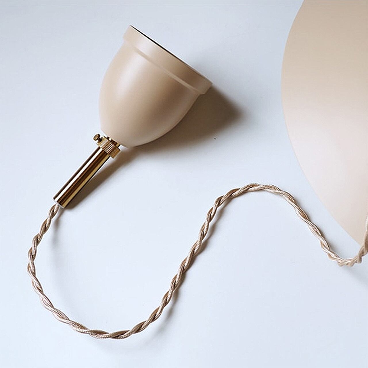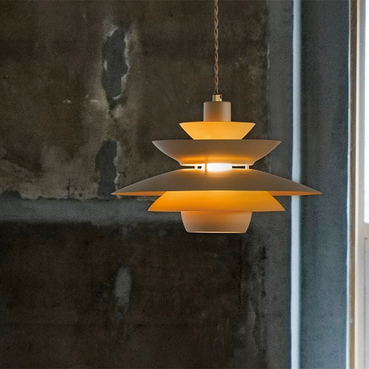 合計5枚のアルミセードが作りだす光の階層が楽しめるグレアフリーデザイン。浅めのアールとシャープな素材感がミニマルな印象を与えつつ、コードも含めサンドベージュでまとめたカラーリングがぬくもりを感じさせます。横から見ると隙間からわずかに電球が見える様は、水平線から昇る朝日のよう。ダイニングテーブルの上でも収まりのいいコンパクトなサイズに仕上げています。