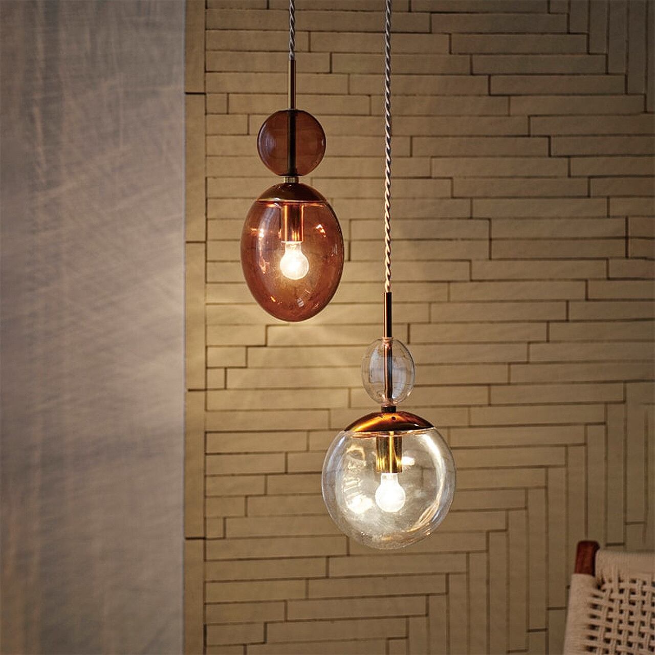 耳元で揺れてきらりと光るアクセサリーのような華やかさ。そよ風につられて乱反射を繰り返すモビールの軽やかさ。浮かんでいるような大小2つのガラスは、球体ではなく、眺める角度や方向によってそのフォルムを変化させます。視覚的なギミックの効いたデザインが感性と好奇心を刺激します。