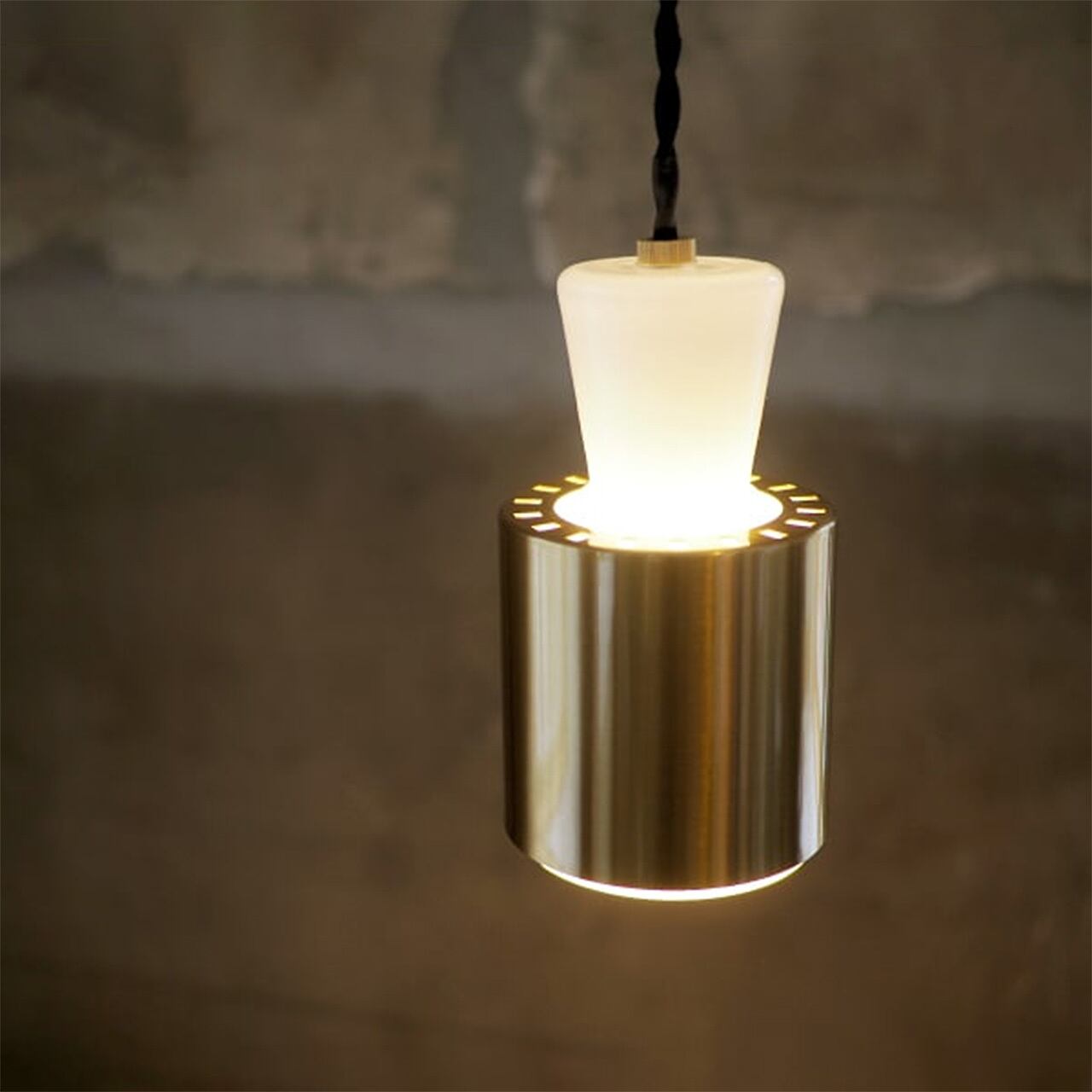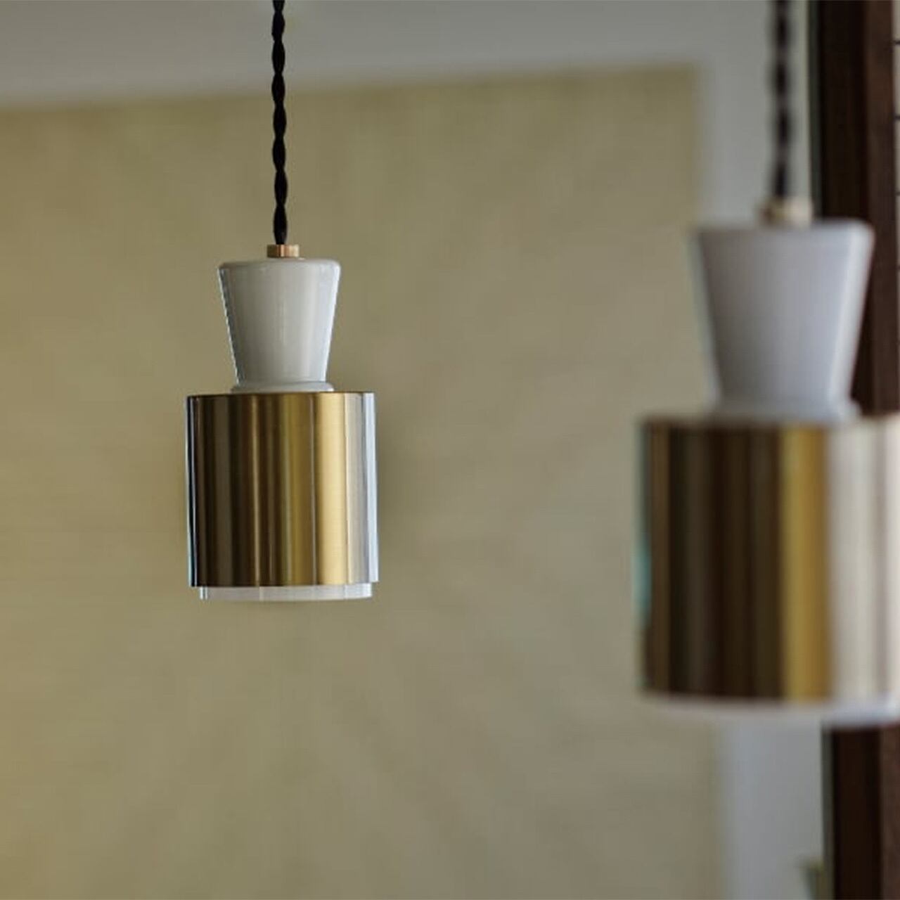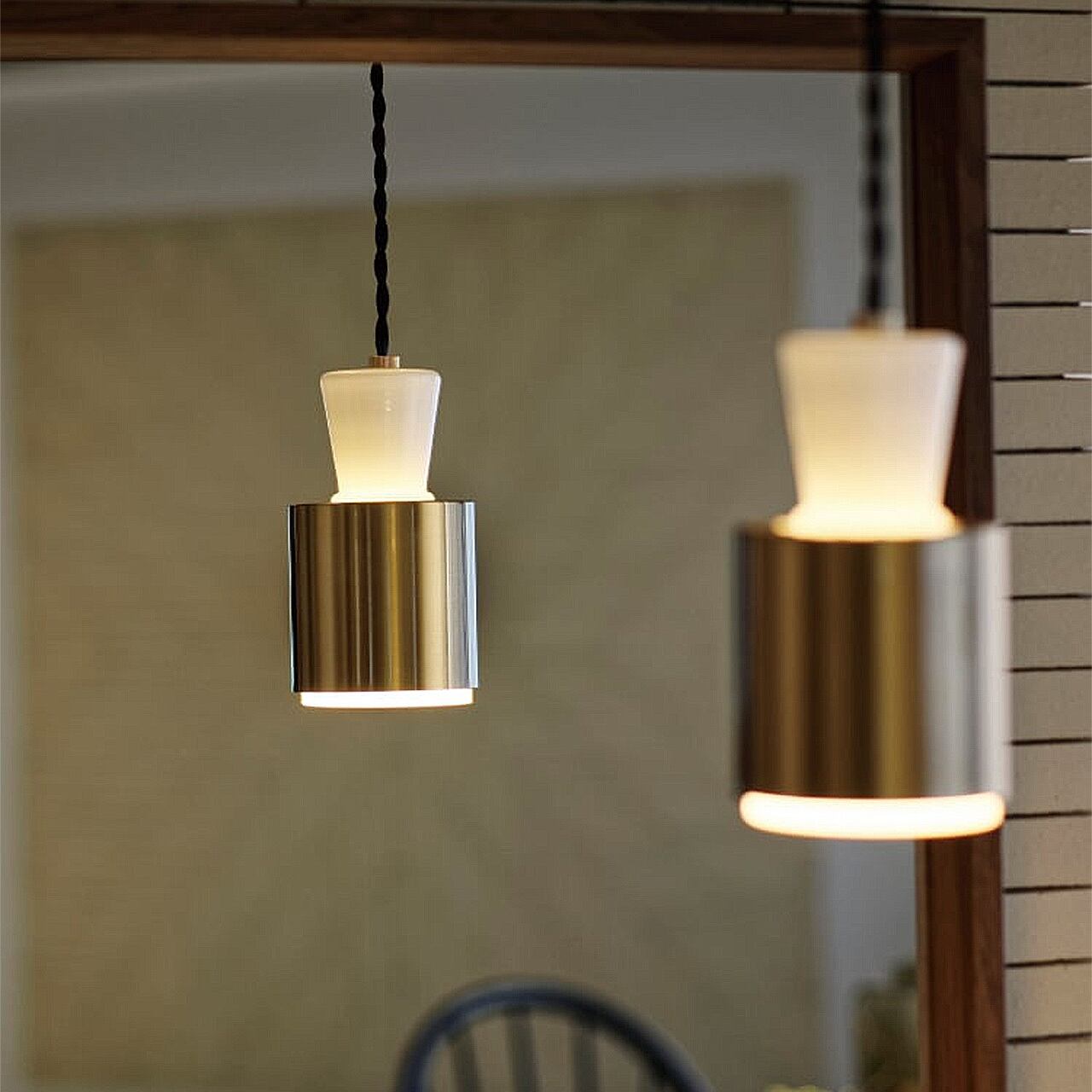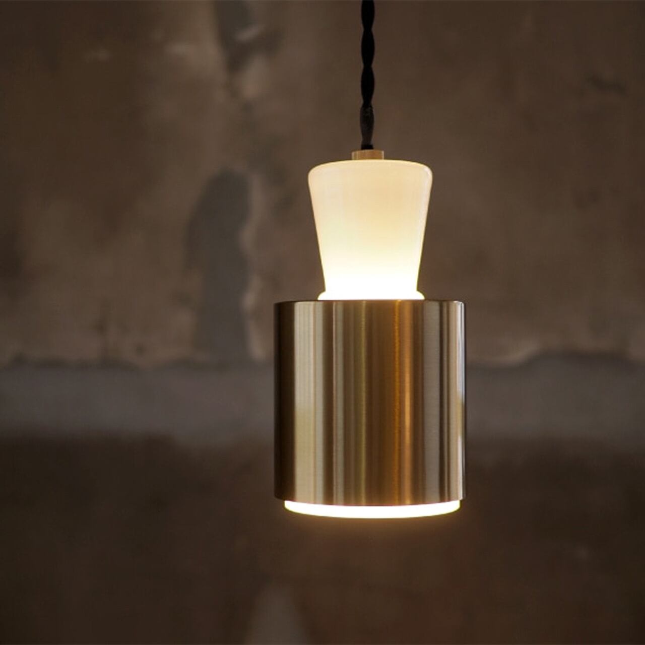 緩急をつけたガラスセードにスチールセードを重ねたスマートなシルエットが、コンパクトなサイズ感にフィット。ミニマルで凛とした表情にハッとします。裾からわずかに覗くガラスが光の帯を描きつつ、ほのかな光が伝うように昇ります。乳白ガラスとゴールドのスチールが作りだす光の質感をお楽しみください。(本品はLED球専用です。)