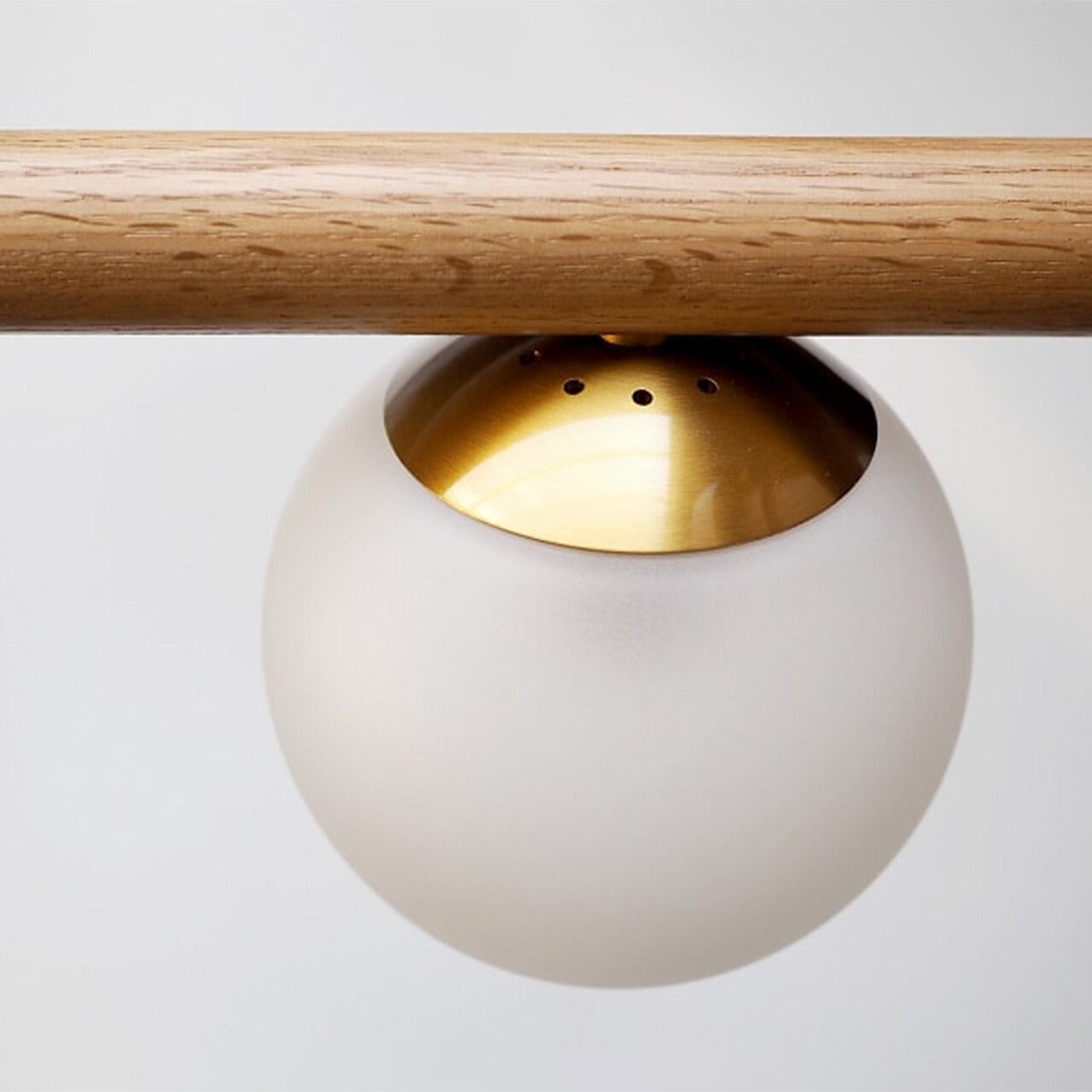インスピレーションはぽつぽつと実りを付けた枝から。ナチュラルな装いの木製アームと、床に対して斜めに、そして交互に配置したガラスセードがやさしいリズム感を生みます。しっかりとした円柱フォルムと細部のゴールドパーツが高級感を感じさせるアクセントに。手のひらサイズの小さなフロストガラスがまぶしさをやわらげ、心地よい空間を演出します。