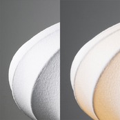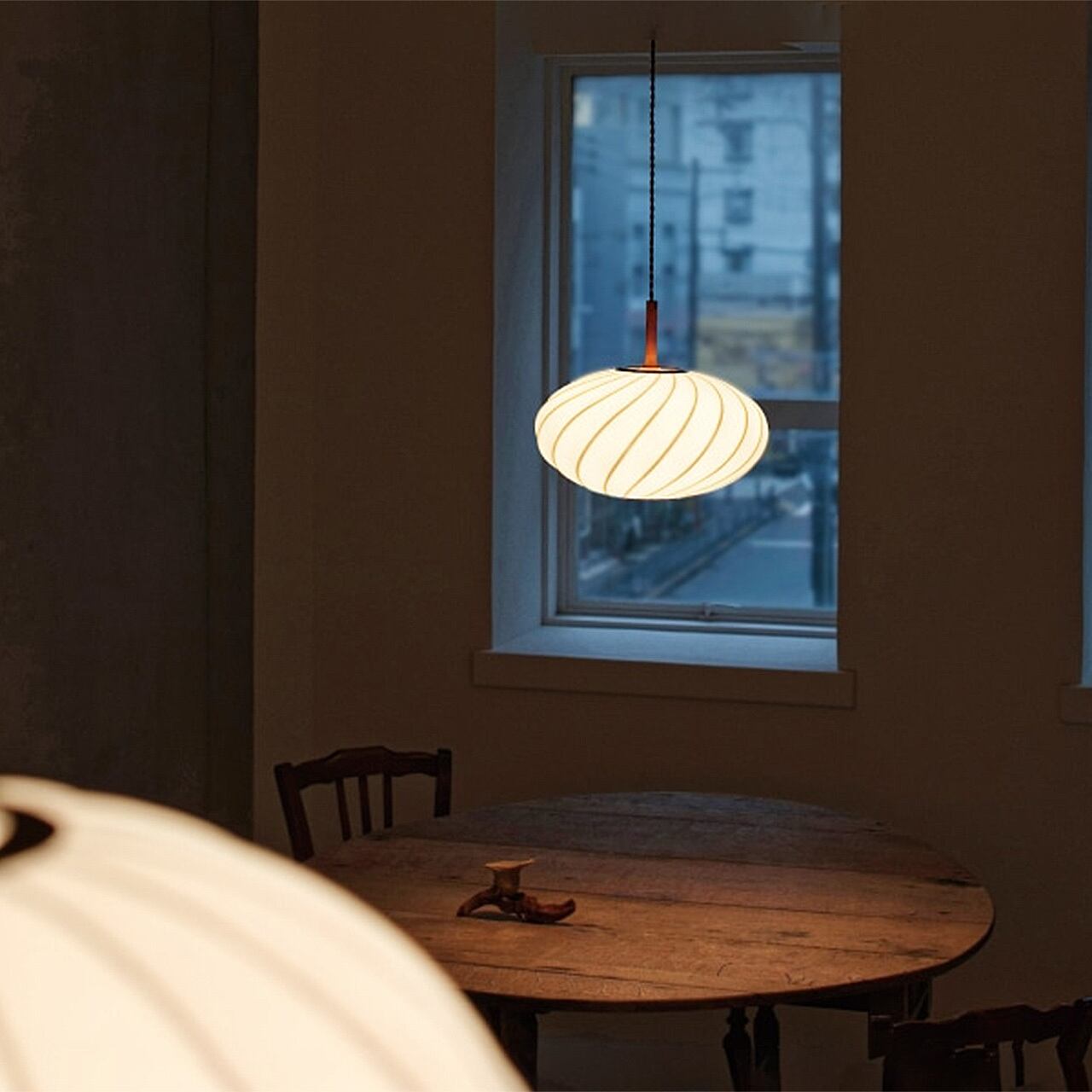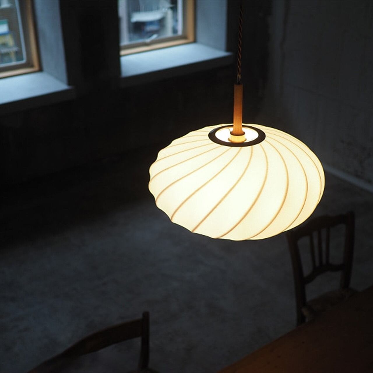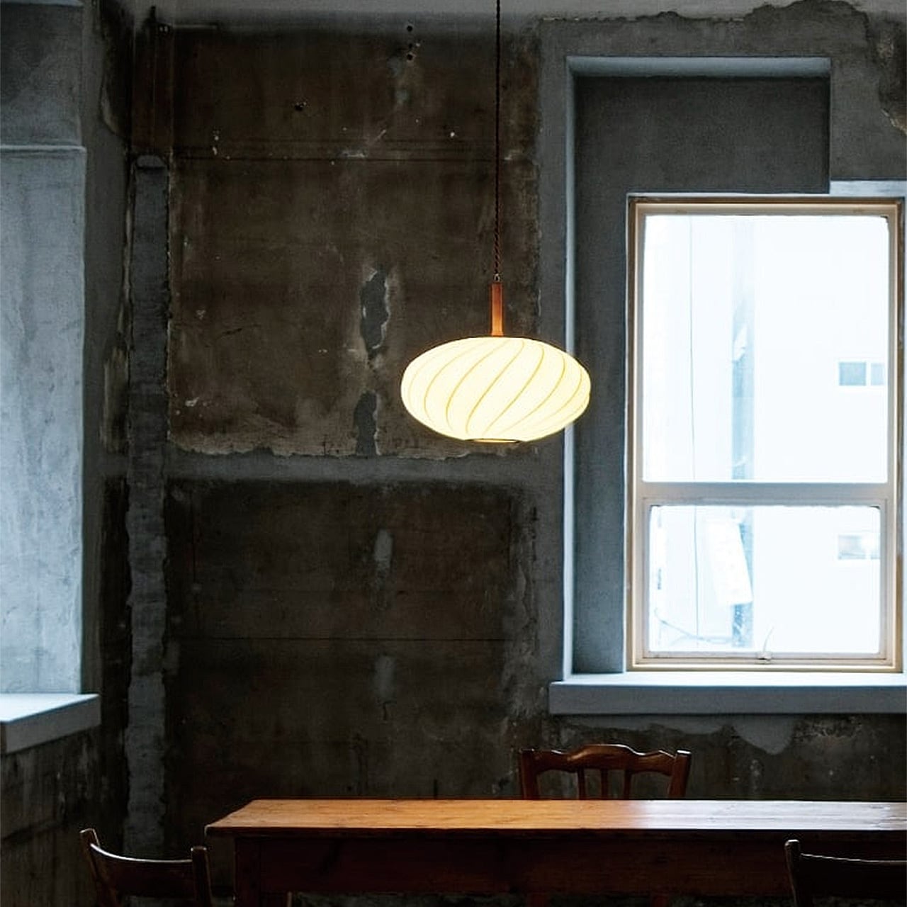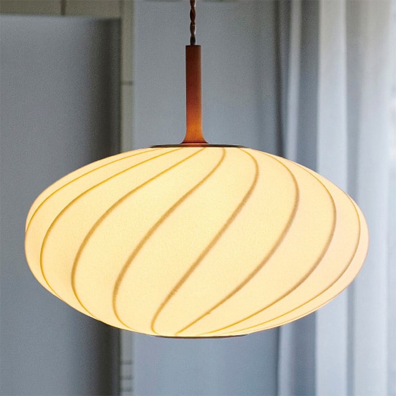 和紙にも似た弾力のある生地が人気のFalkペンダントライトの新型。緩やかなカーブのついたオーバルシルエットに普遍的な美しさを感じます。流れるような螺旋模様を描く細いワイヤーフレームにファイバーをスプレーで吹きつけて作られています。セード全体が柔らかく光る様は日本の住宅にも合わせやすく、和モダンな空間づくりにもおすすめです。