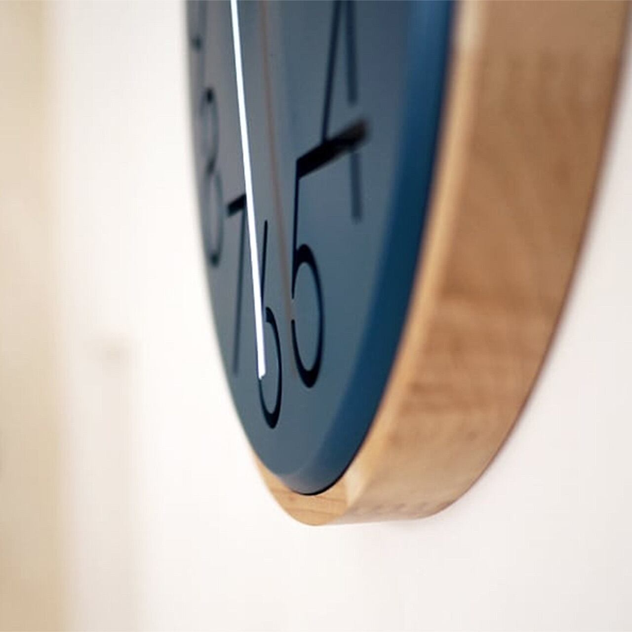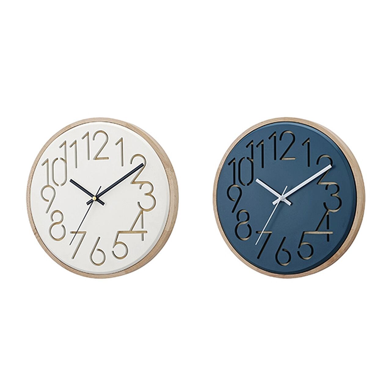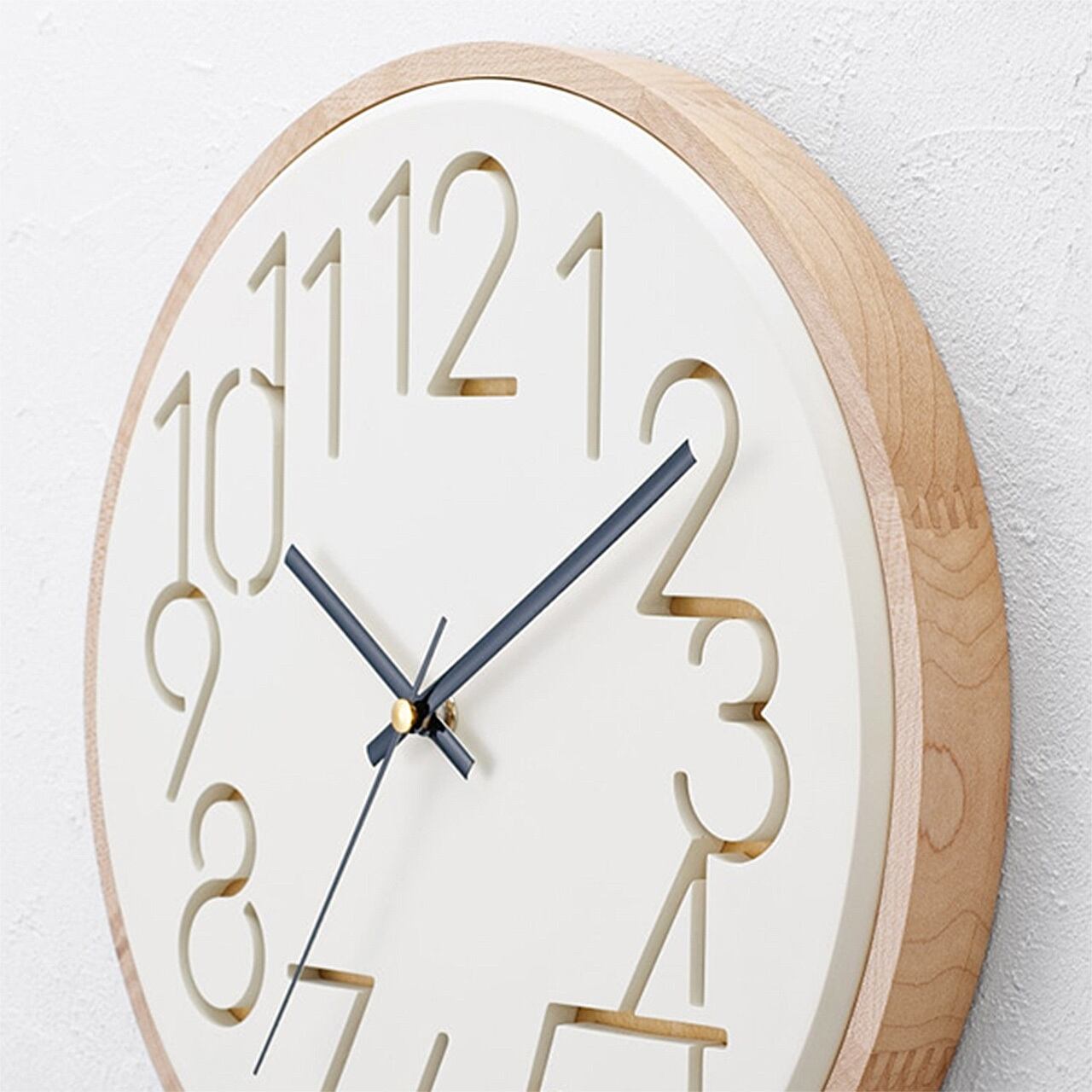 木目が美しいウッドフレームに、ポリレジンの文字盤をレイヤードさせたナチュラルなウォールクロックです。角度が変わると、くり抜いた数字部分から後ろに重ねたウッドフレームが覗くようにデザインしています。大きな数字や高い視認性など、実用性にもこだわりました。