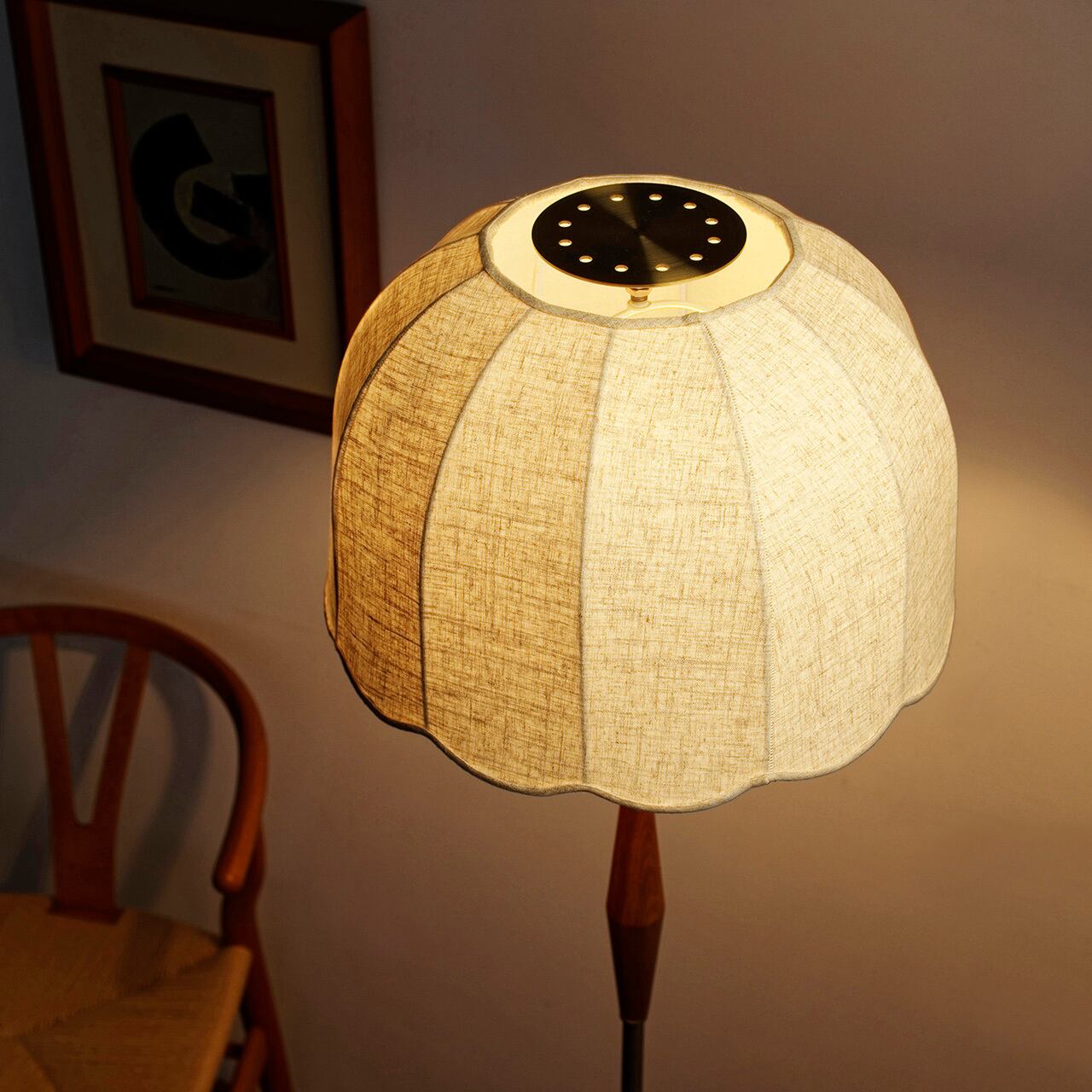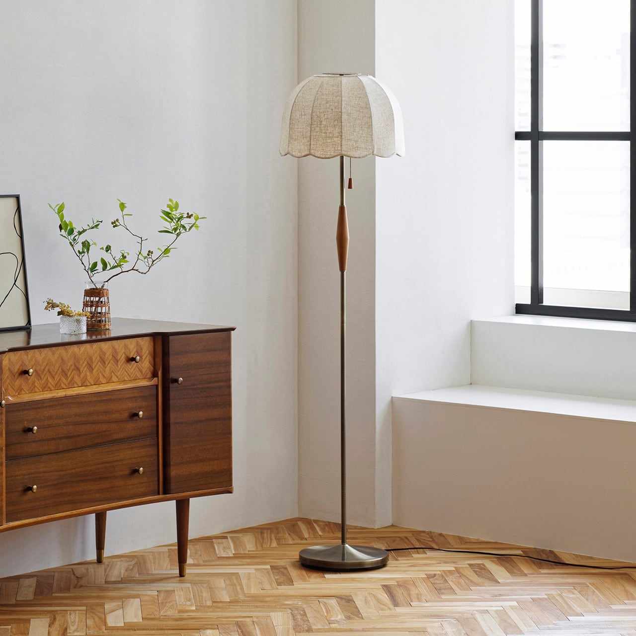 フレンチビンテージの着想を得たスカラップデザインのセードが印象的なフロアライト。光を効率的に拡散させる反射板や、ハンドルと同じウッドをあしらったプルスイッチなど、デザインと機能のバランスを追求しました。ファブリックとウッドが織りなすナチュラルな佇まいが、贅沢な時間を照らします。