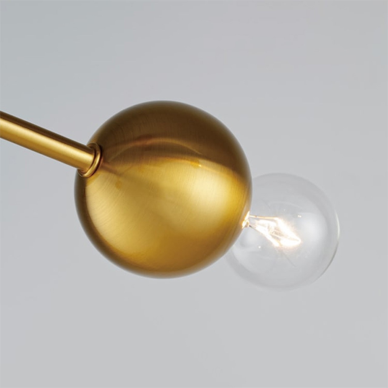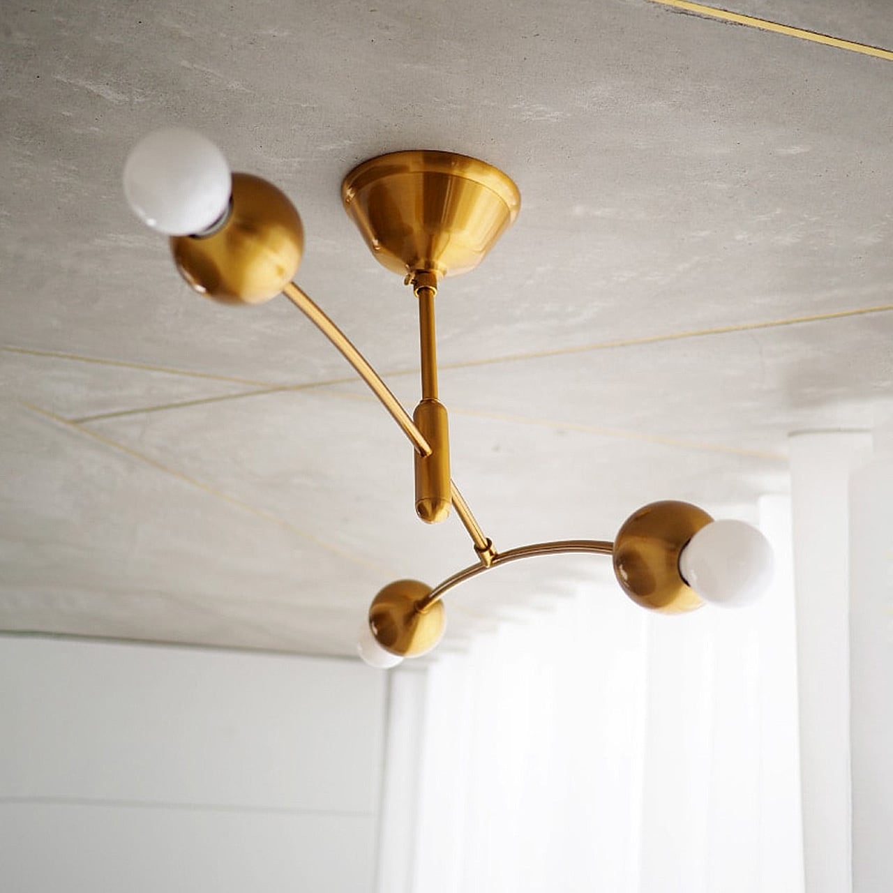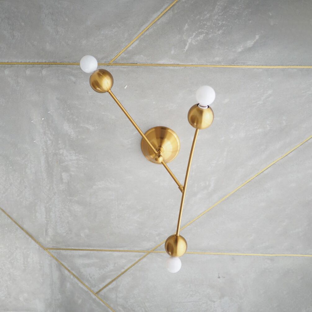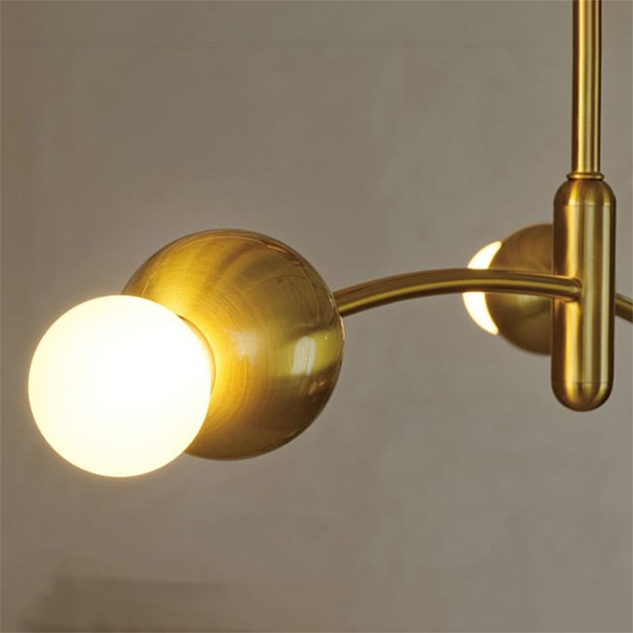 ふわりと浮かぶような浮遊感が楽しい、コンテンポラリーなデザインのシーリングライト。弧を描く2本のアームの先端に球状のソケットと電球が連なる姿は、まるでモビールのように軽やかです。ワンタッチで取り付けられる手軽さと、コンパクトなサイズ感は多様なライフスタイルに寄り添います。空間を明るく印象付けるゴールドカラーがシンボリックな存在感を放ちます。