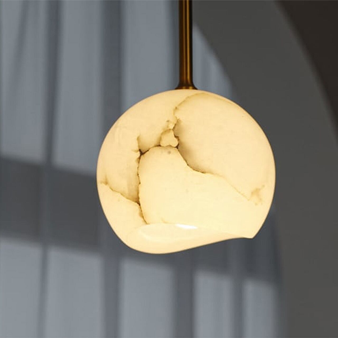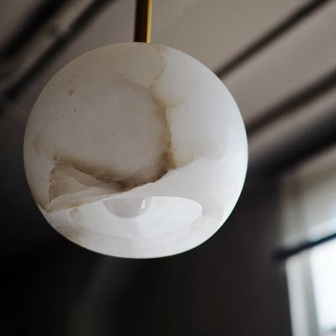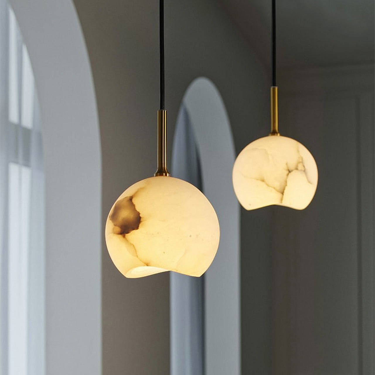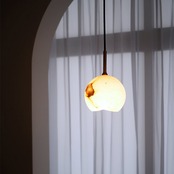 透き通るような白さを持つ鉱物、アラバスターを削り出して作ったペンダントライト。滑らかに研磨された外側とは対照的に、内側は堀削の跡をあえて残しています。裾には流れるようなウェーブを施すことで、モダンかつプリミティブな表情が堪能いただけます。自然が作る唯一無二のマーブル模様を浮かべながら、月のように朧げな光を放ちます。
