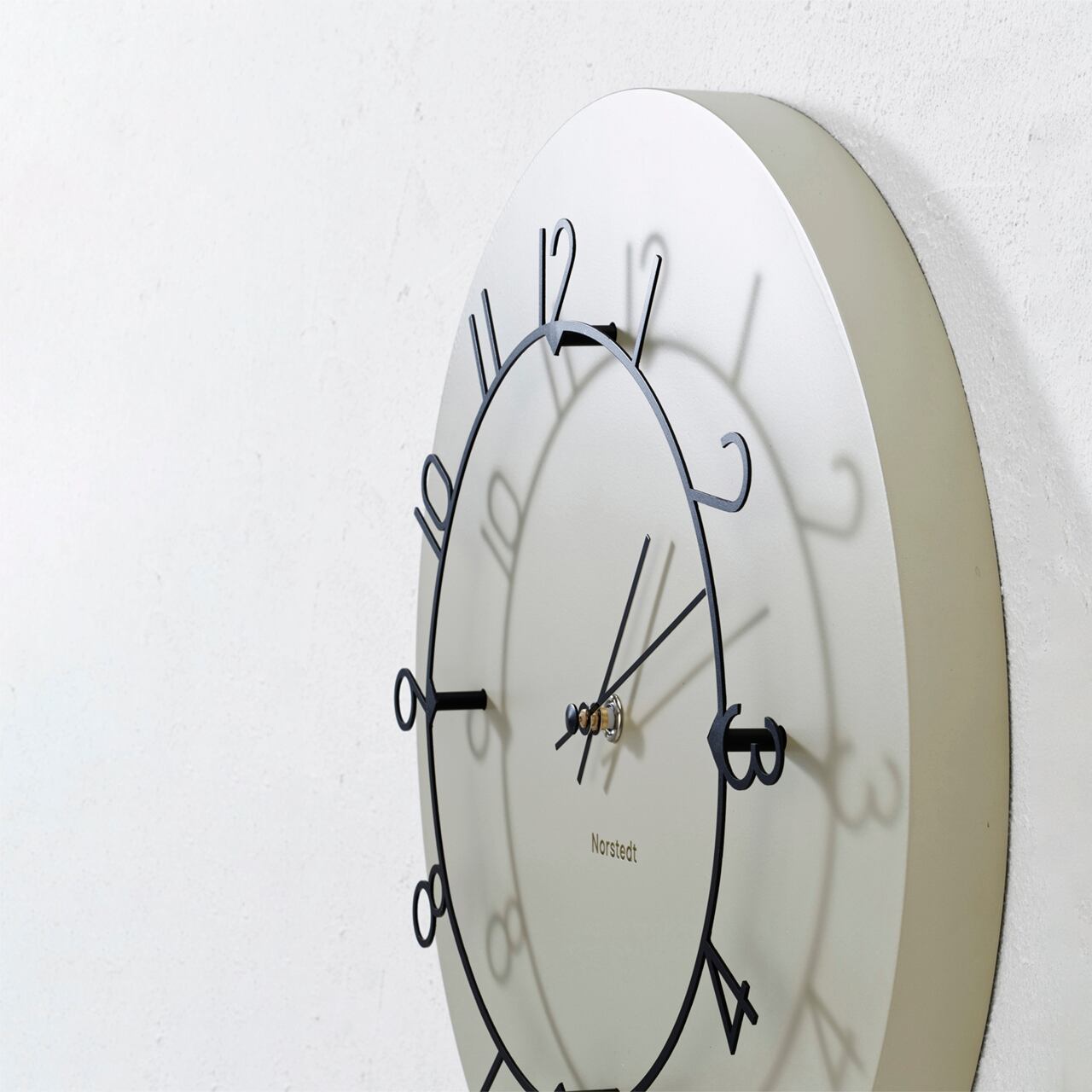文字盤から浮かせたスチールの数字がクラシカルなデザインのウォールクロック。光の差す方向矢見る角度によって表情が変化する個性的なデザインです。薄いスチールの板から切り出し、細く仕上げた数字。その数字と針が引き立つよう、フラットな文字盤はツヤのないマットに仕上げました。ミニマルでコントラストの高いルックスがスタイリッシュな高級感を感じさせます。秒針の音がしない無音タイプのムーブメントを使用しているので、寝室などの静かな場所でも気兼ねなくお使いいただけます。