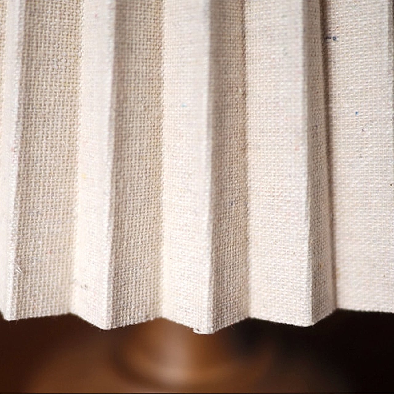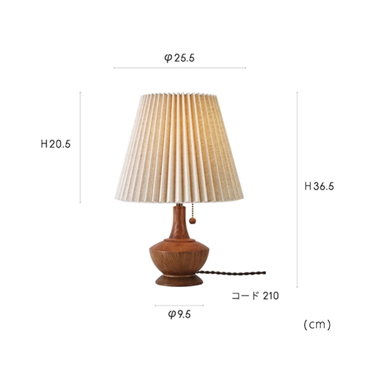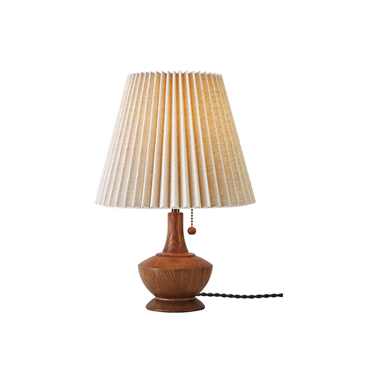 陰影のあるプリーツ状のファブリックセードが柔らかな明かりを灯すナチュラルなテーブルライト。北欧のビンテージ家具をモチーフにアールを取り入れたウッドベース、プルスイッチの先端にあしらわれたウッドボールがぬくもりを感じさせます。プリーツセードが生み出す陰影がベッドサイドやテーブルをやさしく包み込みます。