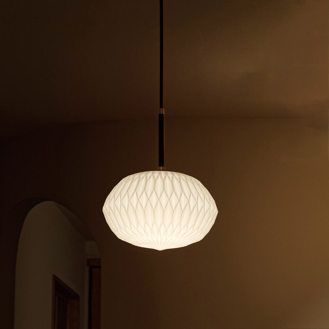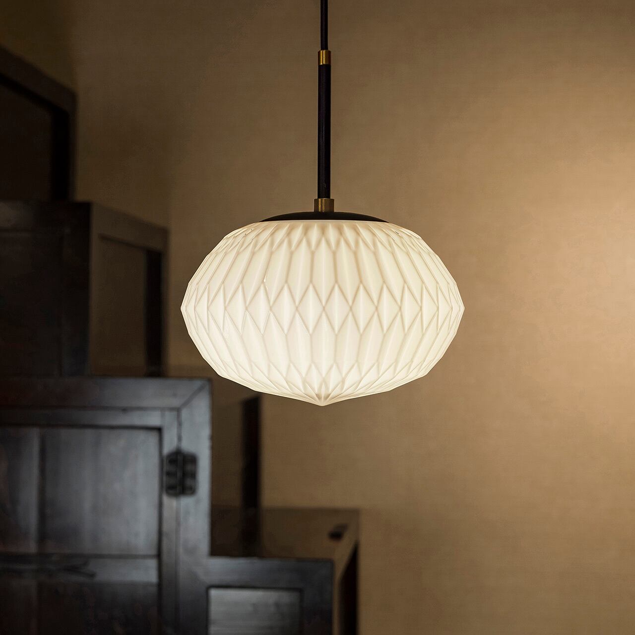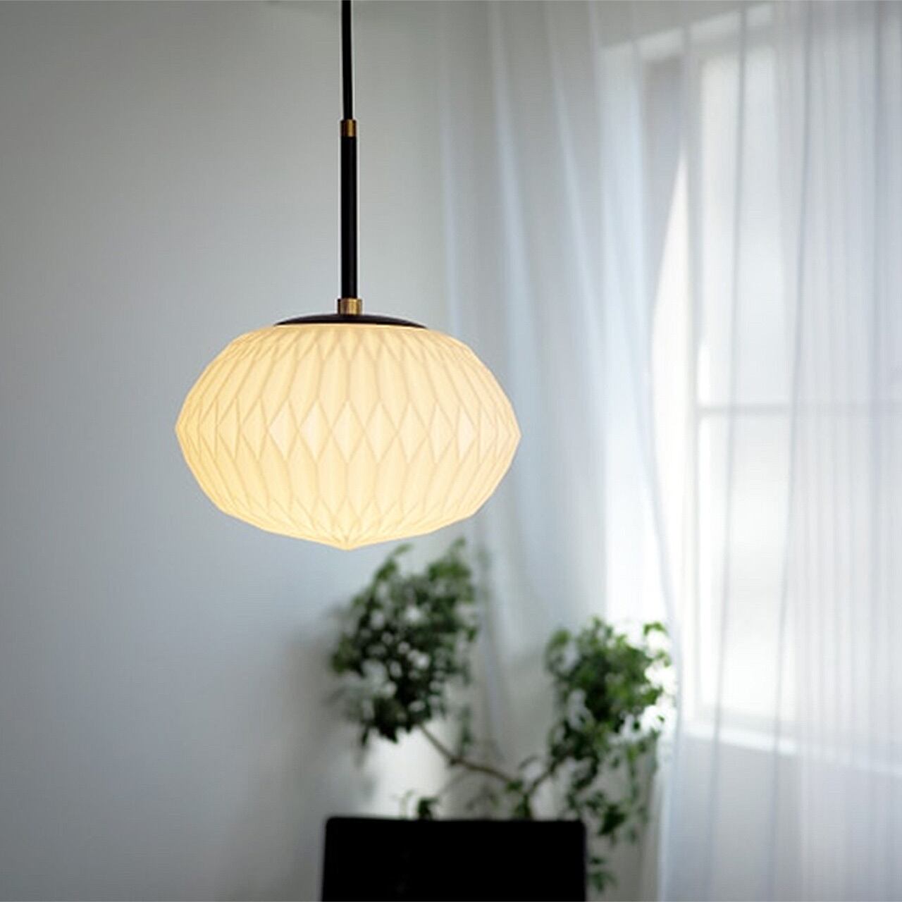 折り紙のような凹凸のあるハンドメイドによるホワイトガラスが柔らかな陰影を描く、モダンなペンダントライト。ボリュームのあるガラスセードを引き立てる無駄を削ぎ落したマットブラックのソケットが、凛としたシルエットを作ります。洋室にはもちろん和室にも合わせられる、シンプルでありながらも洗練されたデザインです。