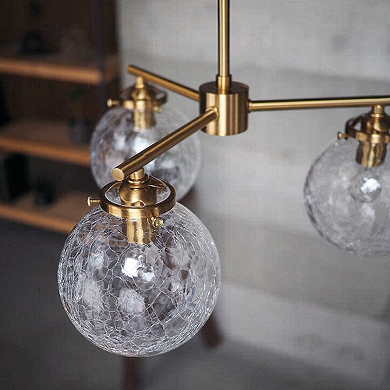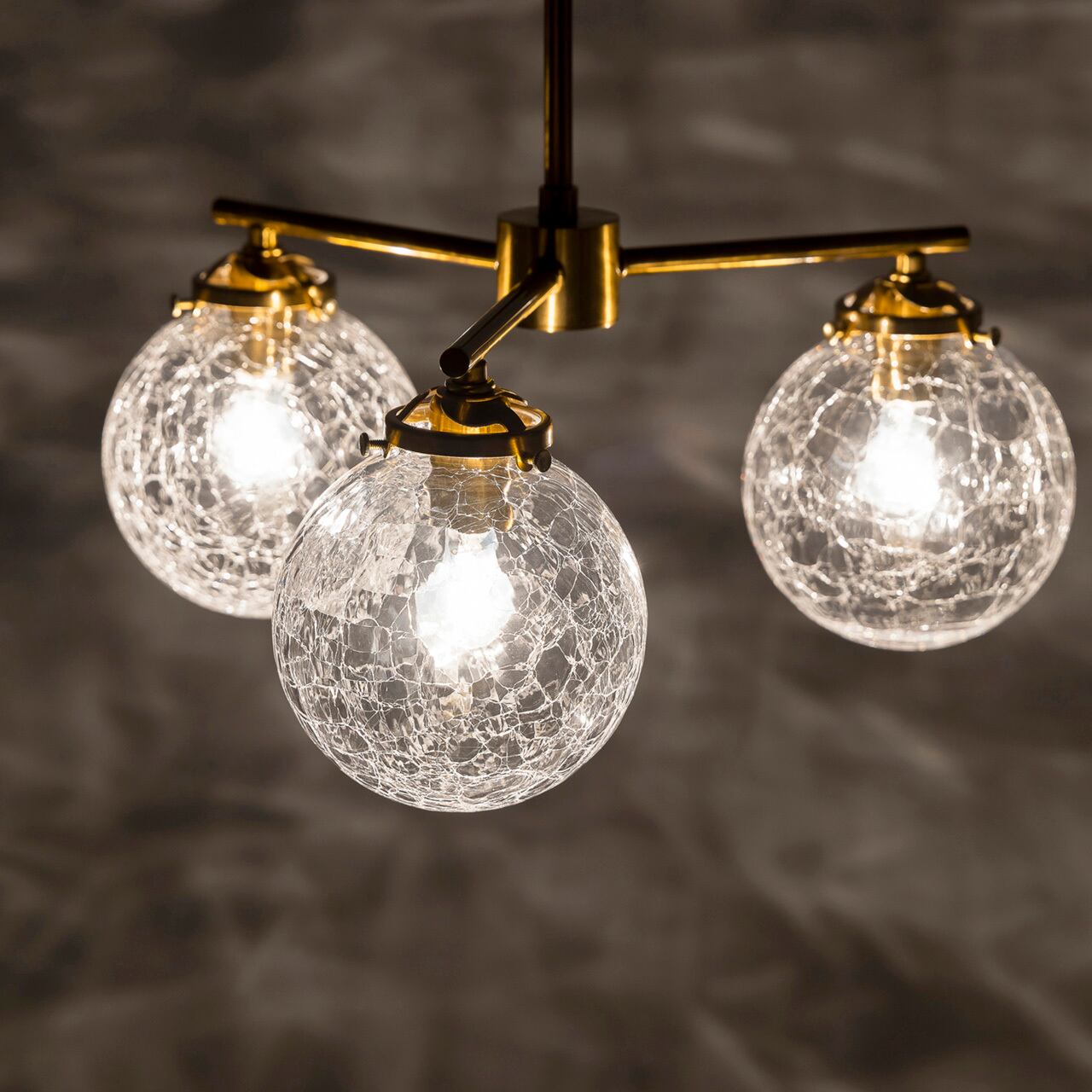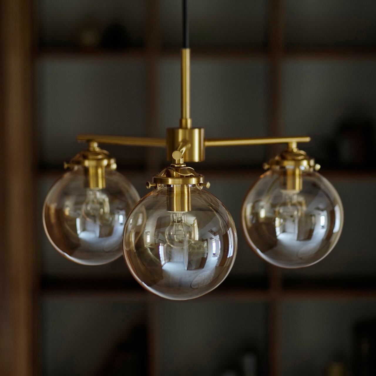 ブライトゴールドのアームにシンプルなガラスセードを合わせたモダンなペンダントライト。無駄な装飾を省きながらも存在感のあるデザインは、幅広いインテリアにマッチします。セードはオーロラのように煌めく[アンバー]と滑らかな[ホワイト]に、ひび割れ模様の入った[クラック]を加えた3種類をご用意しております。全体の雰囲気は直径14cmのガラスセードが3つ並んだシンプルながらもモダンな印象のデザインです。ミニマルなボディのデザインもゴールドを纏うことで、洗練された高級感が生まれました。アンバーは色付きのシャボン玉のような印象で、透明感と煌めきが共存した美しい佇まいを見せてくれます。柔らかな光で照らしてくれるスタンダードなホワイトは、光源が直接目に入らず優しい印象です。クラックタイプは点灯させると不規則な影模様がふわりと広がり、幻想的な雰囲気に包まれます。点灯させた時だけでなく、消灯時にも美しいシルエットをお楽しみいただけます。シンプルでコーディネイトしやすい、飽きのこないスタンダードなデザインで、リビングやダイニングにおすすめの光量です。