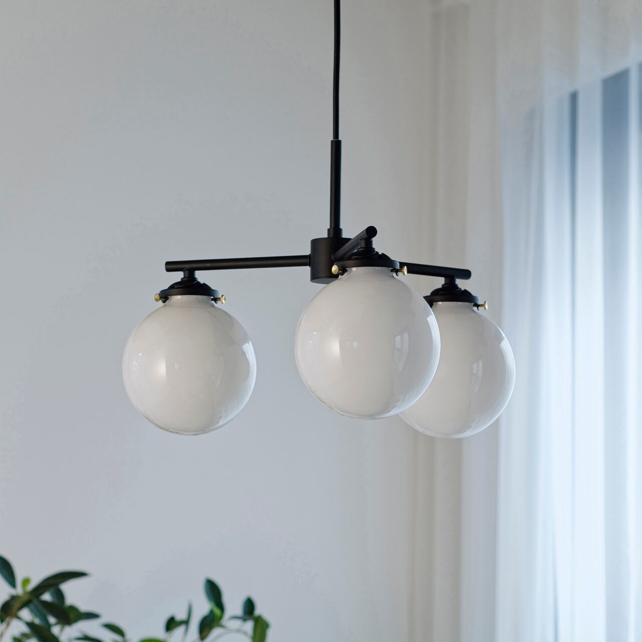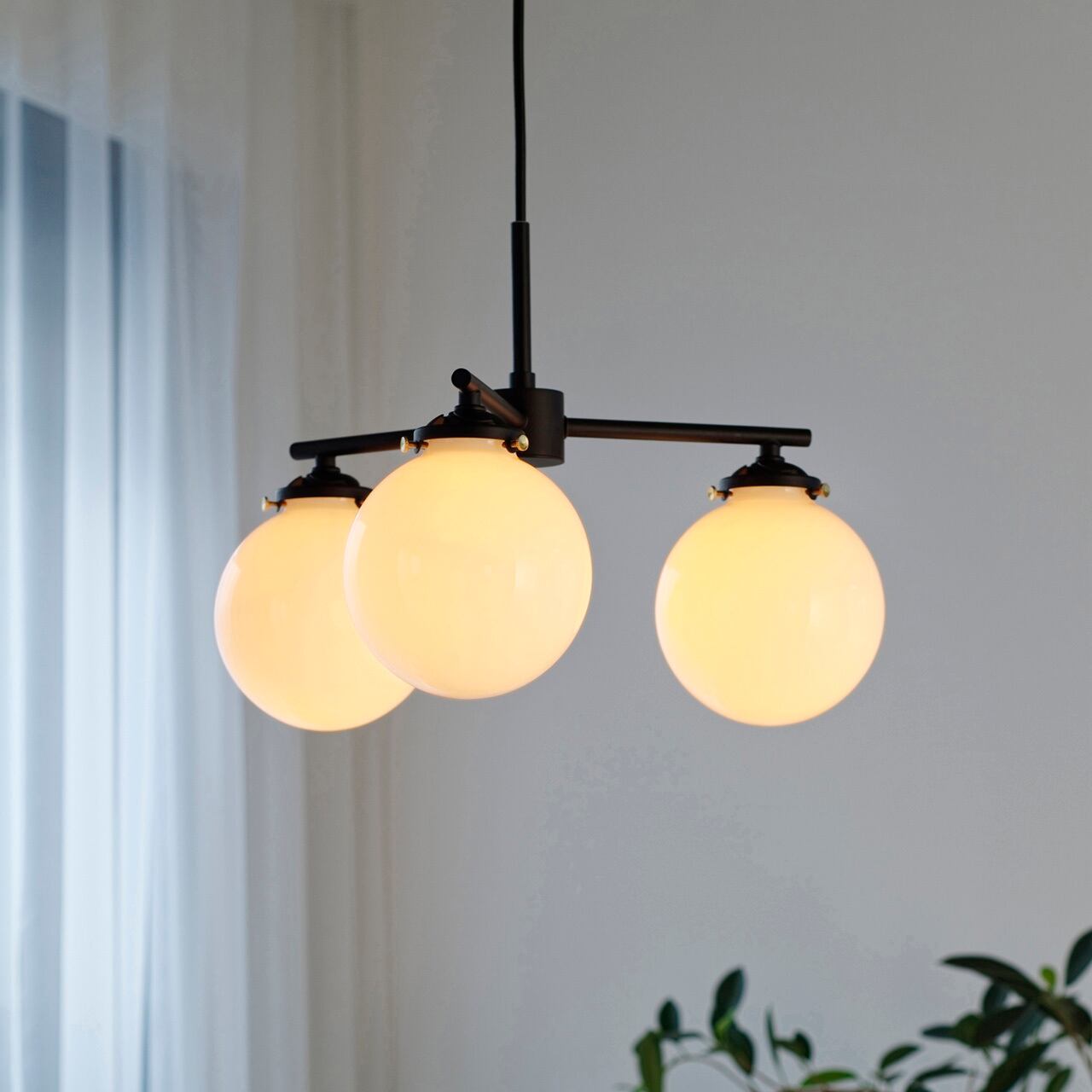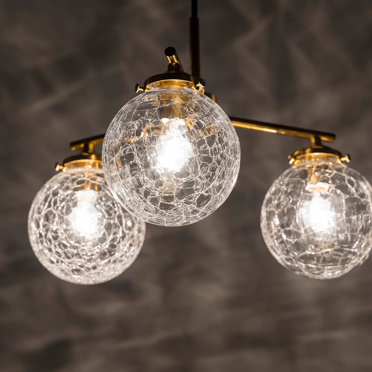 ブライトゴールドのアームにシンプルなガラスセードを合わせたモダンなペンダントライト。無駄な装飾を省きながらも存在感のあるデザインは、幅広いインテリアにマッチします。セードはオーロラのように煌めく[アンバー]と滑らかな[ホワイト]に、ひび割れ模様の入った[クラック]を加えた3種類をご用意しております。全体の雰囲気は直径14cmのガラスセードが3つ並んだシンプルながらもモダンな印象のデザインです。ミニマルなボディのデザインもゴールドを纏うことで、洗練された高級感が生まれました。アンバーは色付きのシャボン玉のような印象で、透明感と煌めきが共存した美しい佇まいを見せてくれます。柔らかな光で照らしてくれるスタンダードなホワイトは、光源が直接目に入らず優しい印象です。クラックタイプは点灯させると不規則な影模様がふわりと広がり、幻想的な雰囲気に包まれます。点灯させた時だけでなく、消灯時にも美しいシルエットをお楽しみいただけます。シンプルでコーディネイトしやすい、飽きのこないスタンダードなデザインで、リビングやダイニングにおすすめの光量です。