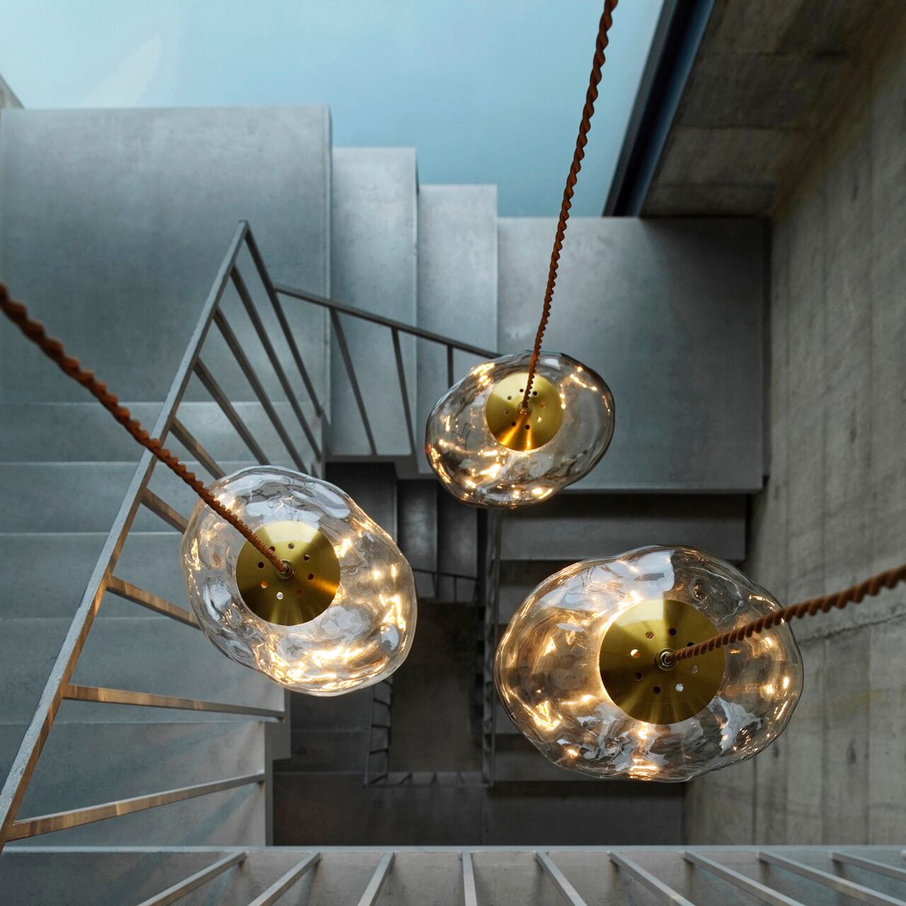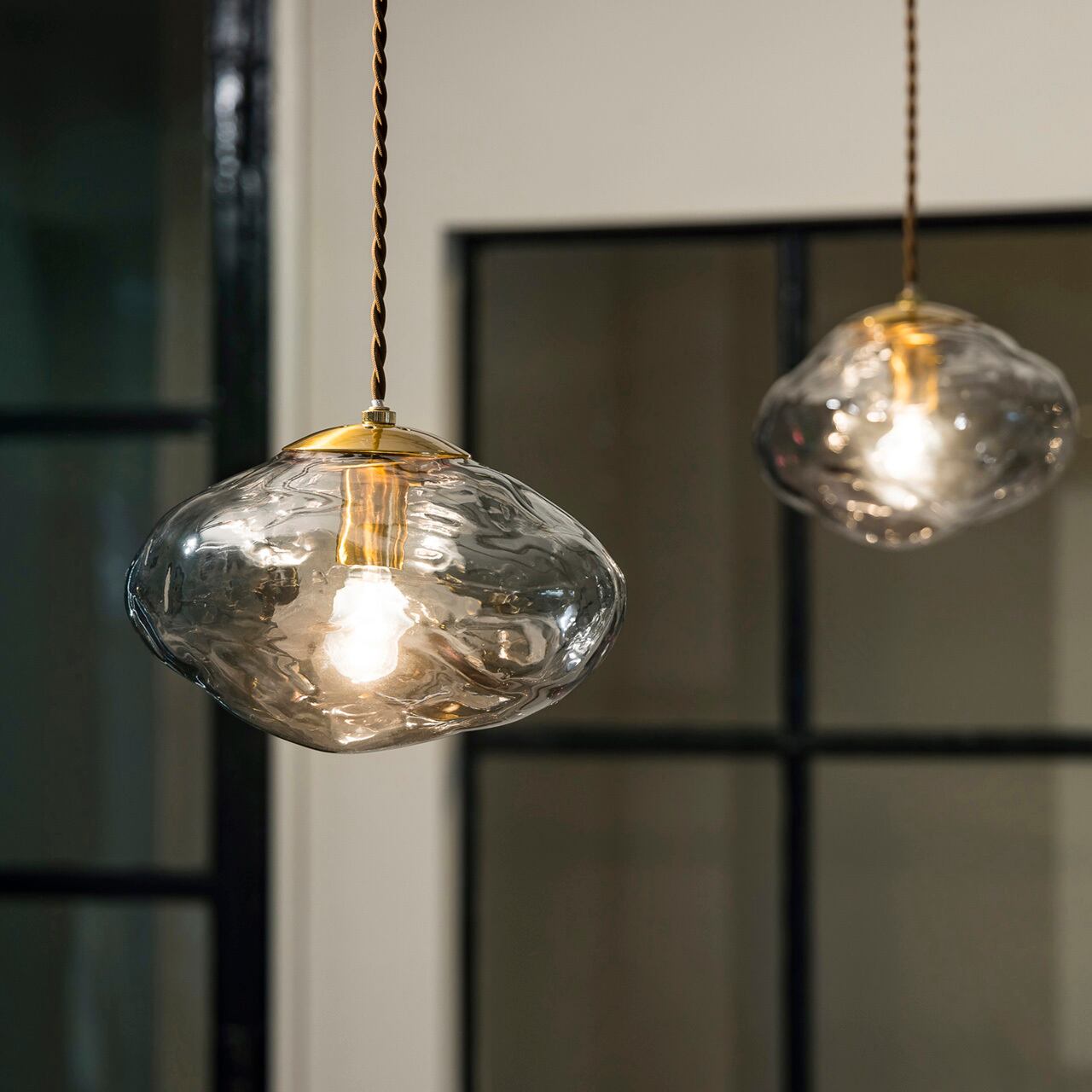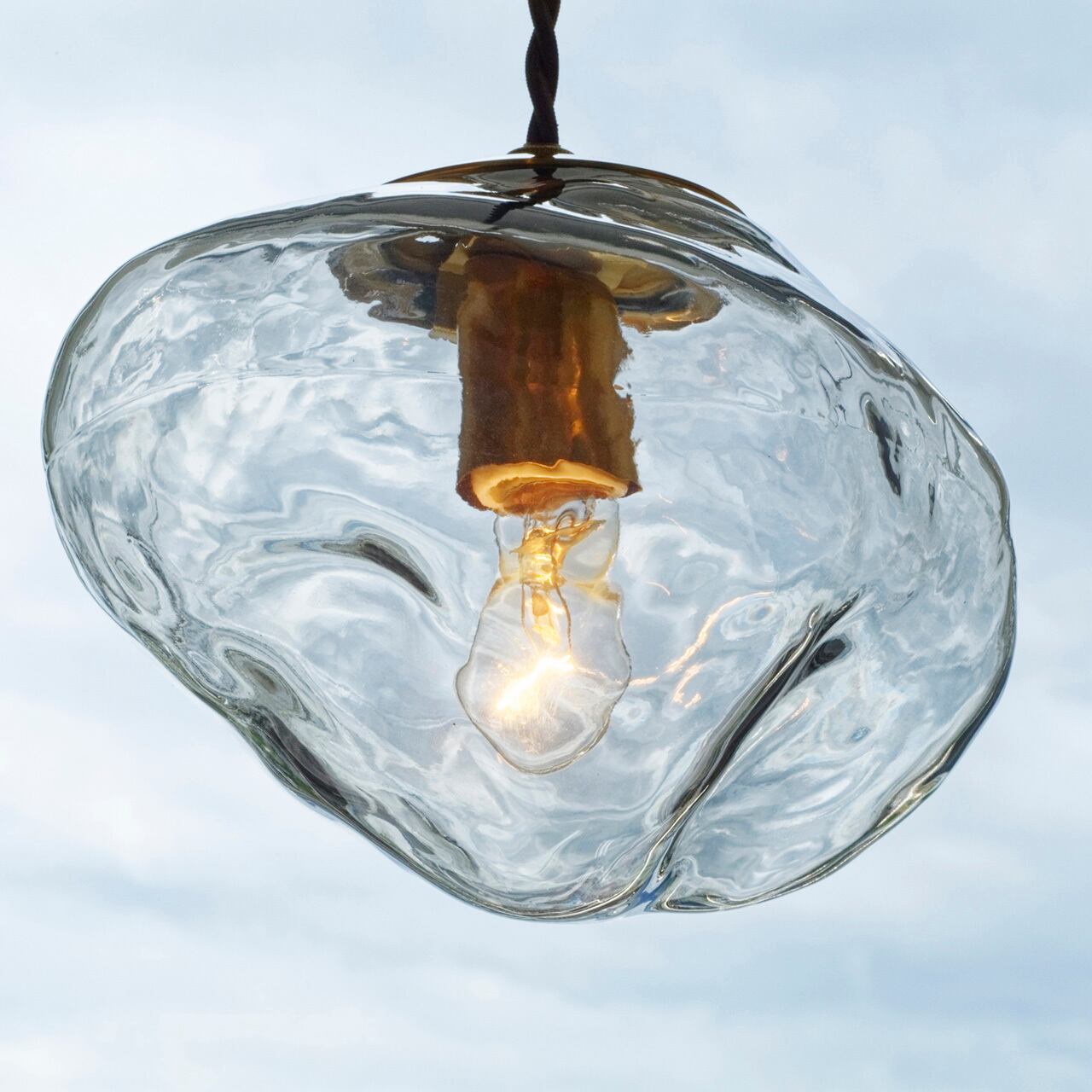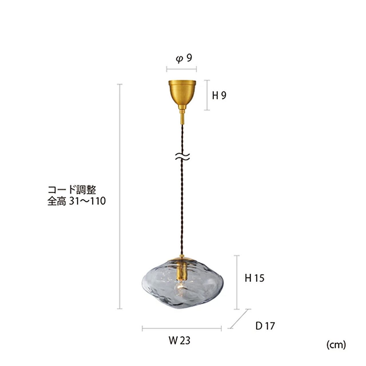 空に浮かぶ雲からインスピレーションを受けデザインされたペンダントライト。ガラスに反射する光の揺らぎが情緒的な雰囲気を醸し出します。うねるような凹みや、波打つようなバランスなど見る角度により微妙に変化するフォルムにこだわりました。点灯時には水中を思わせる美しい影を広げます。ソケットには真鍮を思わせるゴールドカラーを採用し、ブラウンのよりコードがクラフトテイストを盛り上げます。少し厚めに仕上げたガラスセードはハンドメイドならではの素朴なテイストをお楽しみいただけます。トイレや玄関などのスペースから、ダイニングなどで複数並べてシンボリックな空間作りにもおススメです。
