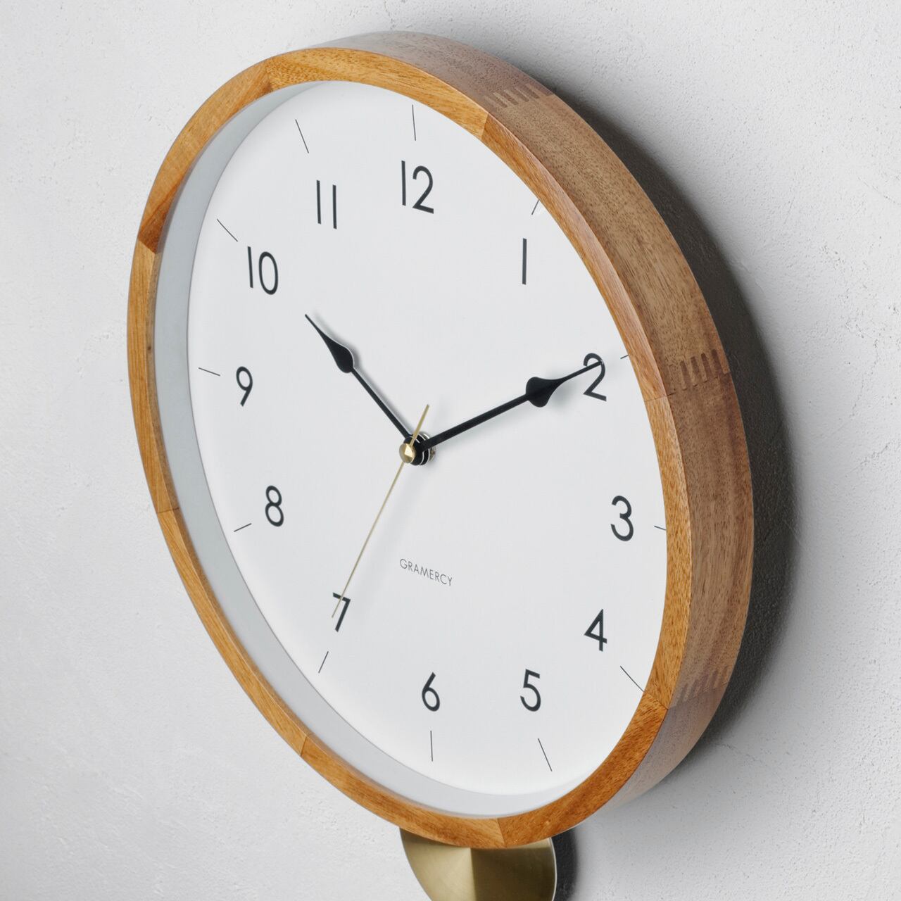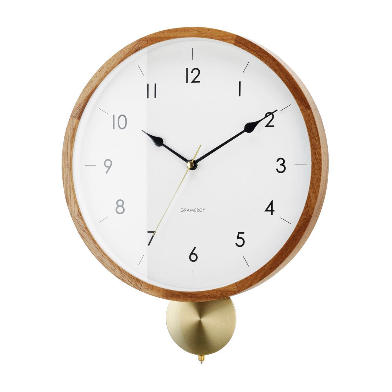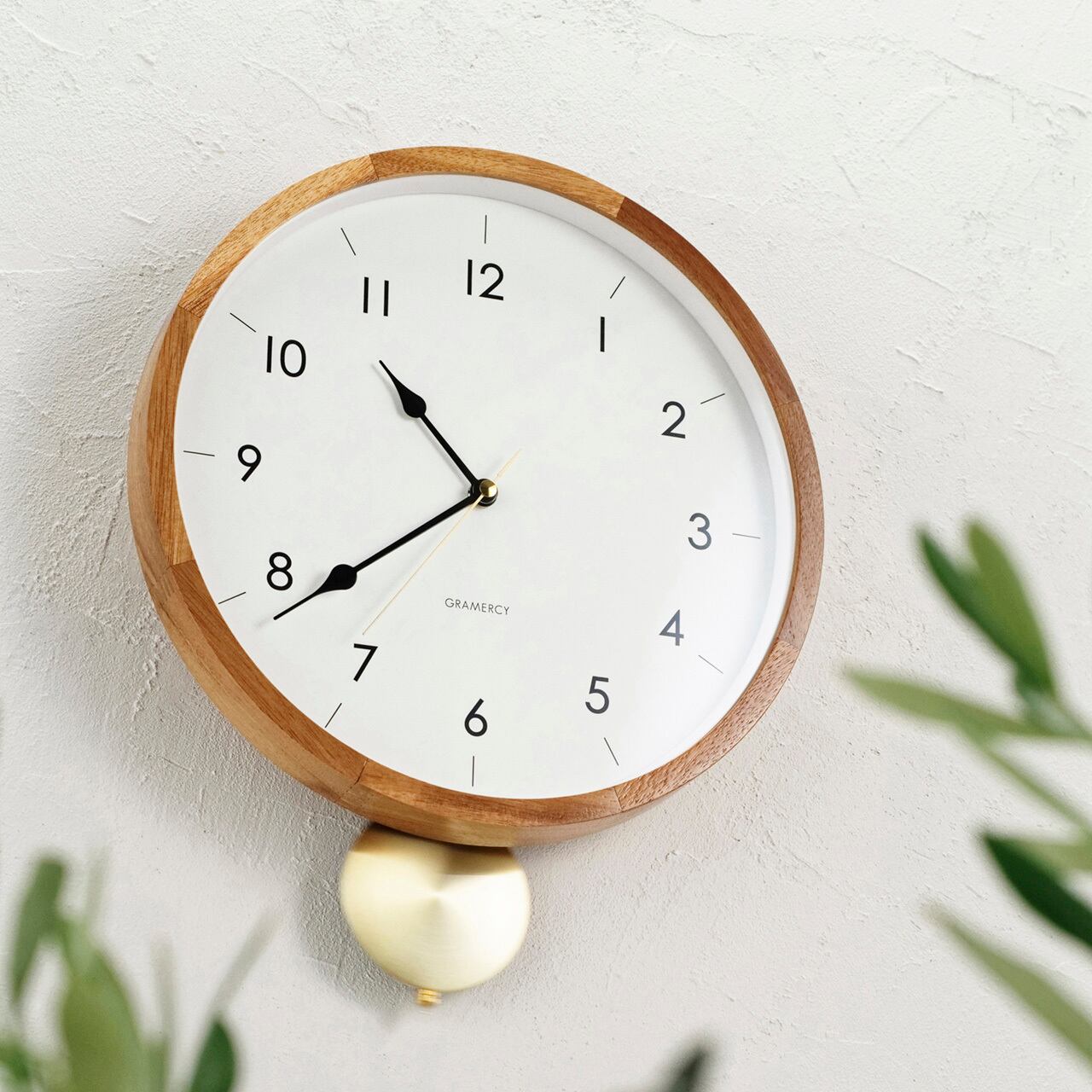 ゴールドの振り子が穏やかな時を刻む、クラシカルなウォールクロック。シンプルな文字盤をあたたかみのあるウッドフレームが囲む、品格を感じられるルックスです。ウッドフレームは美しい木目が特徴的でギザギザの継ぎ目にクラフトテイストを感じます。一方でシンプルにまとめた文字盤には繊細なデザインの針を合わせました。ゴールドの輝きがウッドフレームによく合う丸いアルミ素材の振り子は静かに時を刻むように左右に揺れます。素材のコントラストとシンプルな文字盤の組み合わせが、落ち着いた空間に寄り添います。
