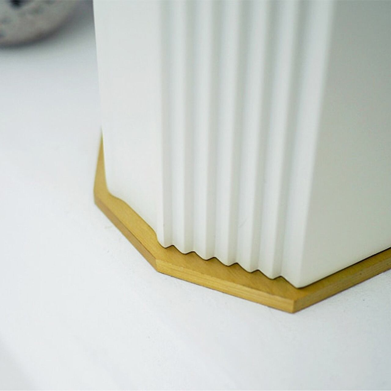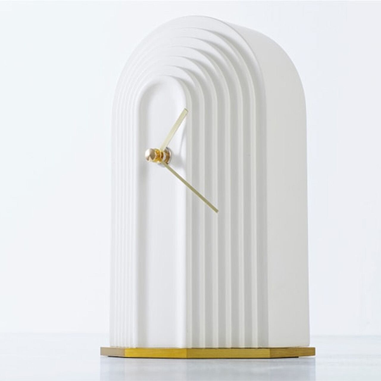 前にせり出してくるような段差が繊細な陰影を生み出すオブジェのようなクロック。手にすると、ずっしりとした重みを感じていただけます。時計本体はツヤのないマットな質感で仕上げ、さらりとした手触りで陶器のような素材感です。アクセントとしてベースと針に真鍮に近い落ち着きのある色合いのゴールドをあしらい、オールホワイトの清楚なデザインに華やかさを添えました。本体に当たる光の強さで影の濃淡も変わるので、いろいろな表情がお楽しみいただけます。