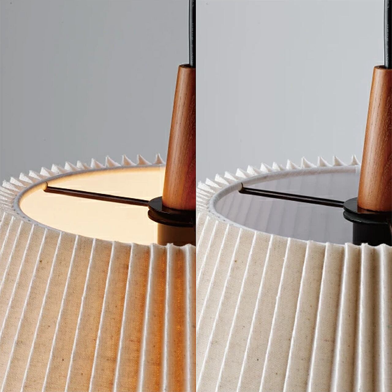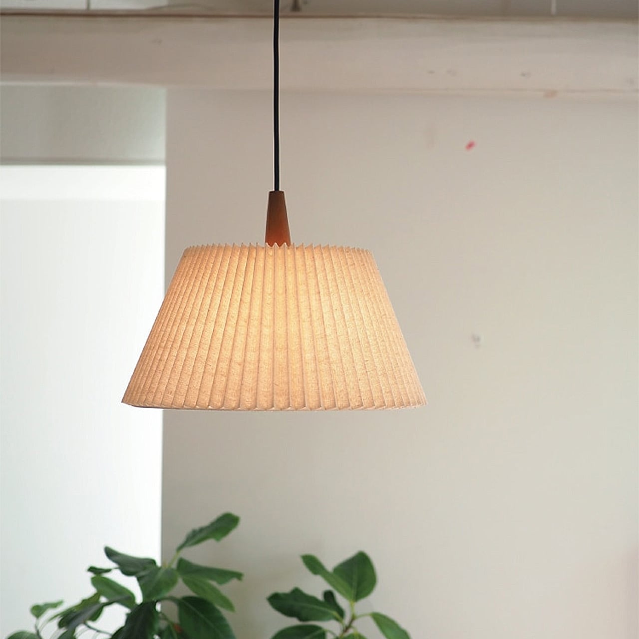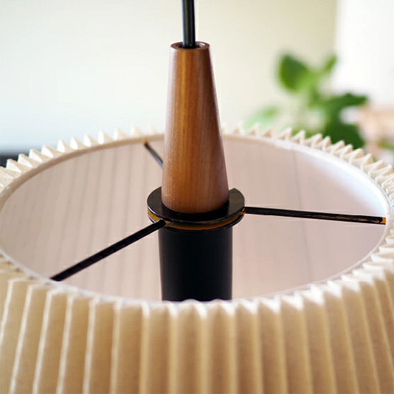 プリーツ状のファブリックセードが柔らかな明かりを灯す、ナチュラルな印象のペンダントライト。セードの上部にあしらわれたウッドパーツがシンプルなシルエットに個性を添えています。プリーツを寄せたファブリックセードの内側にはインナーセードを重ねています。点灯させるとファブリックセードから柔らかな明かりが広がり、消灯時もファブリックとウッドパーツの組み合わせがナチュラルで優しい印象です。人気の北欧テイストからナチュラルコーデまで、リラックスした時間を過ごす場所を優しく照らします。また、上側も大きく開いているので、光が天井側へも広がります。