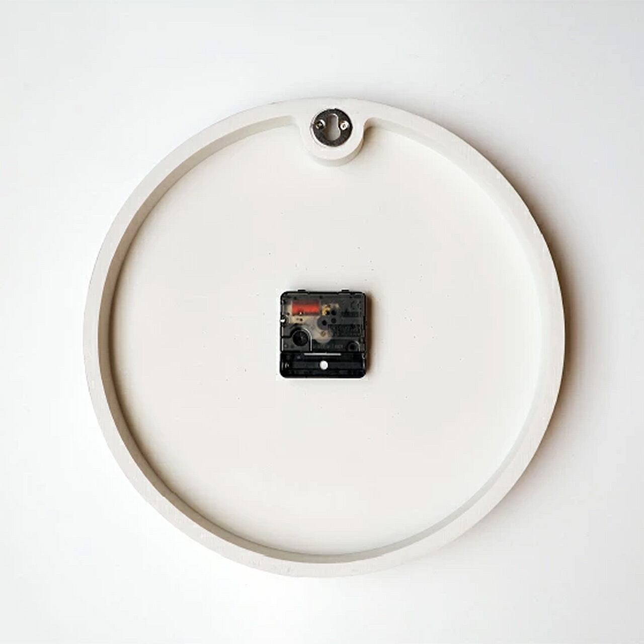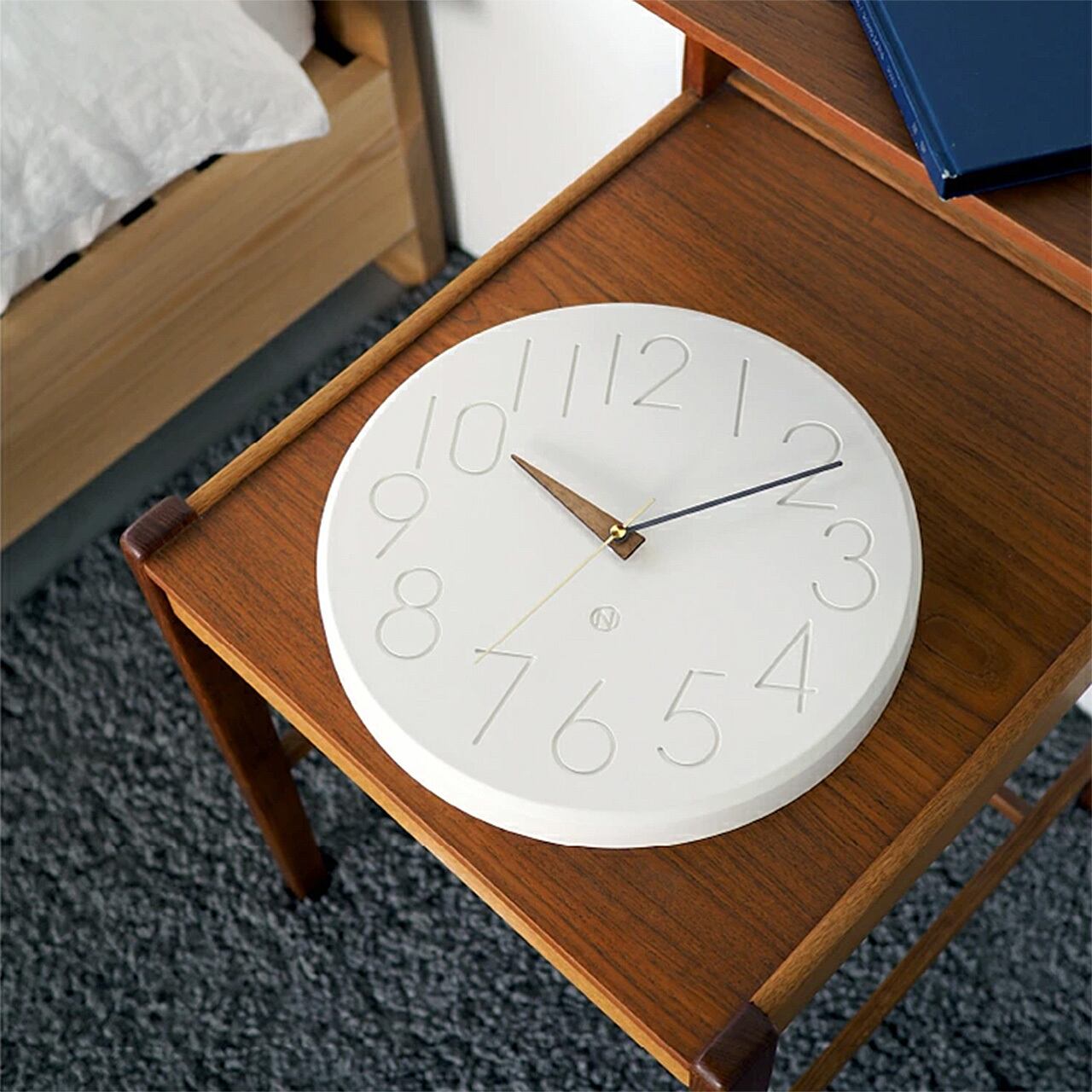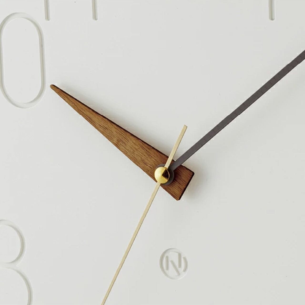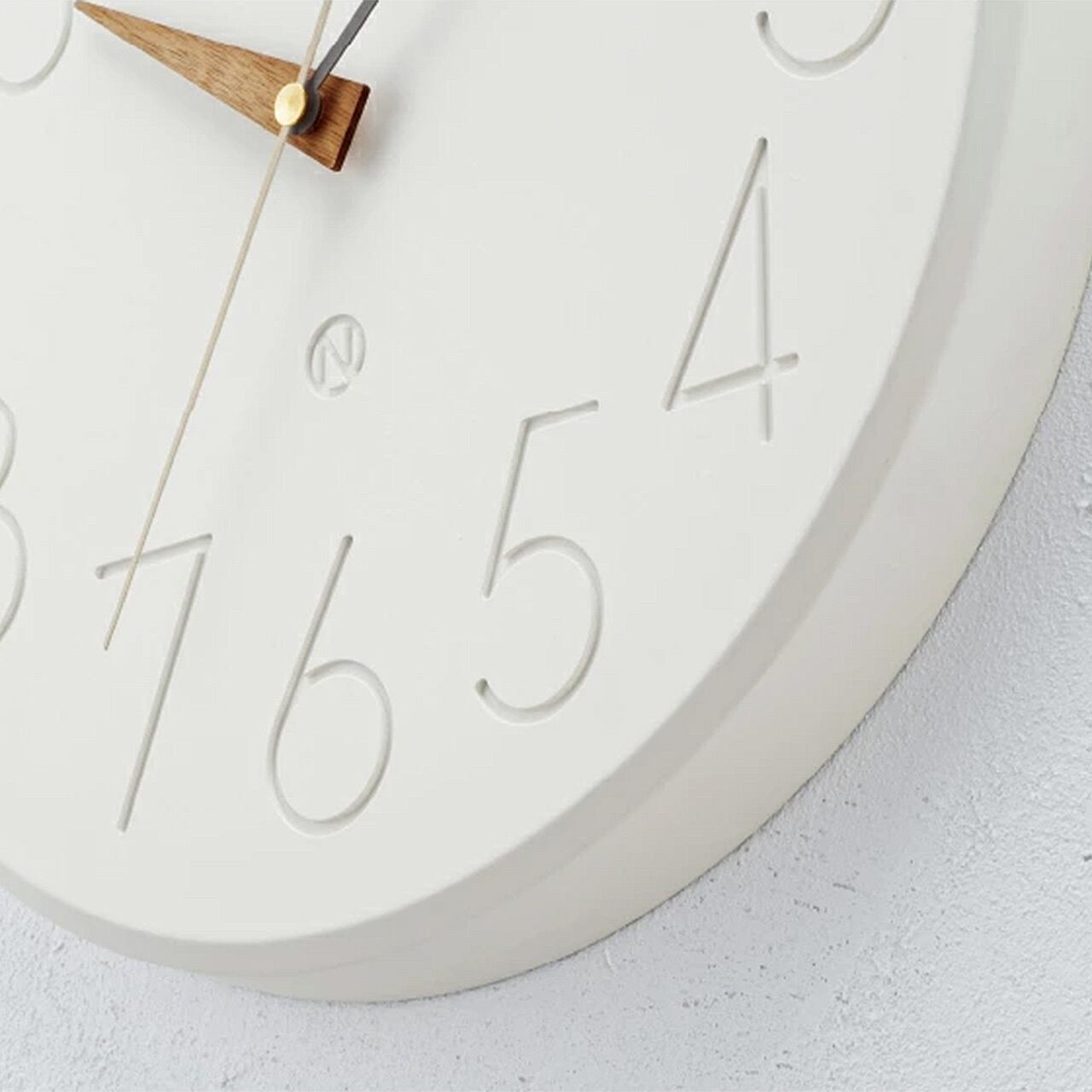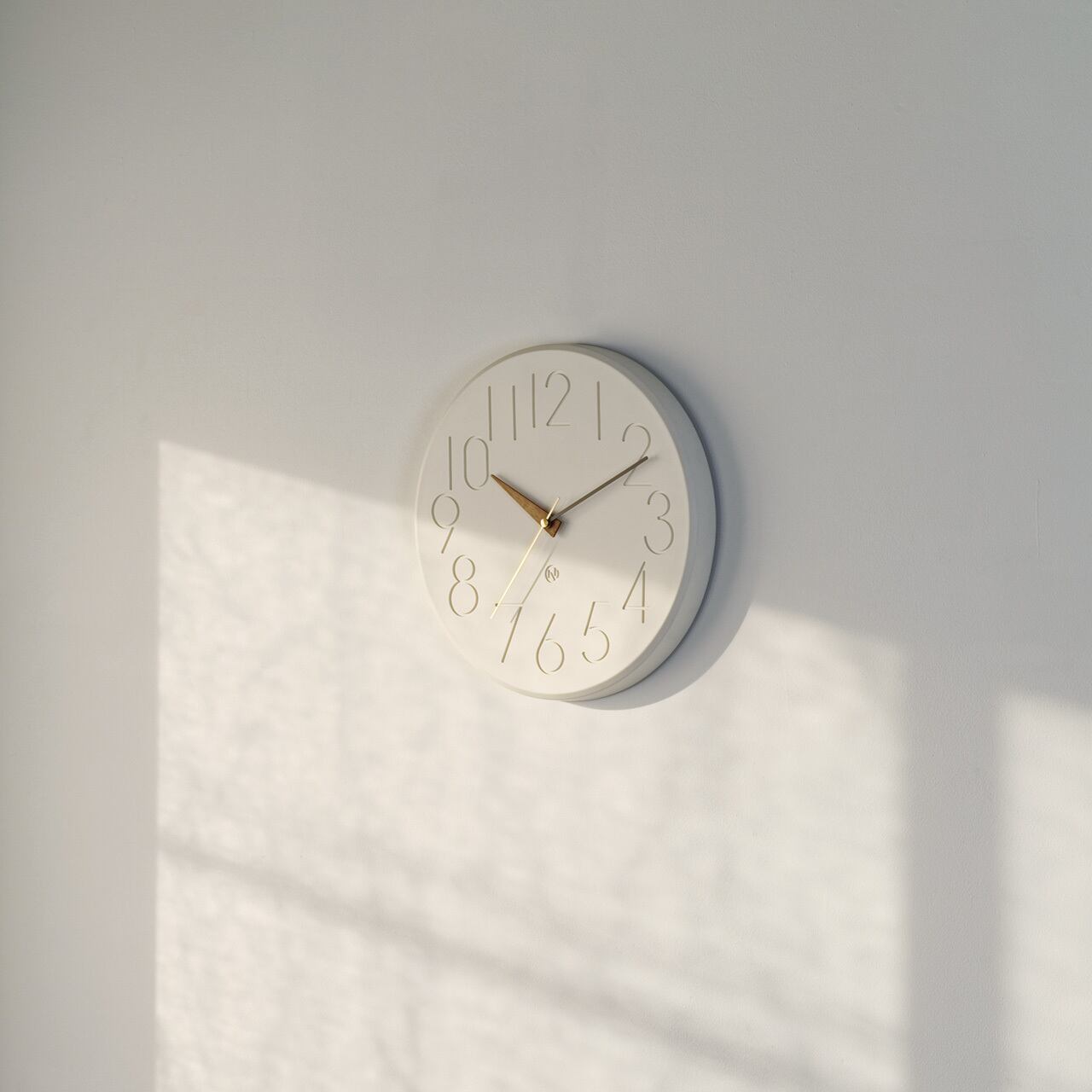 ポリレジンのサラリとした質感の文字盤にウッドの針を合わせたあたたかみのあるウォールクロック。細いラインで数字を彫り込んだ立体感のある文字盤にゴールドの秒針が映える上品なデザインです。数字とロゴの部分は文字盤を凹ませて表現しています。文字盤のエッジも少し落としています。針はシャープな形をしたウッドの短針を合わせました。ゴールドの秒針とブラックの分針との組み合わせがおしゃれです。素材の表情を生かした、主張しすぎないプレーンなデザインが、洗練された存在感を引き立てます。強い光が当たると影が濃くなり、よりはっきりと数字が浮かび上がってくるユニークな側面も。秒針が滑らかに進む無音タイプなので、寝室でも気兼ねなくお使いいただけます。贈り物としてもおすすめです。