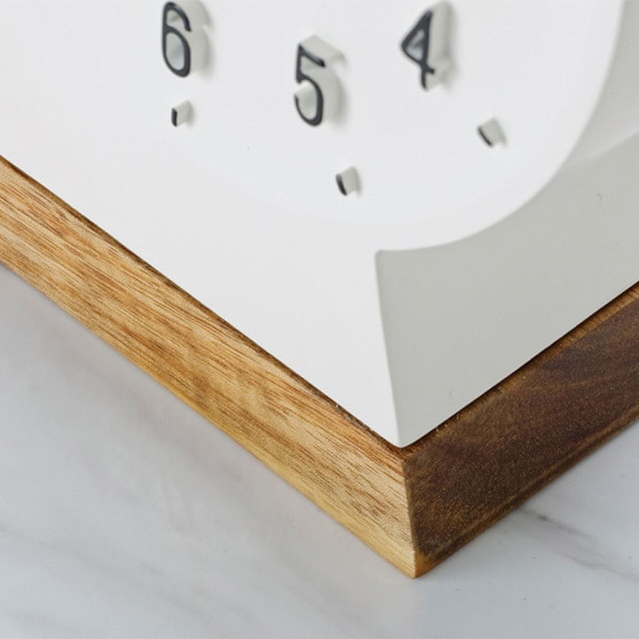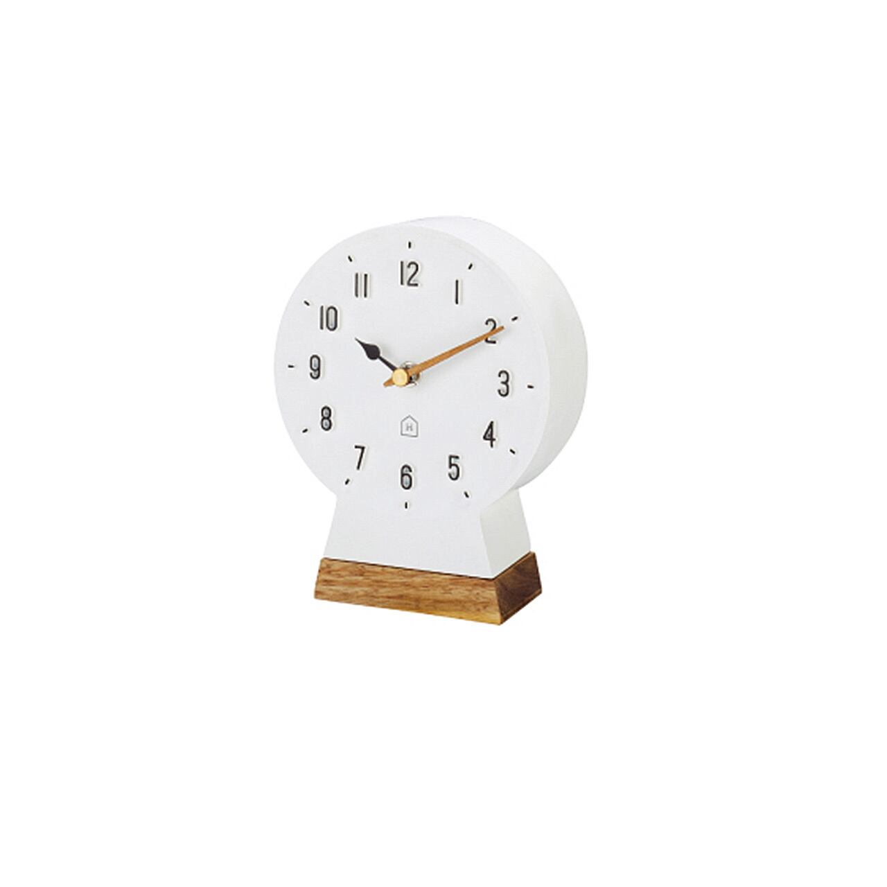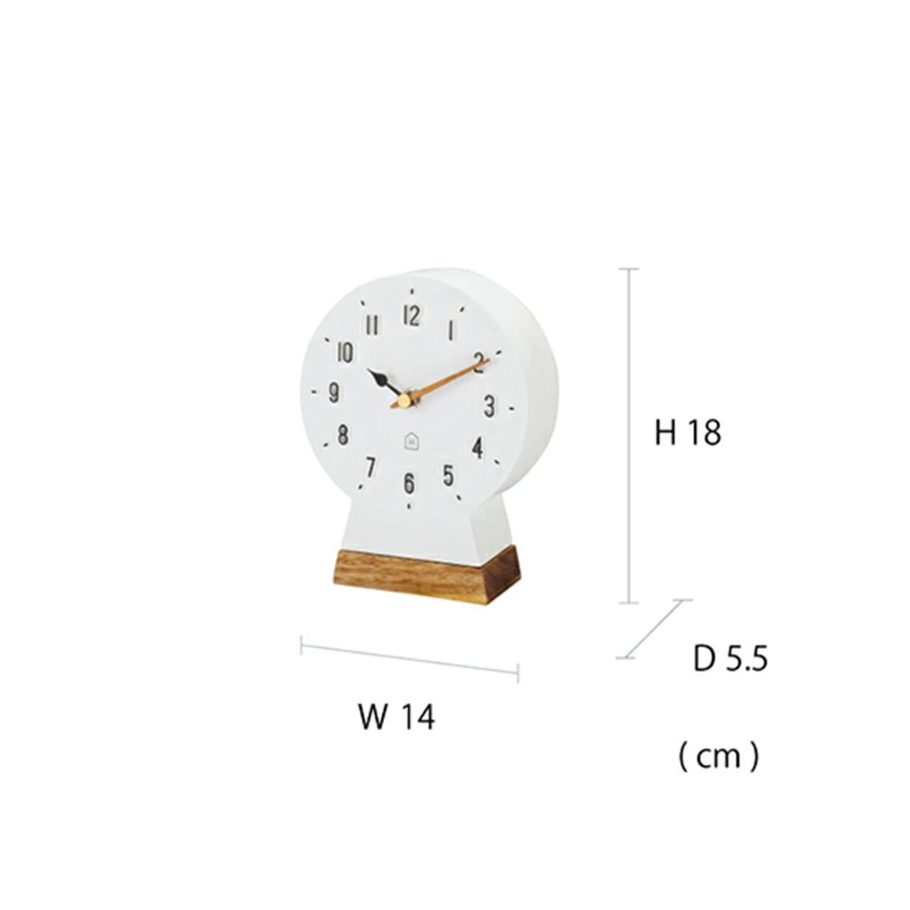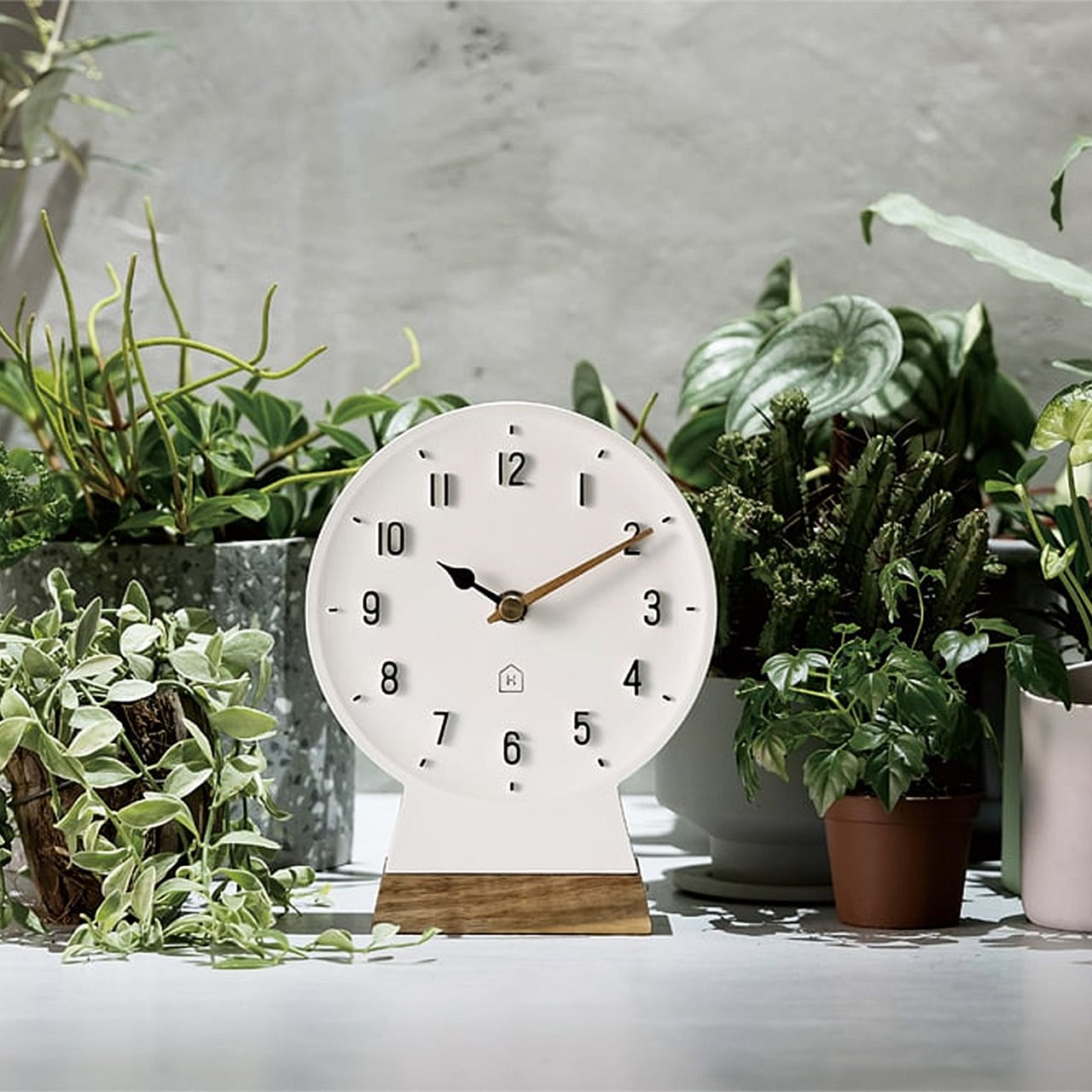 鍵穴をモチーフにしたオブジェのようなデザインのテーブルクロック。さらりとした質感のボディに、ぬくもりのあるウッドのベースと長針を合わせました。ずっしりとした重みに愛着がわきます。玄関やトイレなど、ちょっと時間を確認したい場所にも置きやすいコンパクトなサイズ感です。鍵穴のようなシルエットをそのまま活かしたキュートなフォルムは、見た目以上にずっしりと重く、時計としてだけでなくオブジェとしても楽しめる存在です。さらりとした質感のボディーにオウトツを加えて文字盤にしています。数字は凸、ロゴマークは凹とこだわりました。真っ白な中にブラックの数字がはっきりと見え、視認性もクリアに。土台部分にあしらったウッドベースがナチュラルで温かみを感じさせます。長針にも木を使うことで、よりナチュラルなクラフトテイストが感じられます。秒針がなめらかに進む無音タイプなので、寝室や静かな場所でも気兼ねなくお使いいただけます。人気のミッドセンチュリーから、ナチュラルでアットホームな表情まで。大切な人への贈り物としてもおすすめです。