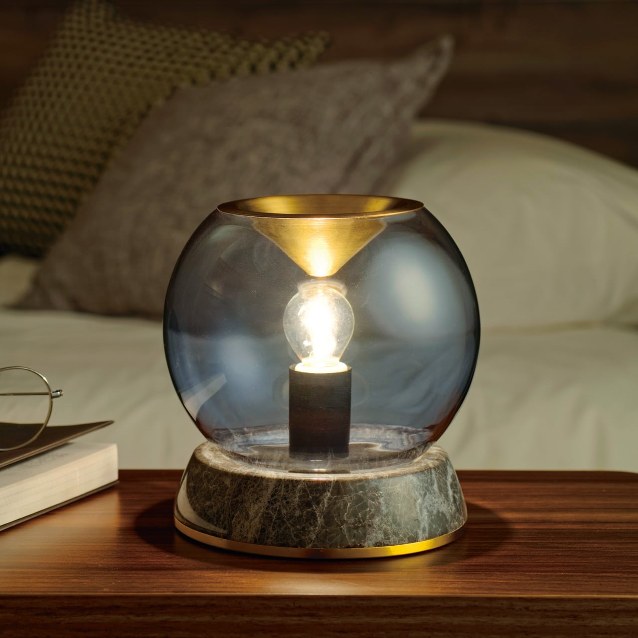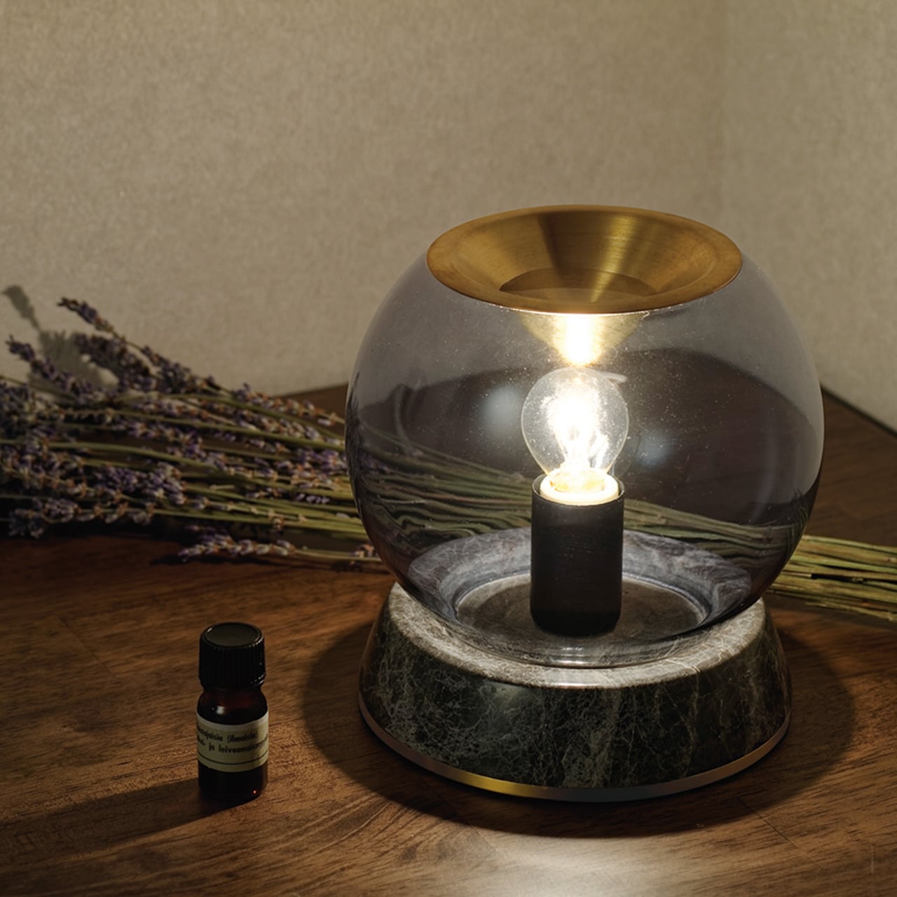 天然大理石のベースにグレーのガラスを合わせたムードのあるテーブルライトです。たおやかな光とアロマの香りが、寝室などのリラックス空間をエモーショナルに演出します。グレートーンの大理石を贅沢に使用しています。1点ずつ模様が異なり、高級感のある印象です。縁に引いたゴールドのラインがアクセントになっています。青みがかったグレーのカラーガラスが落ち着いのあるムードを演出します。リラックスしたい空間におすすめの間接照明です。ガラスセードの上の真鍮製のカップに水とアロマオイルを入れると電球の熱によって香りが広がり、アロマライトとしてもお使いいただけます。アロマライトとしてお使いになられる際はカップに水を張ってください。視覚と嗅覚からリラックスできる空間を演出してくれる頼もしいアイテムです。贈り物としてもおすすめです。