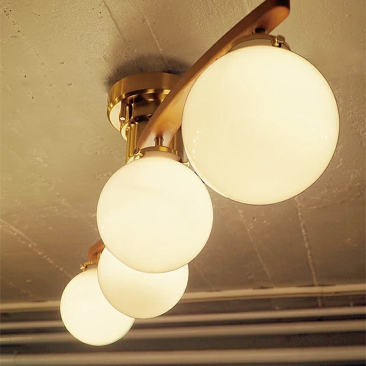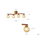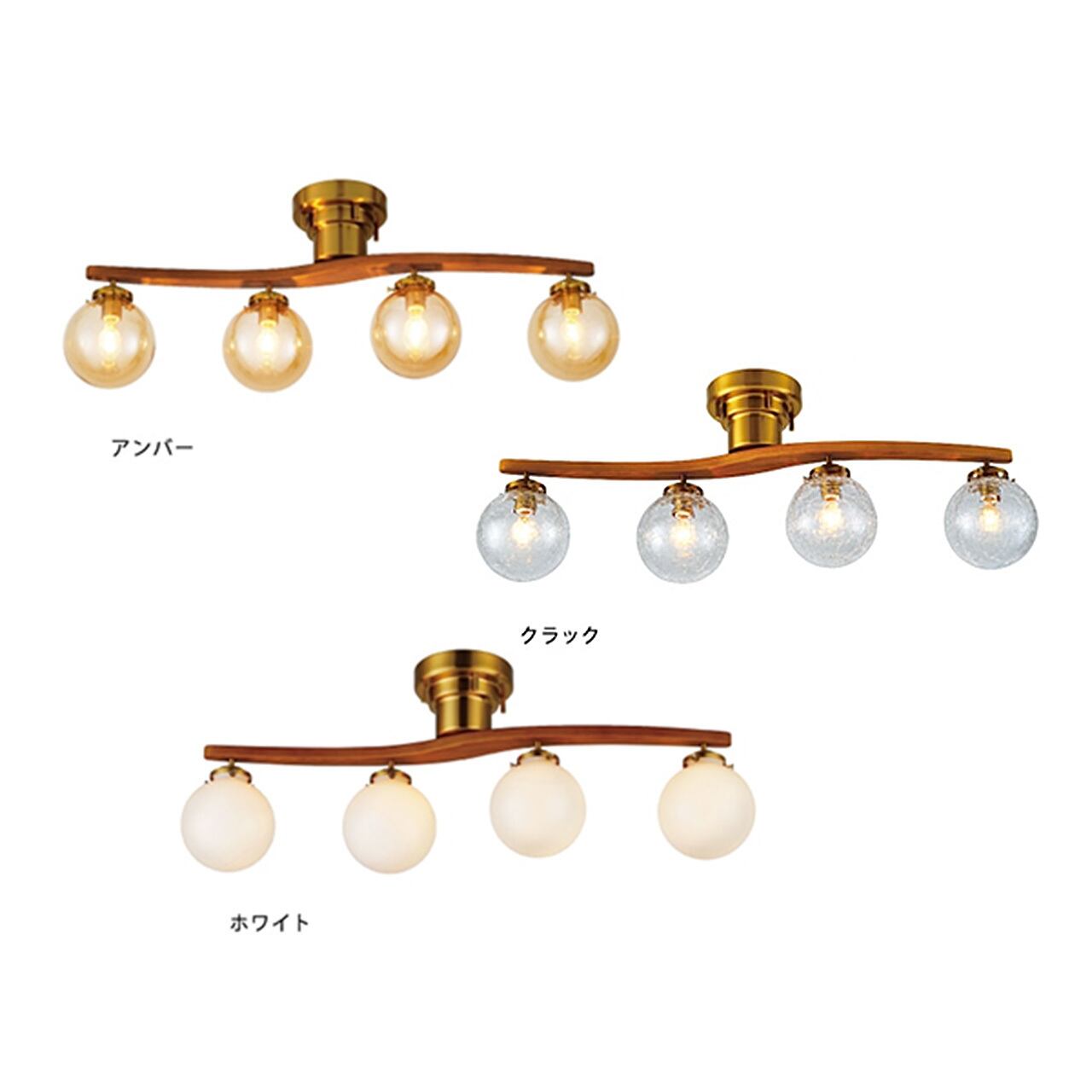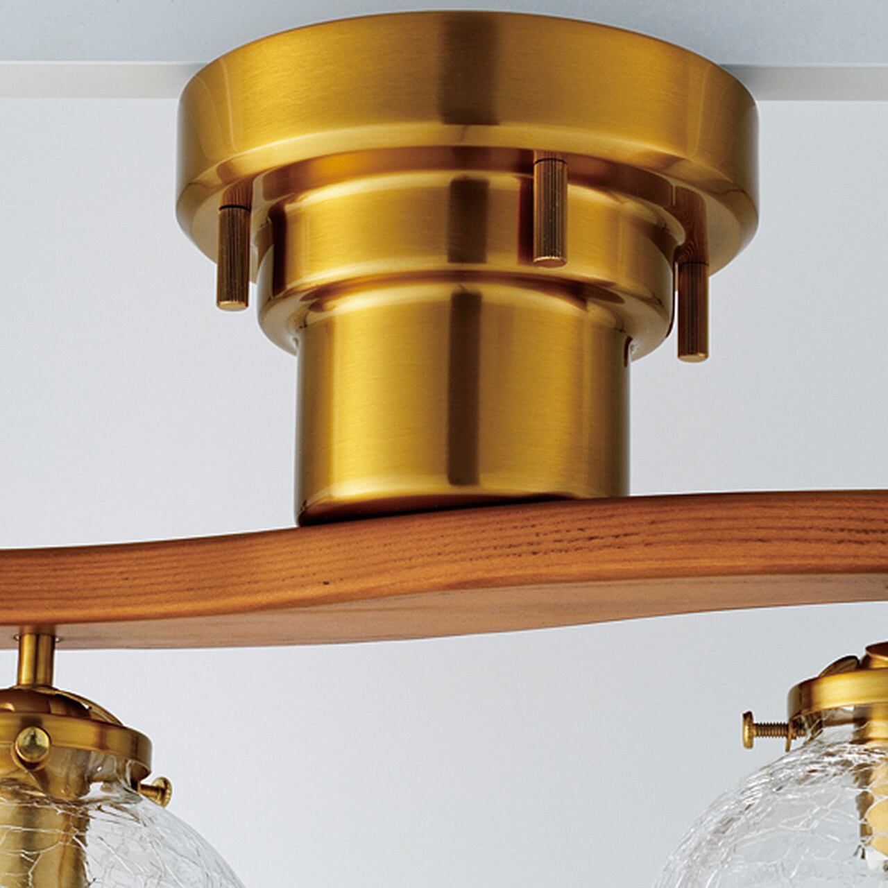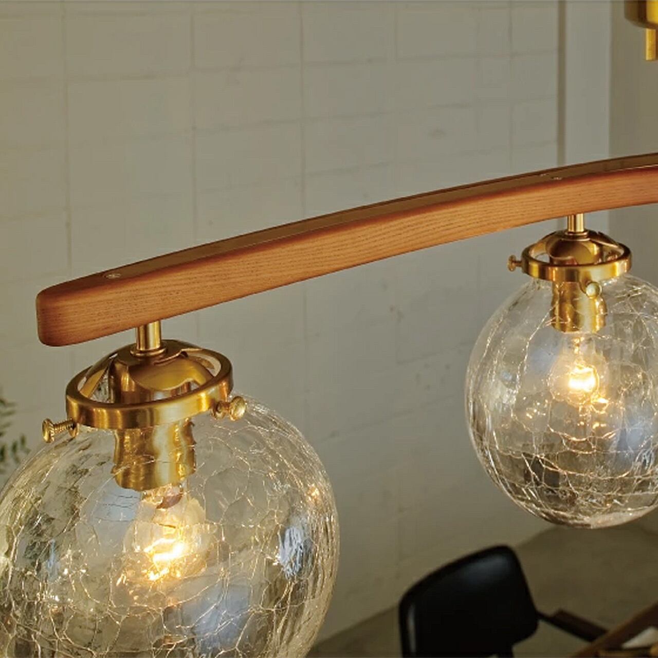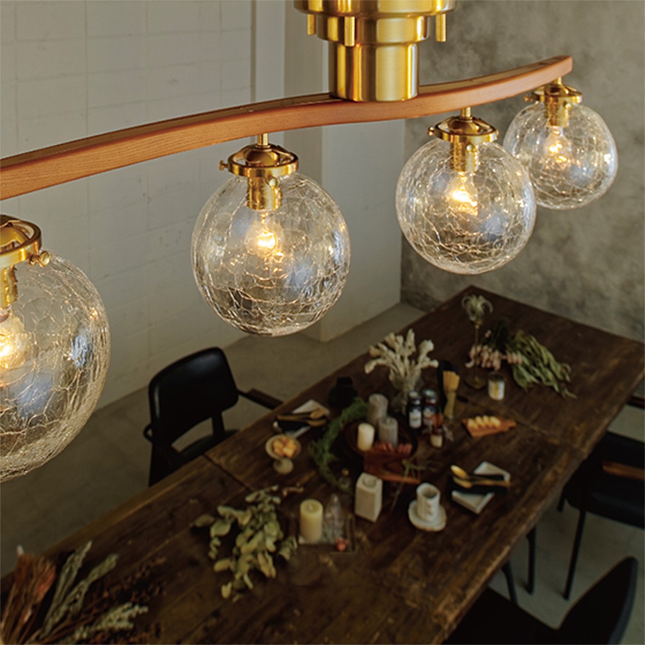 緩やかなカーブを描きながら伸びるウッドアームにボリュームのあるガラスセードを配したシーリングライト。ゴージャスで品格のある空間づくりを演出します。ガラスセードはシンプルなフォルムにエッジの効いた、アンバーとひび割れ加工のクラックをチョイス。アンバーは色がついたシャボン玉のような、透明感ときらめきが共存した美しい仕上がりです。クラックは点灯させると周りに広がる影が楽しめます。本体の支柱になるアームに木を採用しています。角を落とした家具のような丁寧なしつらえが上品で高級感のある印象にアップグレードしてくれます。点灯させたときにぱっと広がるガラスセードの影が幻想的な空間へと導いてくれます。特にクラックガラスのひび割れから広がる光の屈折模様は圧巻です。アクセントになっているスチール部分のゴールドカラーは落ち着いた輝きが全体を大人びた印象へ引き締めます。