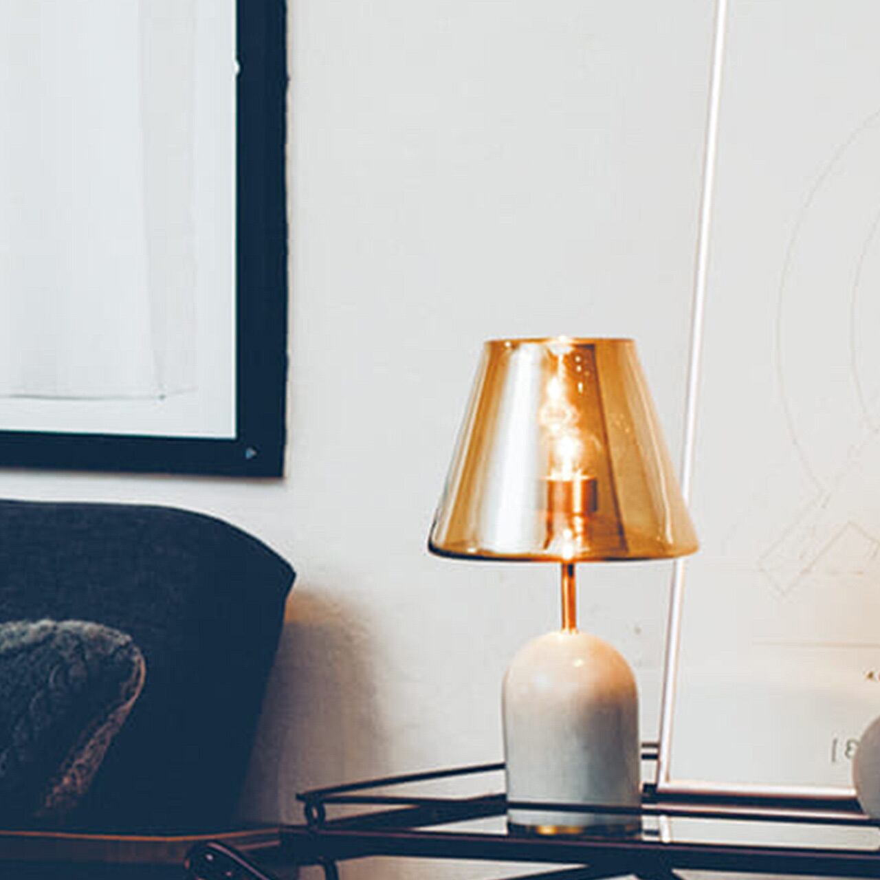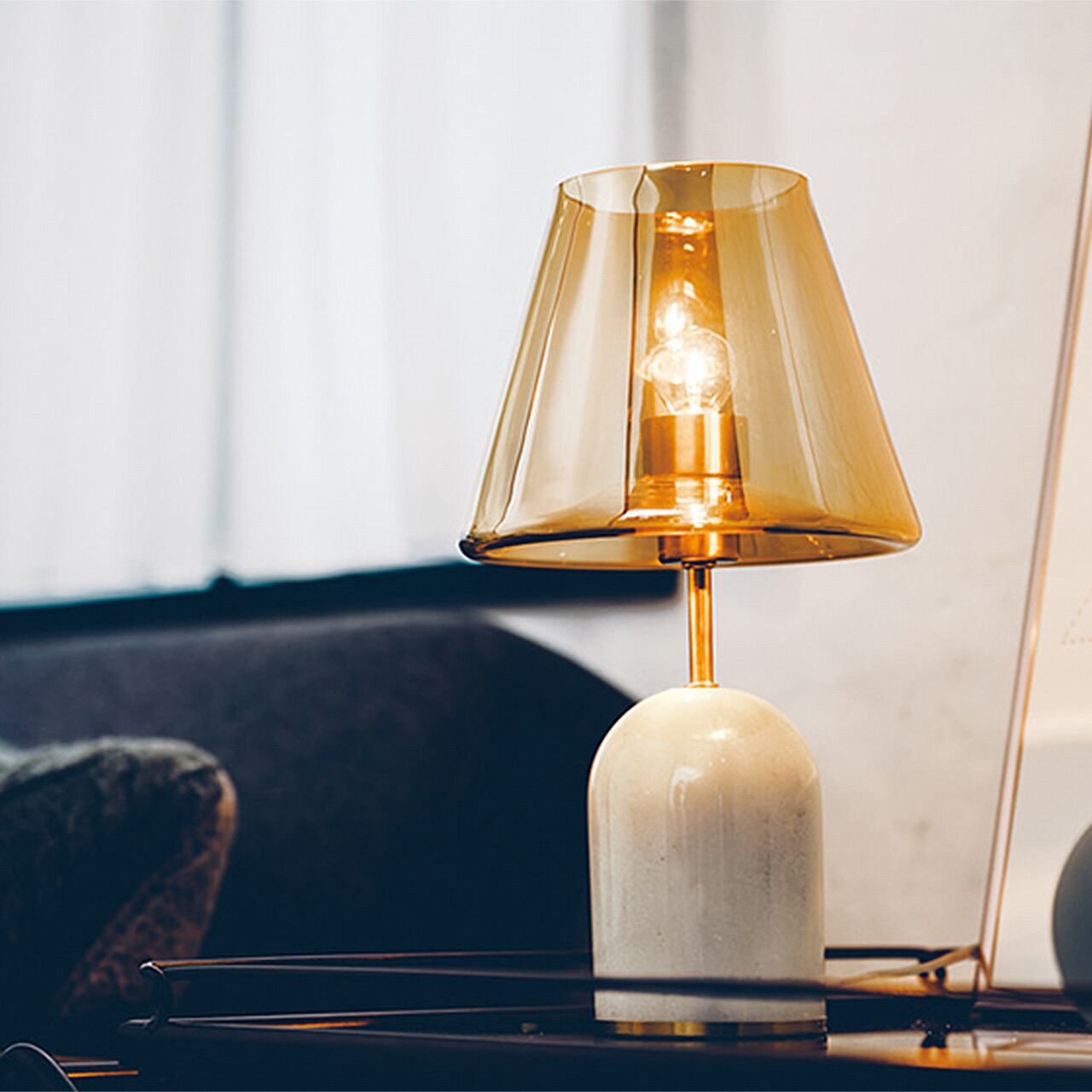 ひとつひとつ色や模様が異なる大理石のベースと蒸着メッキを施したグロッシーな輝きを放つガラスセードの組み合わせが魅力的なテーブルライト。乳白色の中にまだらに入る黒やグレーの模様が高級感と重厚感を示す大理石を取り入れました。柄や色に個体差があるのも特徴です。大理石のベースに合わせたのは特徴的な輝きが魅力のガラスセード。異素材の組み合わせがユニークなコントラストを生みます。ガラスセードには蒸着メッキを施しています。見る角度によって反射具合が異なるのが特徴です。少し気分を落ち着かせたいときやベッドに入って瞼を閉じるまでの束の間など、リラックスした空間をスタイリッシュに彩ります。重厚な大理石のベースからスラリと伸びたゴールドの支柱が都会的な印象を与えます。消灯すると表情が一変し、美しいインテリアオブジェとしてもお楽しみいただけます。