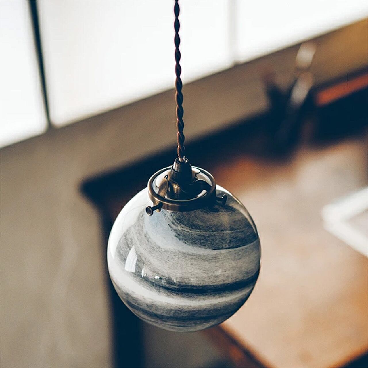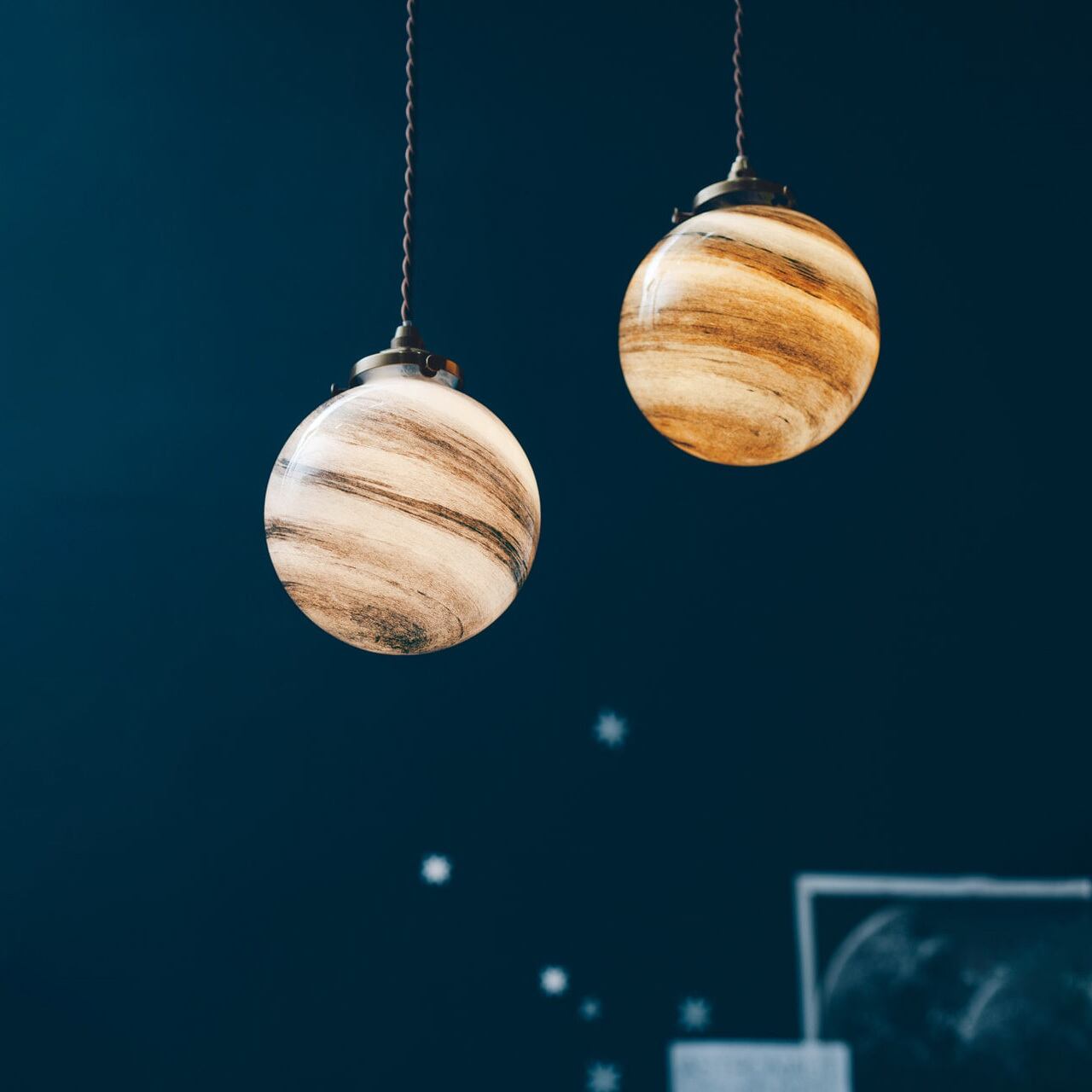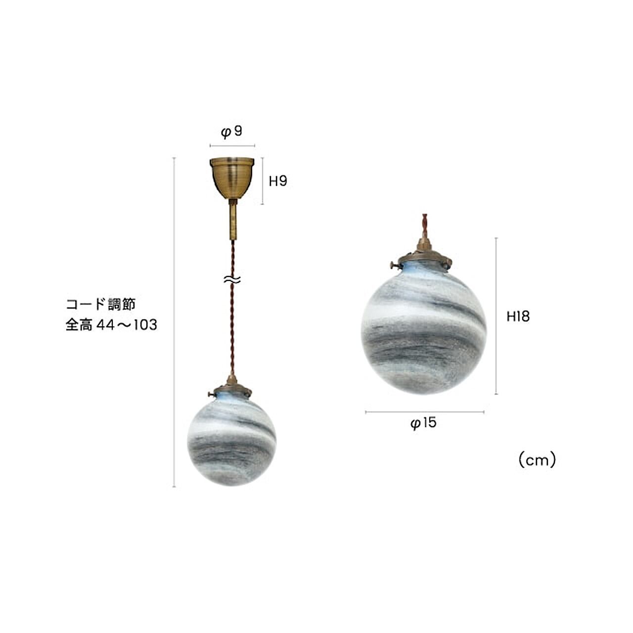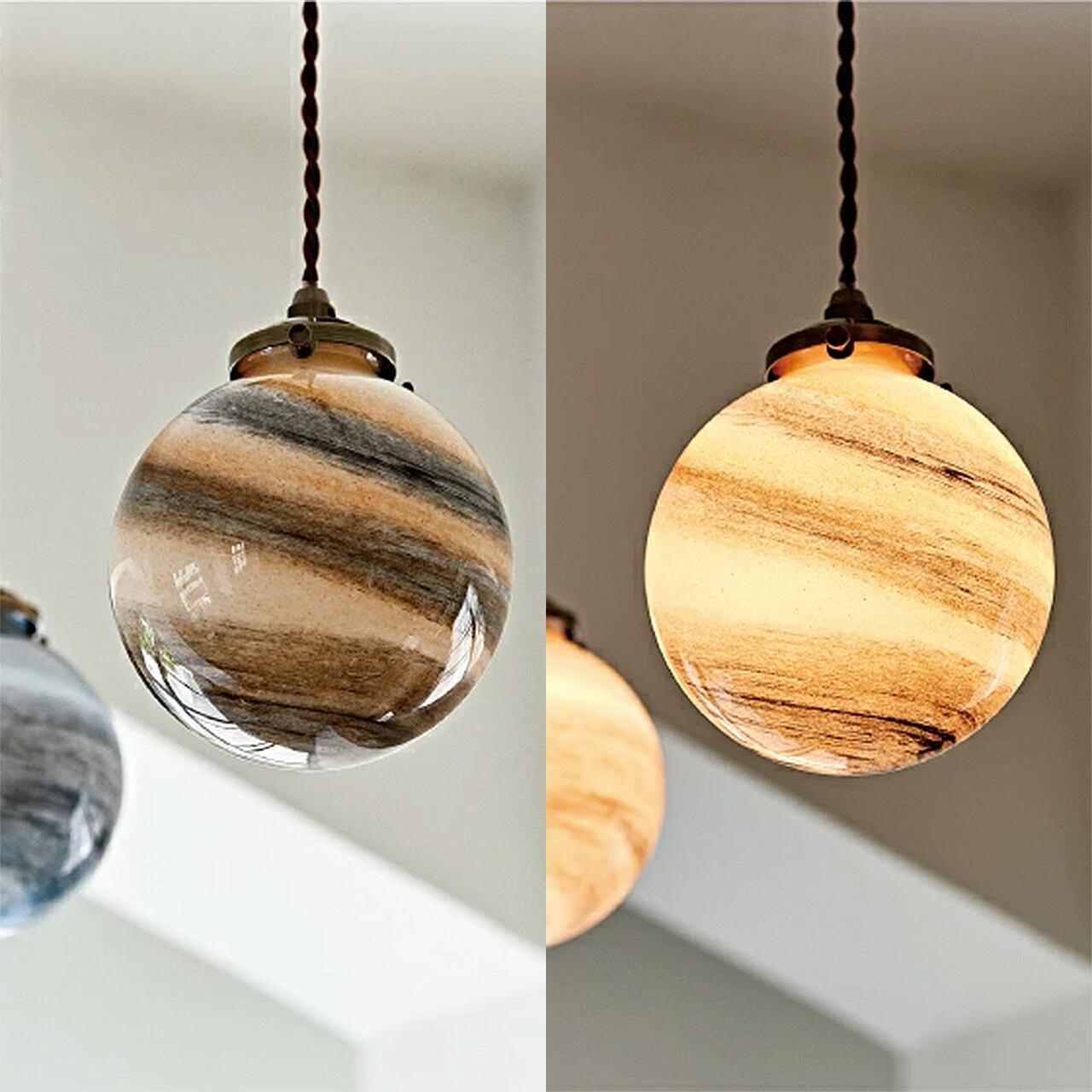 宇宙に浮かぶ惑星をモチーフにしたペンダントライトです。消灯時にはアーティスティックなインテリアアイテムとしてお部屋を彩り、点灯するとマーブル模様を浮かび上がらせながら幻想的な光をぼんやりと広げます。ガラスセードのカラーはブラウンとグレーの2種類。ONとOFFで見せる表情が大きく違うのが特徴です。表面に塗料を塗布したガラスを丁寧に吹いて仕上げることで美しいマーブル模様を表現しました。惑星を取り囲む大気や雲を思わせる仕上がりです。ハンドメイドで作られているため、同じ柄は2つとありません。同じカラーでも模様や色の出方に個体差があるのも魅力です。流れるようなラインがポイントガラスセードですが、点灯時と消灯時で大きくその見た目が異なるのもポイントです。消灯時にははっきりとわかる色の差ですが、点灯させると色の違いがあいまいになることで、マーブル模様が和らぎ、幻想的な雰囲気を広げます。アンティークゴールドのソケットとブラウンの縒りコードを採用することで、落ち着いた味わいを強調しました。長さの調節もでき、余分なコードはシーリングカップの中にスッキリと収納できます。かすれた筆で描いたような柄は動物の毛並みや大理石のようにも見えます。ひとつひとつ柄が異なるので、視覚的にも個性的でユニークなアイテムです。コンパクトなサイズ感なのでキッチンやダイニングに複数吊るせば、表情豊かな空間を演出できます。フォルムはシンプルなのでうるさくなりすぎません。書斎や応接間など格式のある演出や子供部屋の世界観づくりまで、幅広いコーディネイトでお楽しみいただけます。
