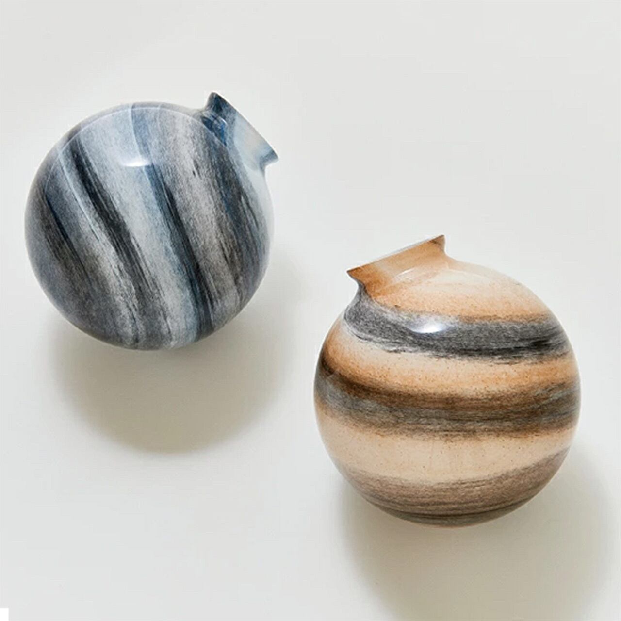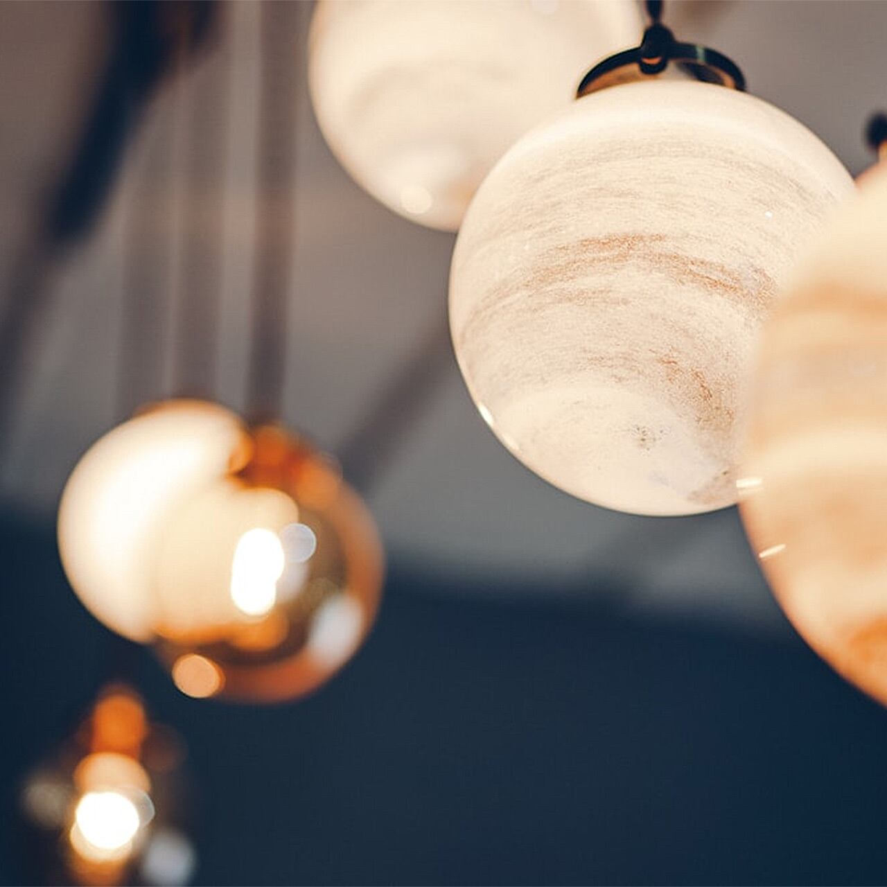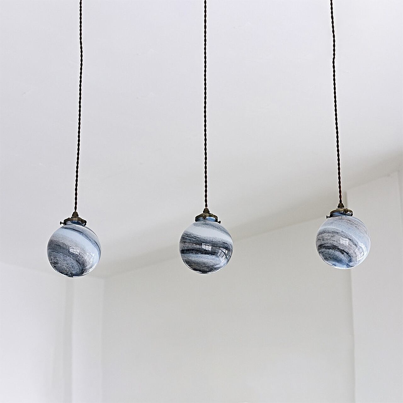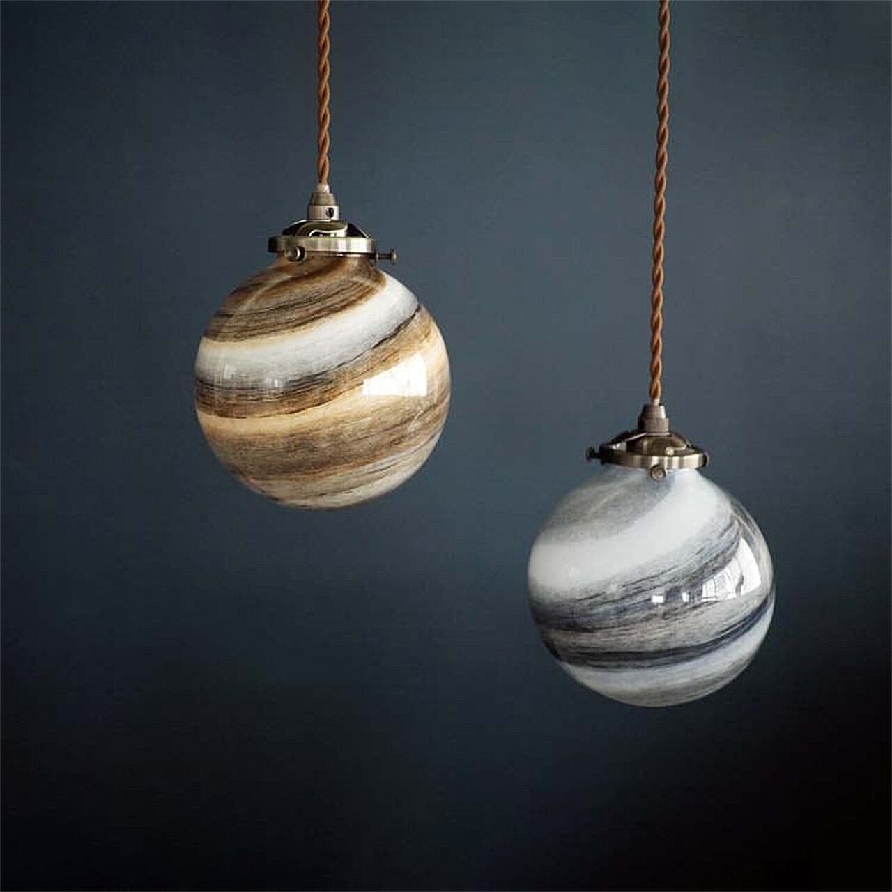 宇宙に浮かぶ惑星をモチーフにしたペンダントライトです。消灯時にはアーティスティックなインテリアアイテムとしてお部屋を彩り、点灯するとマーブル模様を浮かび上がらせながら幻想的な光をぼんやりと広げます。ガラスセードのカラーはブラウンとグレーの2種類。ONとOFFで見せる表情が大きく違うのが特徴です。表面に塗料を塗布したガラスを丁寧に吹いて仕上げることで美しいマーブル模様を表現しました。惑星を取り囲む大気や雲を思わせる仕上がりです。ハンドメイドで作られているため、同じ柄は2つとありません。同じカラーでも模様や色の出方に個体差があるのも魅力です。流れるようなラインがポイントガラスセードですが、点灯時と消灯時で大きくその見た目が異なるのもポイントです。消灯時にははっきりとわかる色の差ですが、点灯させると色の違いがあいまいになることで、マーブル模様が和らぎ、幻想的な雰囲気を広げます。アンティークゴールドのソケットとブラウンの縒りコードを採用することで、落ち着いた味わいを強調しました。長さの調節もでき、余分なコードはシーリングカップの中にスッキリと収納できます。かすれた筆で描いたような柄は動物の毛並みや大理石のようにも見えます。ひとつひとつ柄が異なるので、視覚的にも個性的でユニークなアイテムです。コンパクトなサイズ感なのでキッチンやダイニングに複数吊るせば、表情豊かな空間を演出できます。フォルムはシンプルなのでうるさくなりすぎません。書斎や応接間など格式のある演出や子供部屋の世界観づくりまで、幅広いコーディネイトでお楽しみいただけます。