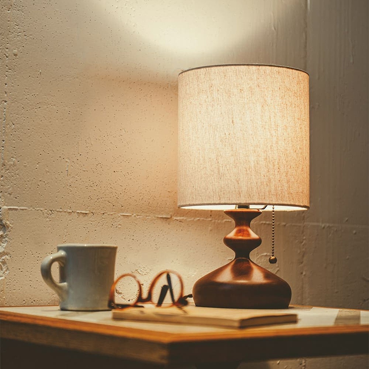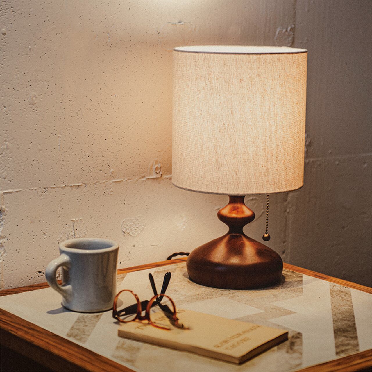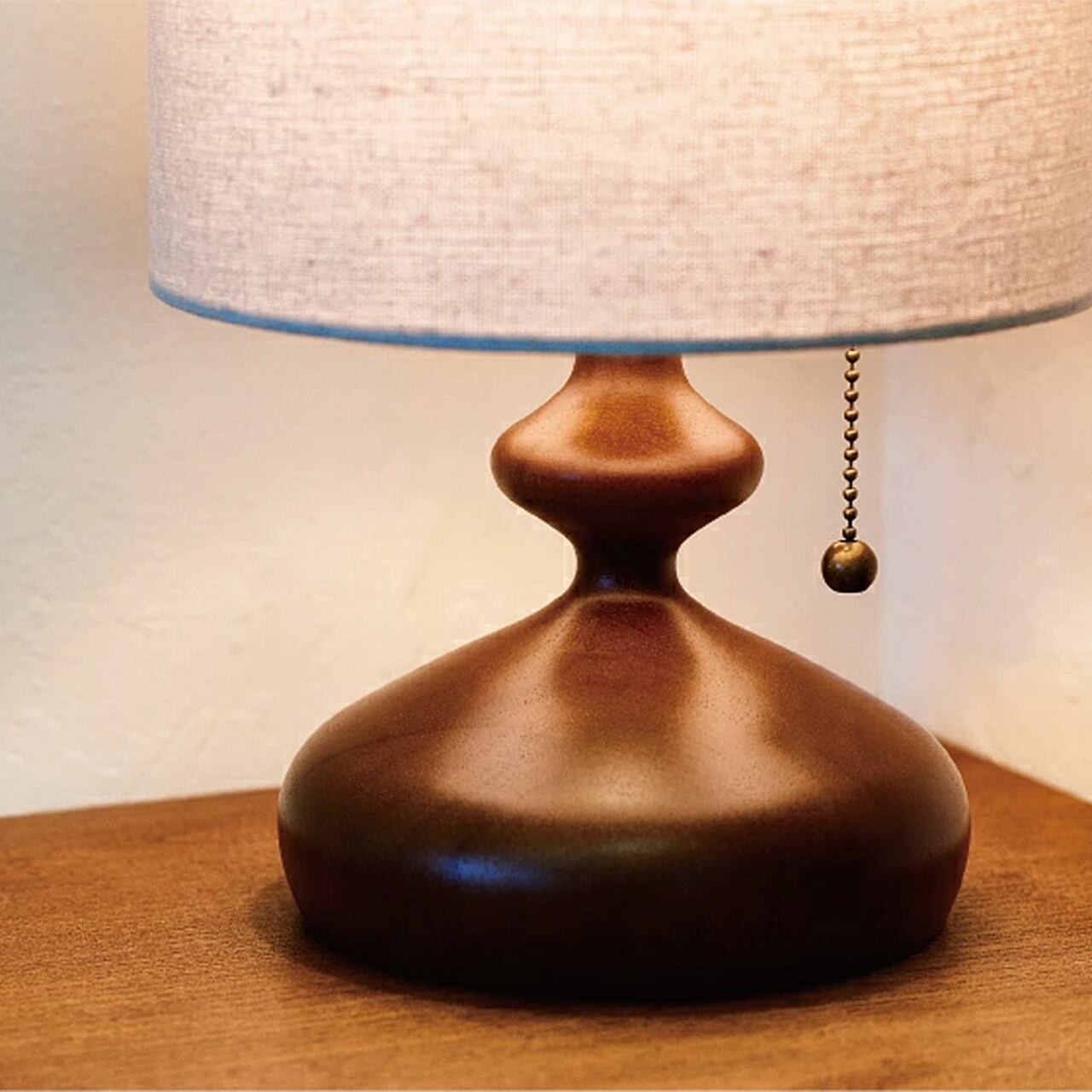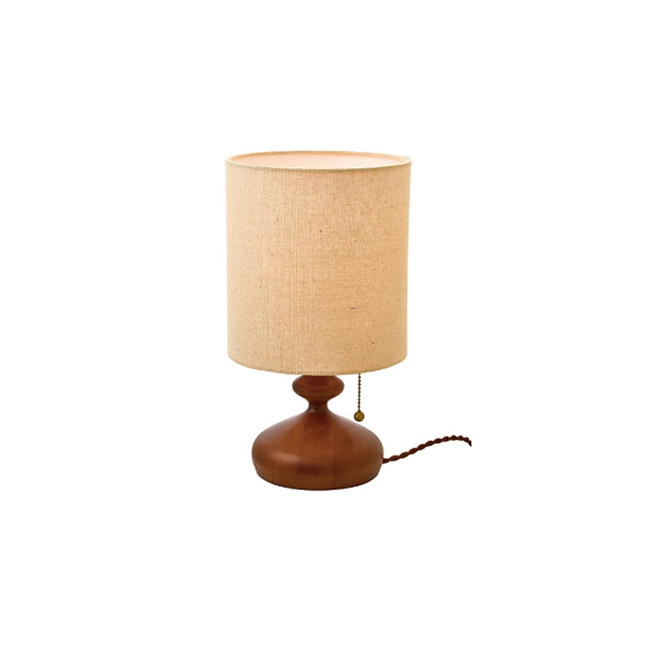 なだらかなカーブを描くウッドベースに優しい光を灯すファブリックセードを合わせたテーブルライトです。レトロな佇まいがゆっくりと流れる静かな時間を演出します。本体部分は木を贅沢に、緩急をつけたフォルムに削り出しました。なめらかな肌触りとリッチな木の質感が落ち着いた空間を作り出します。本体から下がるボールチェーンのプルスイッチがレトロな表情を盛り上げます。スイッチの先端にはウッドボールを配しました。生成り色のファブリックセードは上下が開いている円柱状なので、上下にも光が漏れる構造です。ファブリックセードを通して優しい光が広がります。コンパクトなサイズ感なのでベッドサイドやシェルフの上など、様々な場面でお使いいただけます。