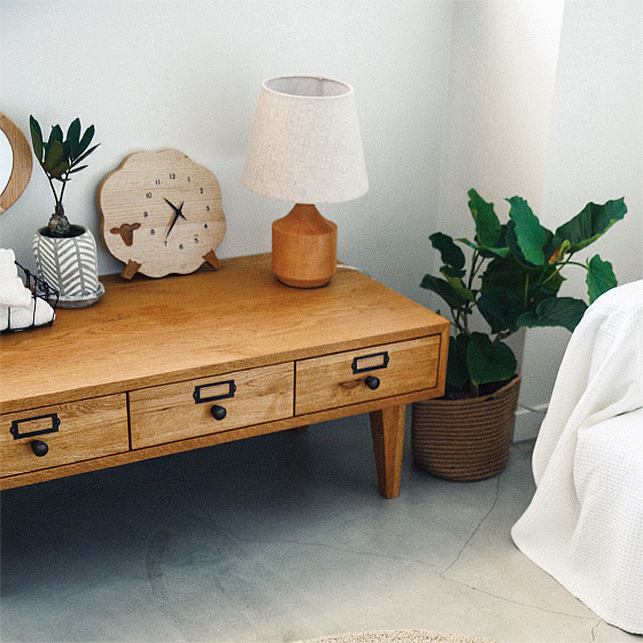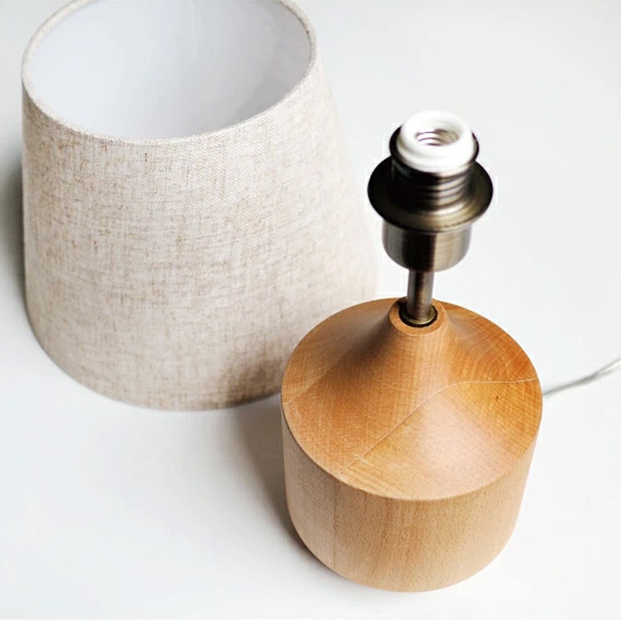 どっしりとした本体は木で。ランプセードは生成りのファブリックで。親しみやすさを備えた、上品でアットホームなテーブルライトです。点灯させない時もスッキリとおしゃれなシルエットがオブジェのような佇まいを見せてくれます。ファブリックセードと木のベースを組み合わせたことで生まれる、心地よいコントラストが魅力です。全体的にシンプルなフォルムなので回りとも合わせやすいデザインです。木を切り出したようなシンプルなフォルムの本体部分は家具のように美しい仕上げが魅力です。ナチュラルな木目が上品さをプラスしてくれます。ベッドサイドはもちろん、リビングや玄関のサブ照明として安らぎを感じさせてくれる存在です。お休み前やリラックスしたい夜など間接照明の柔らかな明かりで心を落ち着かせて。