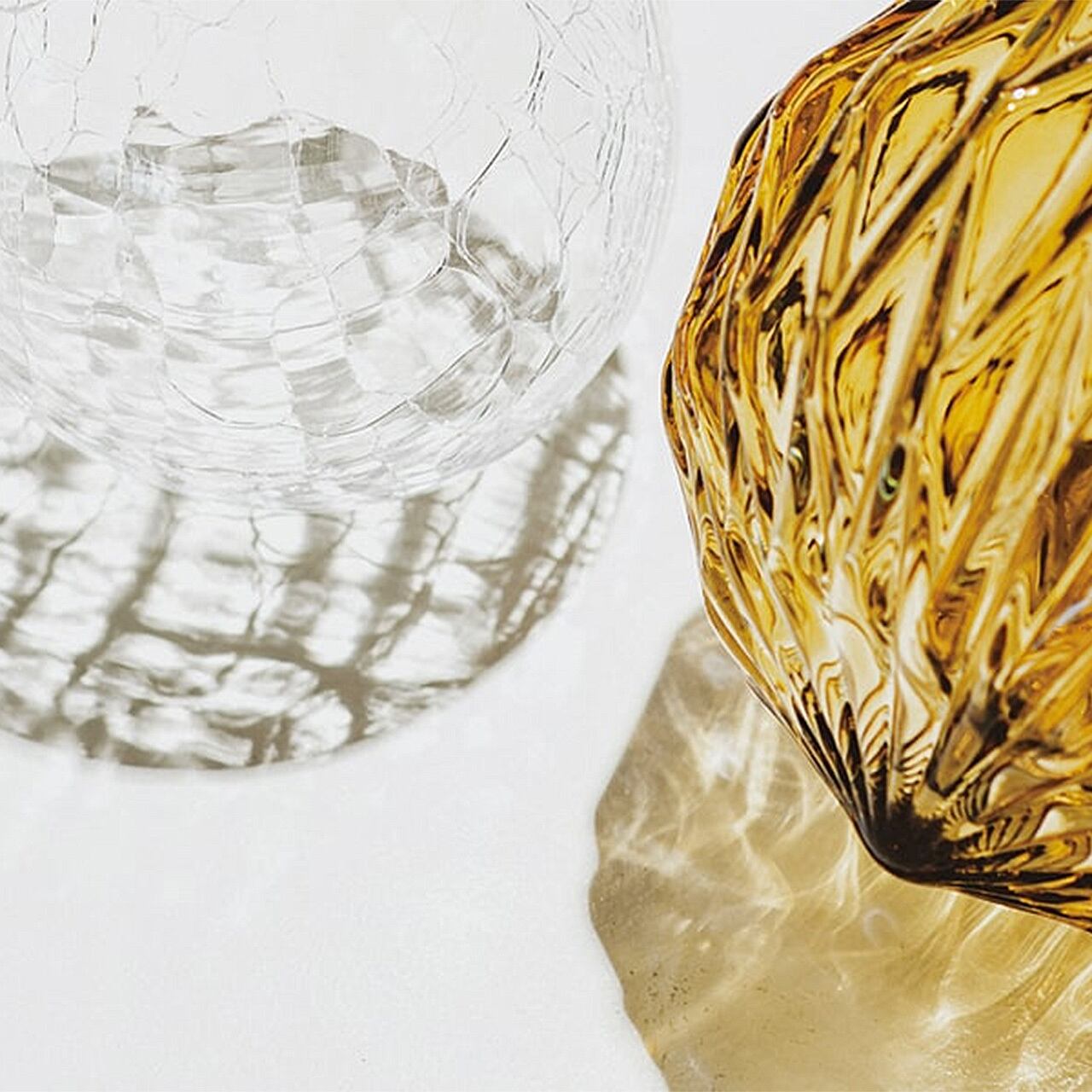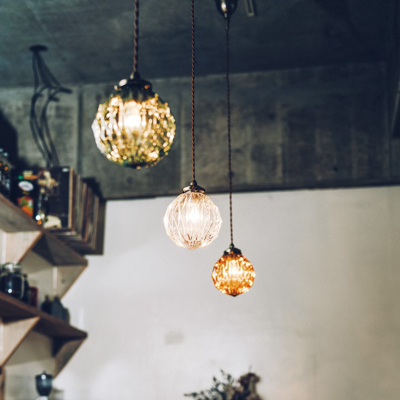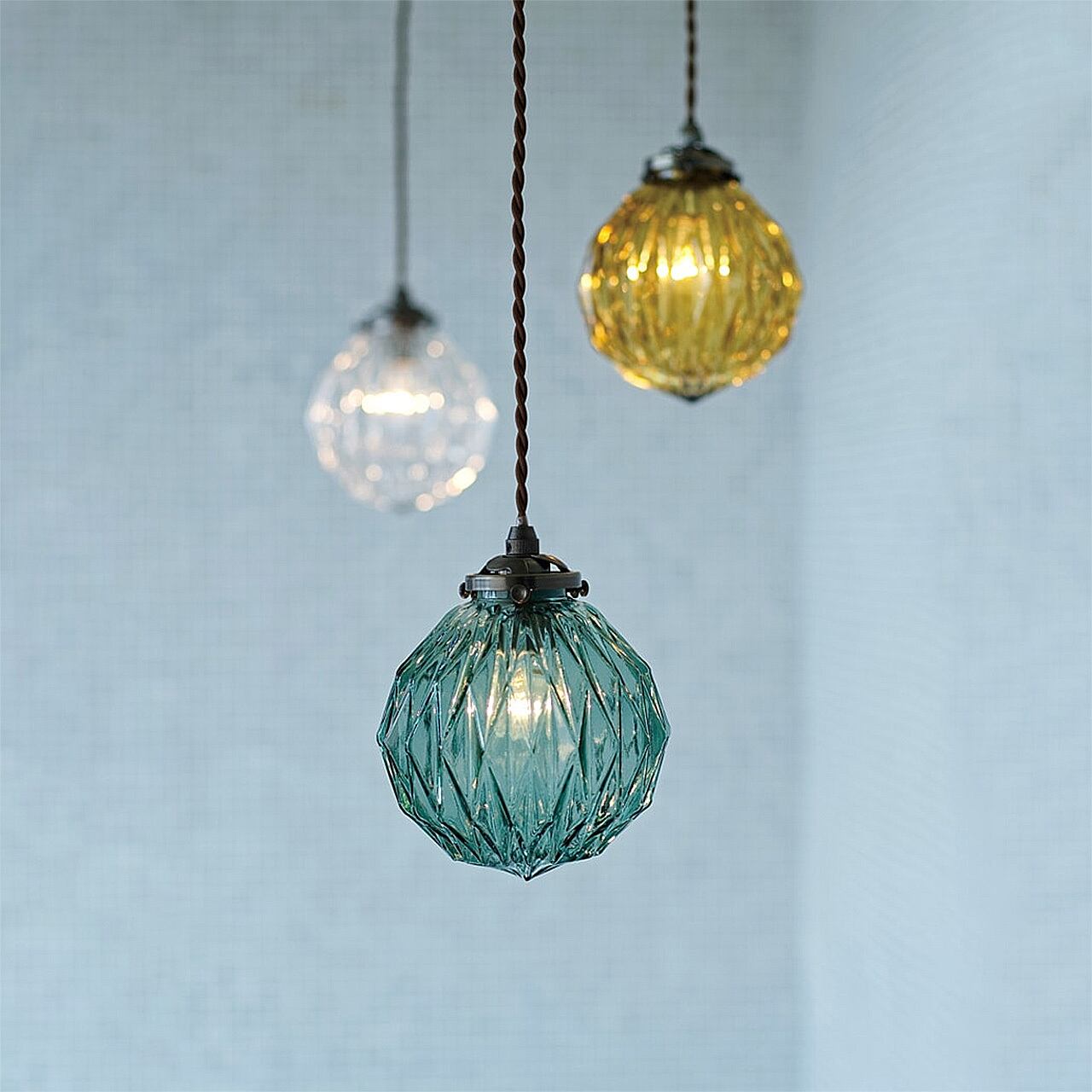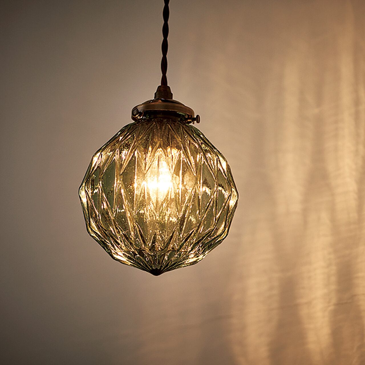 折り目のようなオウトツが作り出す繊細でアンティークな雰囲気が楽しめるペンダントライトです。カフェやサロンなど落ち着きのある空間づくりにもピッタリの仕上がりになりました。カラーはアンバーとクリアに加えて、クールな印象のブルーを合わせた3種類から。折り紙を折ってできる山や谷のようなオウトツが作り出す、宝石のようなエレガントな佇まいが魅力です。厚みのあるガラスを用いているので、水面のように揺らいで見える仕上がりもポイントです。表情のあるガラスセードが空間にアクセントを加えてくれます。点灯させると現れるのが、ガラスのオウトツに乱反射してできる影模様。周りにぱっと広がる様は、ロマンチックで優雅な気分にしてくれます。ブラウンの縒りコードがアンティークな印象を引き立てます。長さの調節もでき、余分なコードはシーリングカップの中にスッキリと収納できます。コンパクトなサイズ感なので、キッチンやダイニングの複数使いにもおススメです。