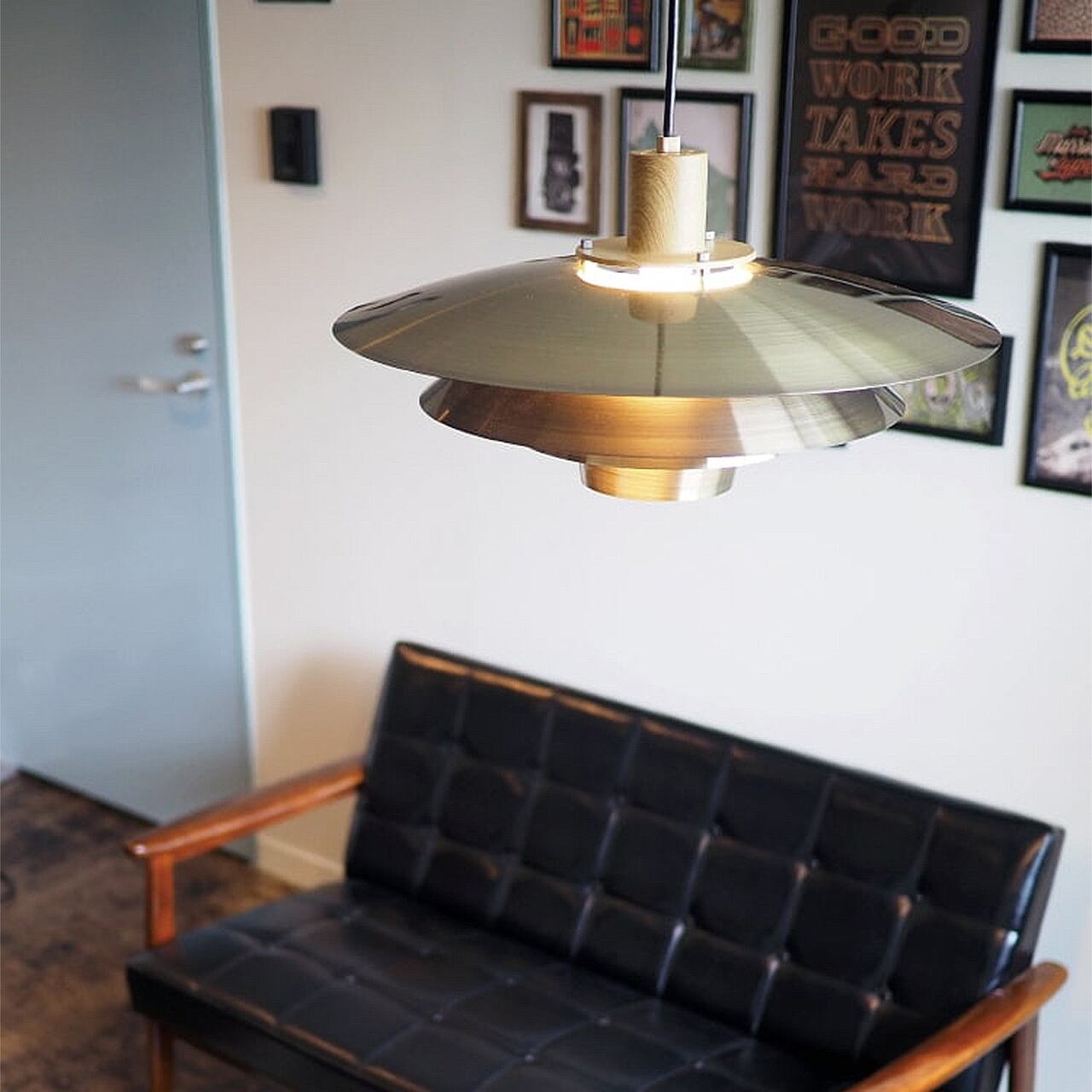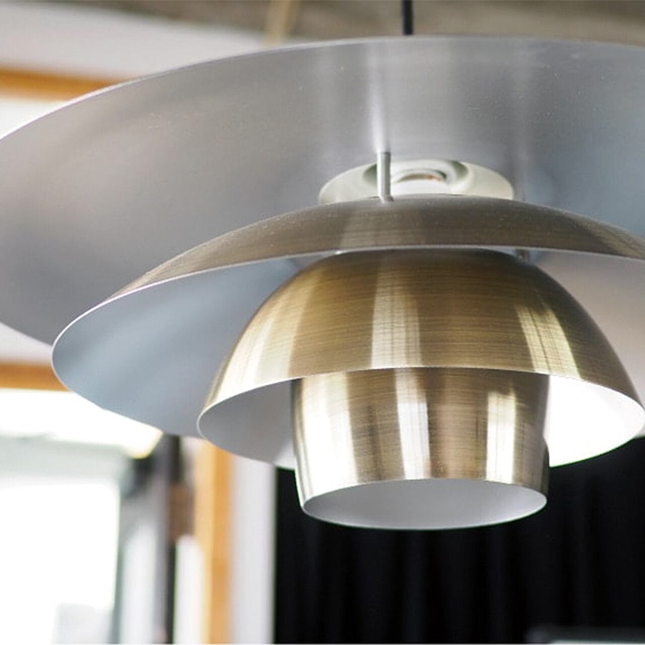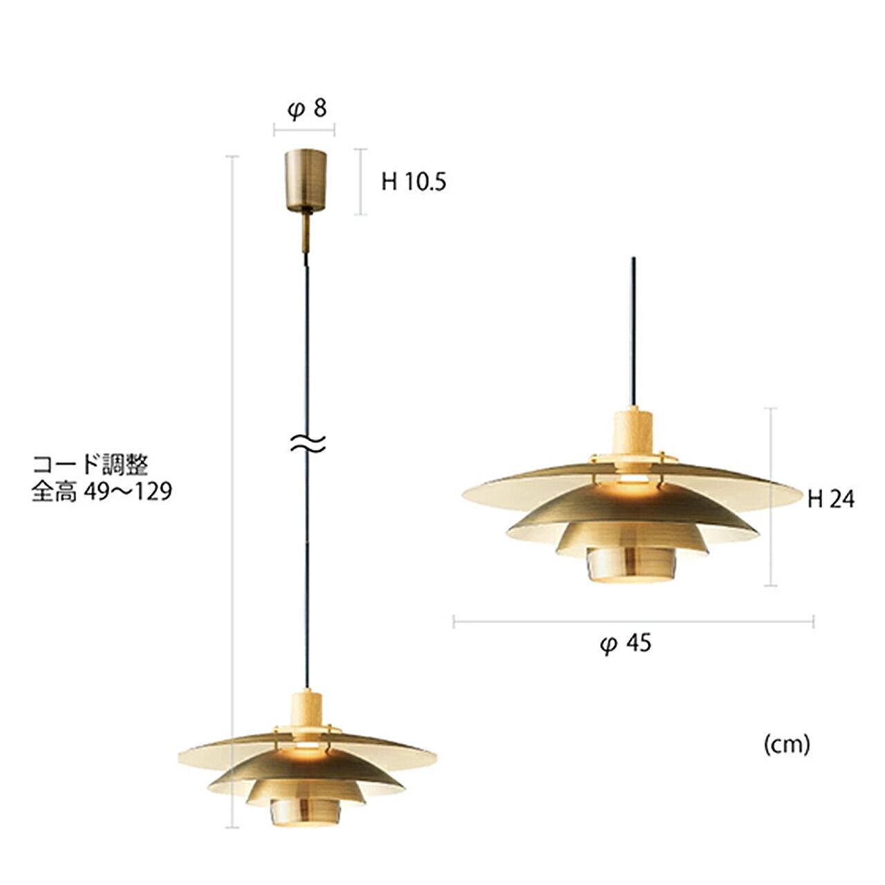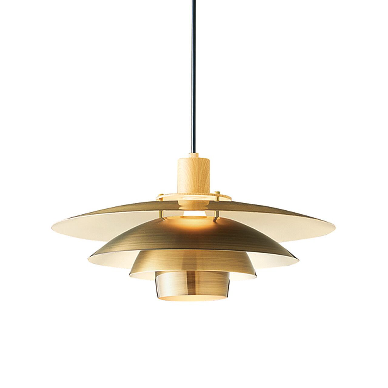 4枚のセードを、光源を包み込むように重ねた北欧テイスト溢れるデザインのペンダントライトです。アンティーク風のゴールドカラーが上品で落ち着いた空間を演出します。煌々と照らすのではなく、4枚のセードからやんわりと光が広がるイメージです。徐々に広がる光のグラデーションが北欧インテリアを思わせる落ち着いた空間を演出してくれます。重ね合わせたサイズの異なるスチールセードから、柔らかな光が広がり、上品な空間を演出します。飽きの来ない洗練されたフォルムが魅力のデザインです。アンティークを思わせるヘアライン加工のゴールドカラーが北欧テイストのデザインとマッチ。トップのソケット部分に木目調の塗装を施すことで、ナチュラルなアクセントをプラスしました。鈍い輝きのゴールドカラーがレトロで高級感のある空間を盛り上げます。長さの調節もでき、余分なコードはシーリングカップの中にスッキリと収納できます。和風にも洋風にも合うクラシカルなイメージは、人気の北欧テイストやモダン、ナチュラルな場所まで幅広く馴染みます。