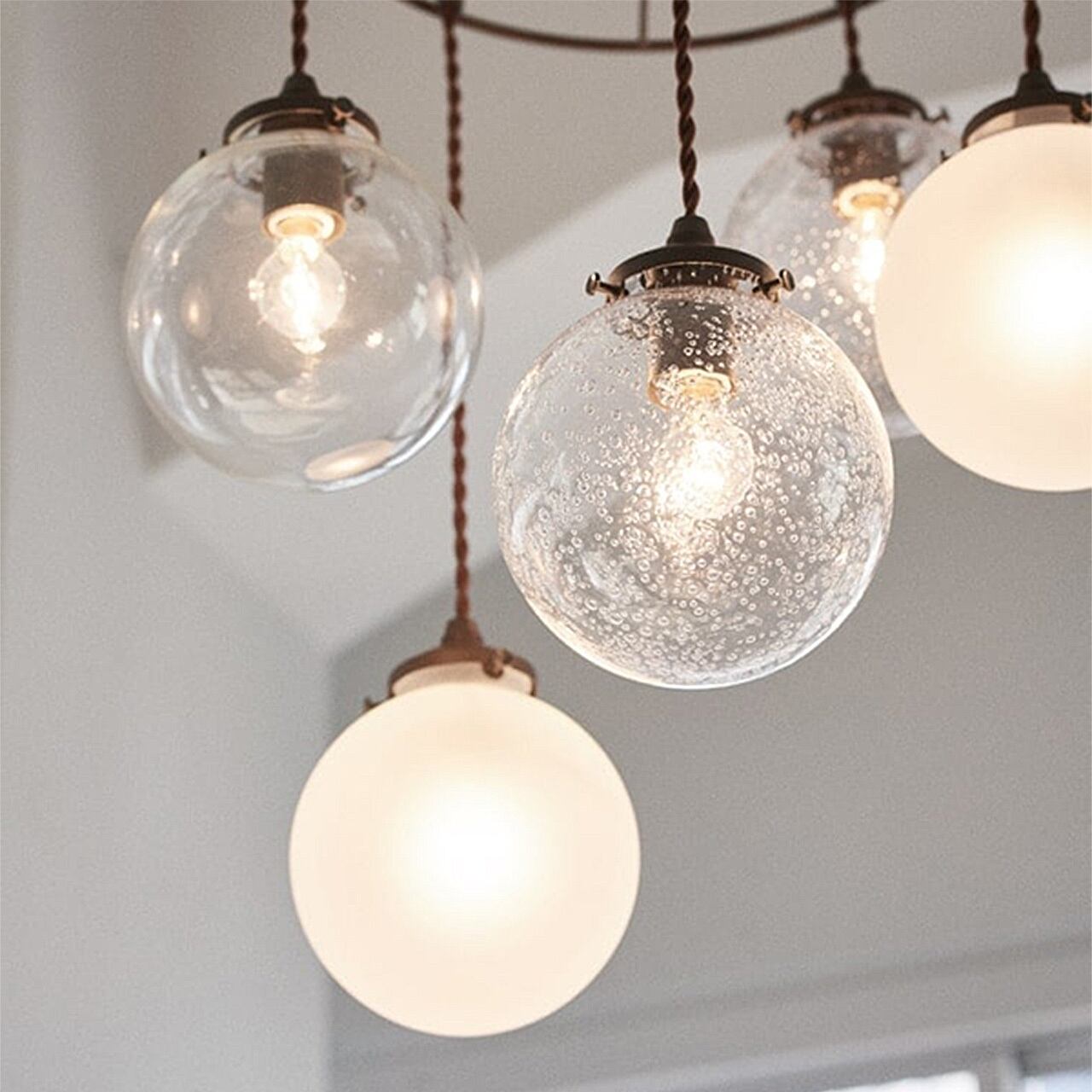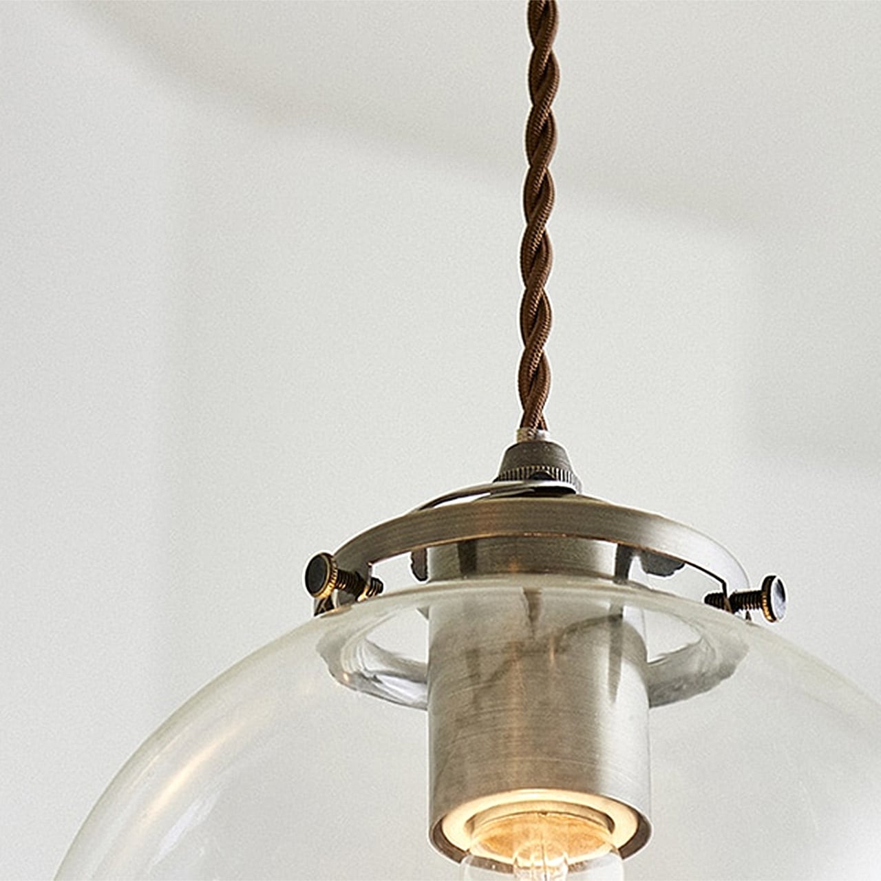 惑星や月が浮かんでいるようなそんな不思議な感覚とねじられたコードやソケット部分のアンティークな要素がミックスされた、主役級のランプ。コードの長さをあえて不揃いにすることで、リズミカルに浮遊するかのような幻想的な光の空間が生まれます。十分な光量を確保できますので、広めのリビングやゴージャスなインテリアとの相性もいいデザインです。ガラスの種類は3種類。ひとつで複数使いを楽しめるペンダントライトです。アンティークゴールドのソケットとブラウンの縒りコードを採用することで、落ち着いた味わいを強調しました。天井のプラグ部分もダークブラウンカラーに統一。予めコードが繋がれています。