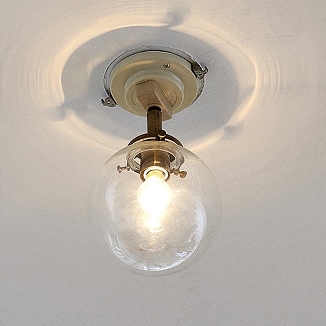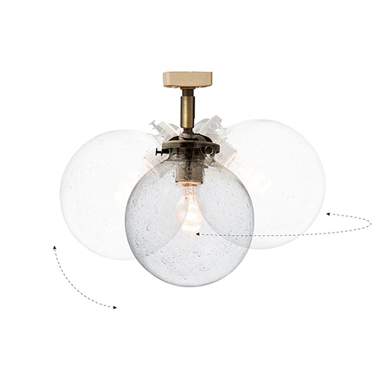 まあるいシャボン玉のようガラスセードから幻想的な明かりが広がる人気のデザインに、スポットタイプが仲間入りです。天井でふわりと浮かんでいるようなレトロでかわいい存在のライト。コンパクトなサイズなので、複数使いにもピッタリなデザインです。ガラスセードの種類は全部で5種類。スチールのソケット部分はアンティークゴールドでレトロな雰囲気に。角度を変えて思いの場所を照らすことができます。角度を付けながら飾るとリズミカルな印象になります。ガラスセードのスポットライトの特徴は天井側にも光が漏れること。厚みのあるガラスを通して広がる、ふんわりとした明りに癒されます。こちらは引っ掛けシーリングにより取付るタイプになります。