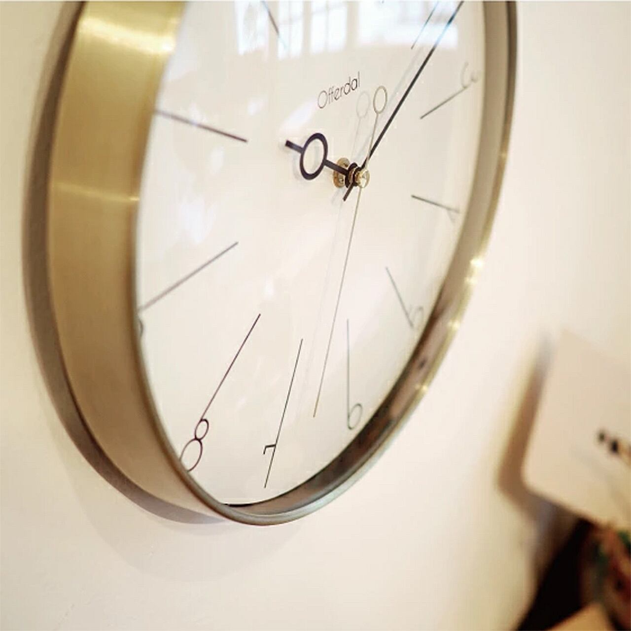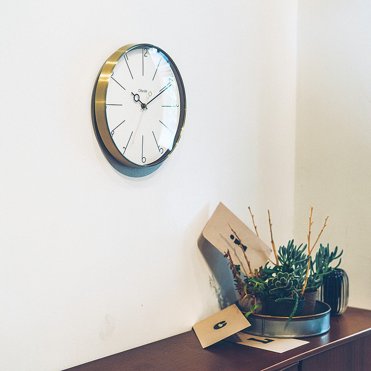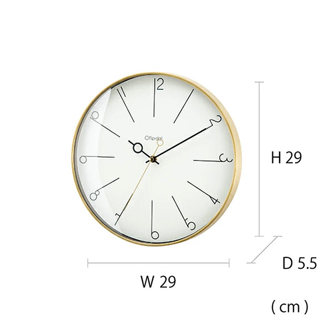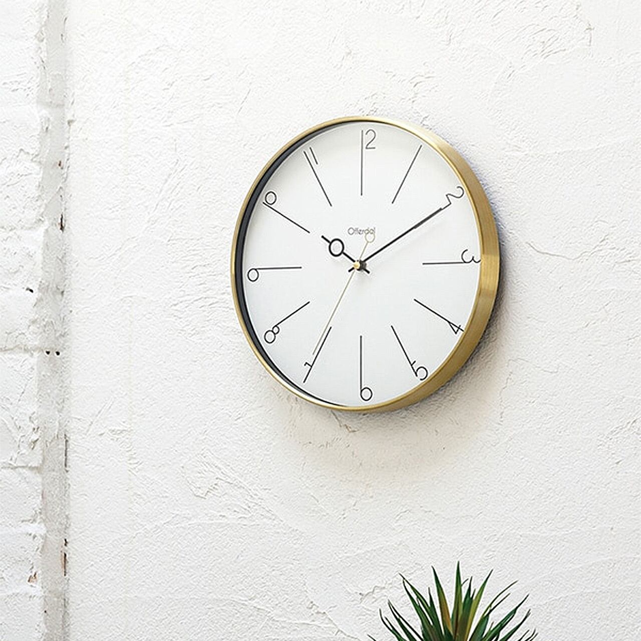 長く伸びた数字と特徴的な針。どちらも細いラインでデザインされたモダンな掛け時計です。美しいゴールドのフレームで包み込み、お部屋を柔らかくエレガントな空間に仕上げます。ヘアライン加工を施した上品なゴールドカラーがモダンな存在のフレームです。前面にはほこりや汚れから文字盤をガードするガラスをはめ込んでいます。時計の中心に向かって真っ直ぐに伸びるラインインデックスと数字がうまく融合した、こだわりのデザインです。丸い輪っかのついた特徴的な短針と秒針も数字とリンクしたデザインになっています。金属の心地よい冷たさとゴールドの上品さがモダンなアクセントをくれます。アクセサリーを選ぶようにコーディネイトをお楽しみください。秒針のコチコチ音が気にならないスイープムーブメントを使用しているので寝室などの静かな場所でも気兼ねなくお使いいただけます。