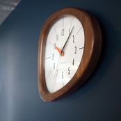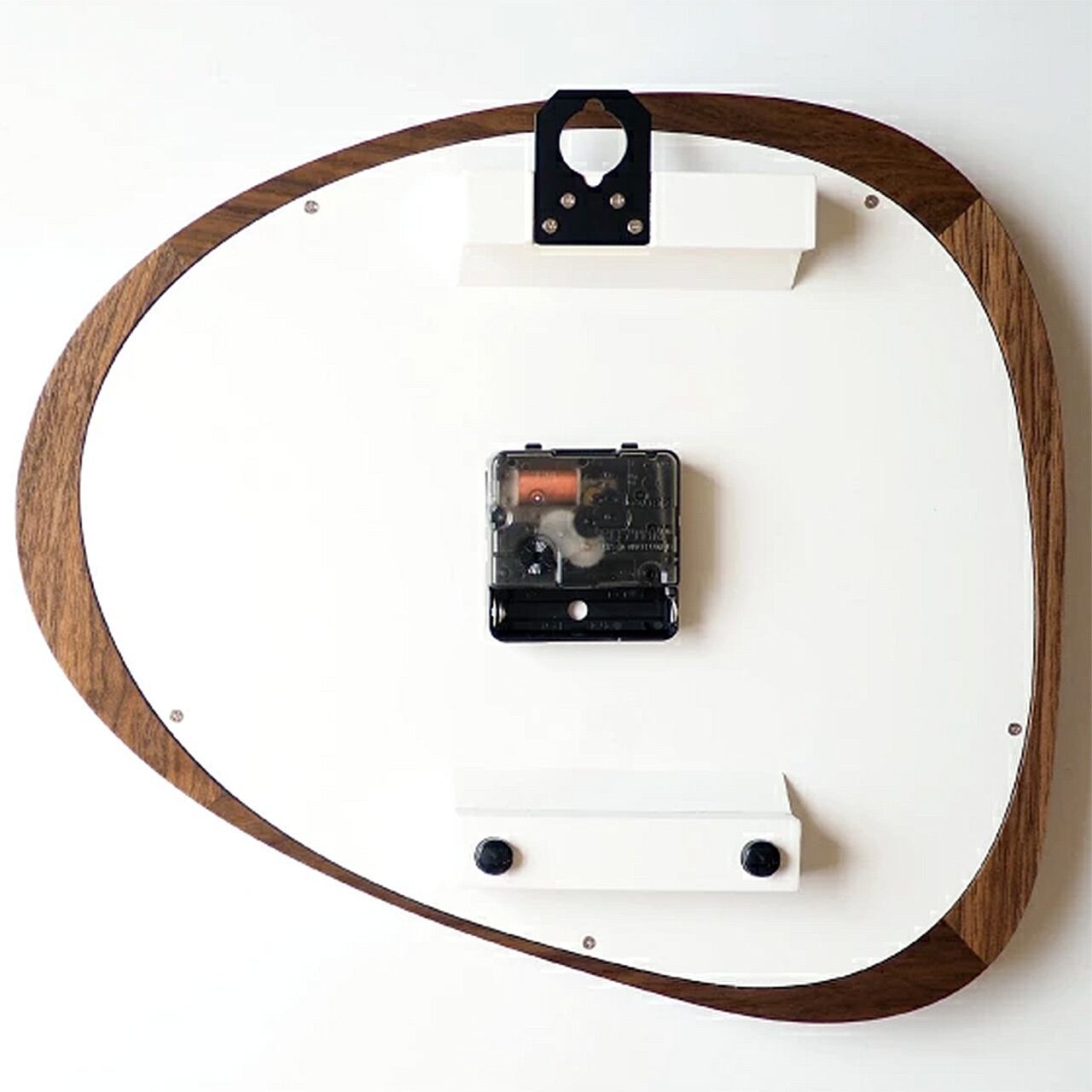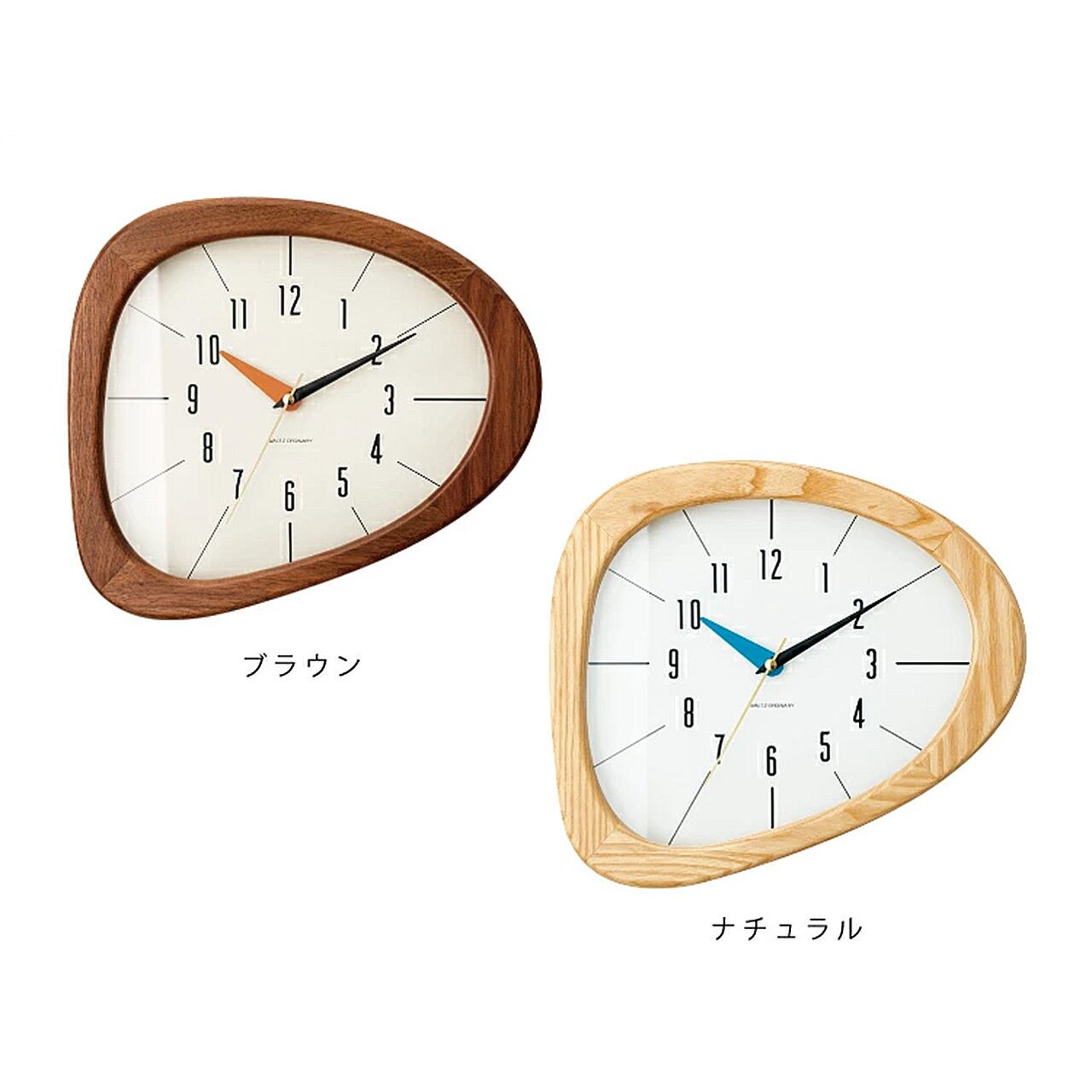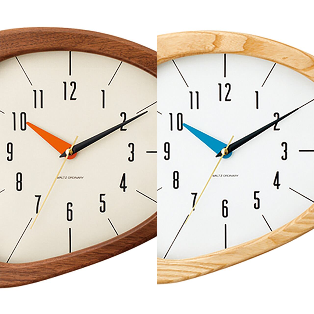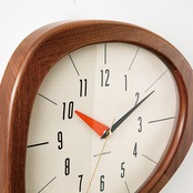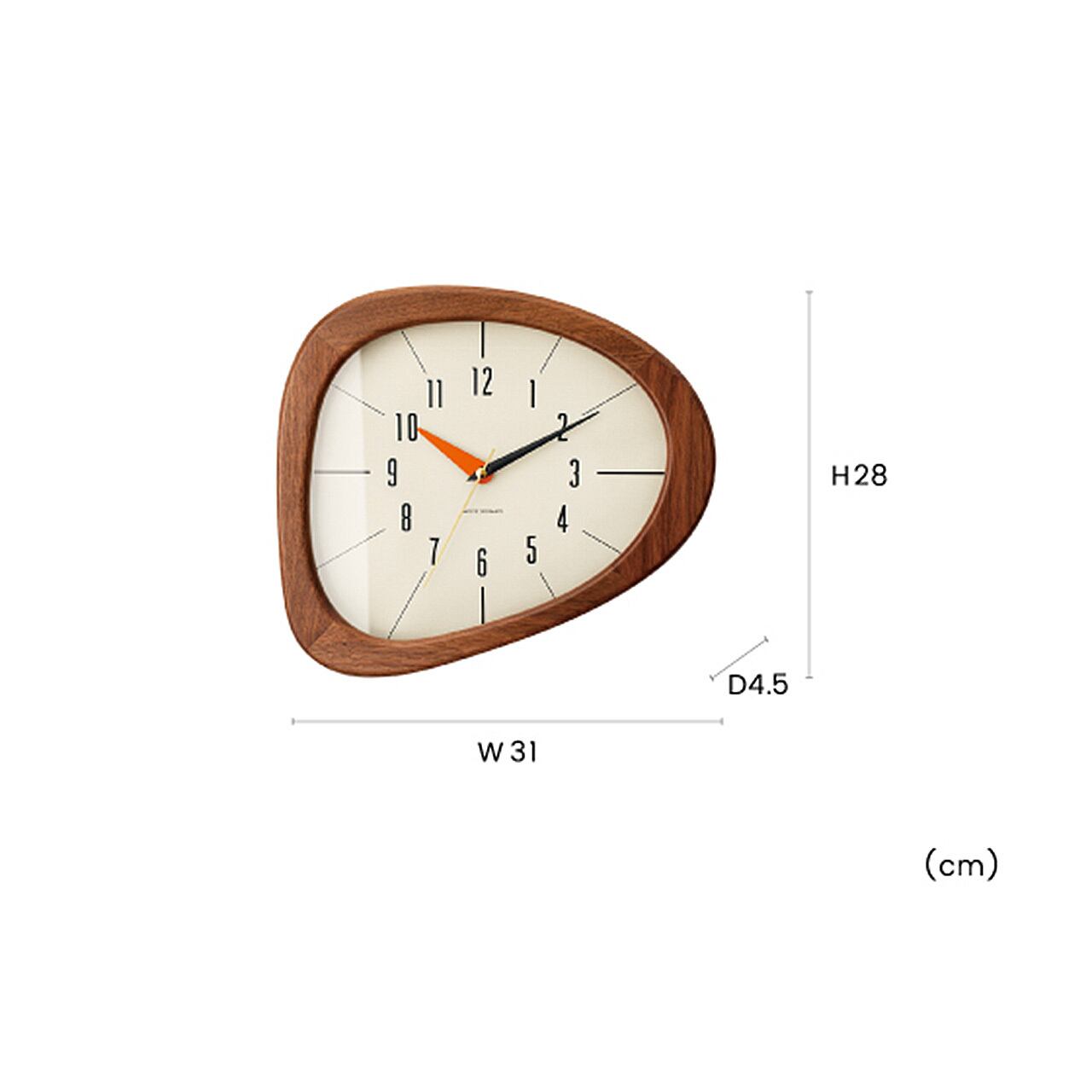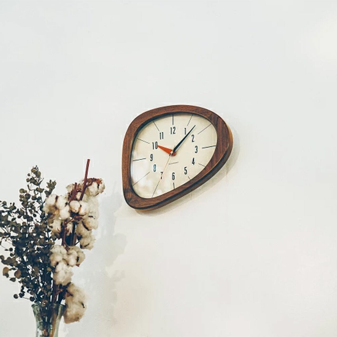 お部屋がほっこり優しい雰囲気になるアシンメトリーな掛け時計が出来ました。丸みを持ったウッドフレームで包み込んだ、高級感も感じられるミッドセンチュリーデザインです。カラーは2種類。ブラウンのフレームにはアイボリーの文字盤を、ナチュラルにはホワイトを合わせました。木目や色の濃淡が美しいウッドフレームが印象深い仕上がりです。ぬくもりのある質感を生かした木製フレームを採用しました。角を取ったしつらえや、緩いアールを描いたフォルムが家具のような上質な雰囲気です。北欧ビンテージを思わせる左右非対称のフォルムは存在感抜群。アシンメトリーでも悪目立ちしない落ち着いたたたずまいが魅力です。短針にはビビッドなアクセントカラーをプラスしました。ゴールドの秒針と相まってレトロポップな雰囲気を盛り上げます。秒針のコチコチ音が気にならないスイープムーブメントを使用しているので寝室などの静かな場所でも気兼ねなくお使いいただけます。