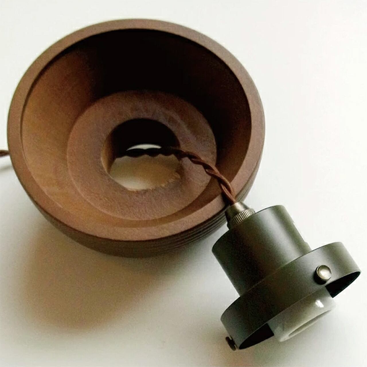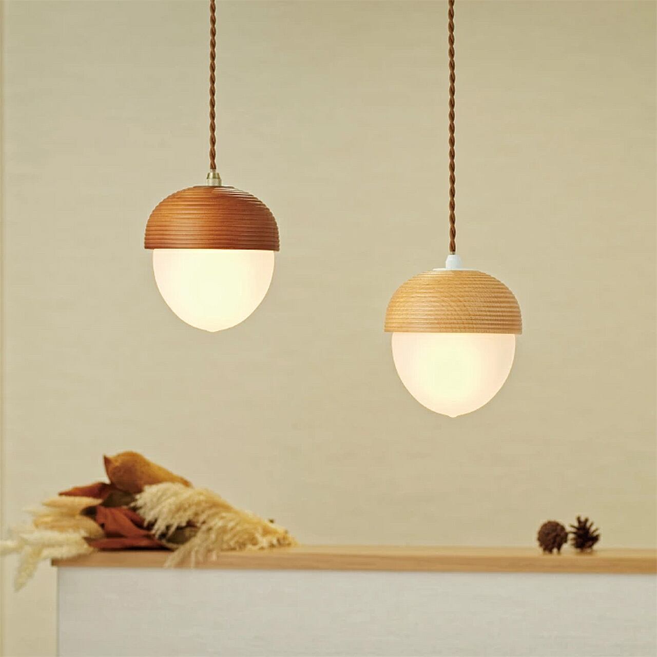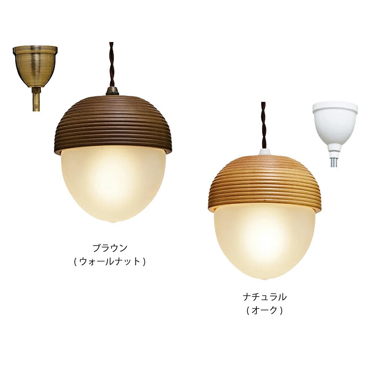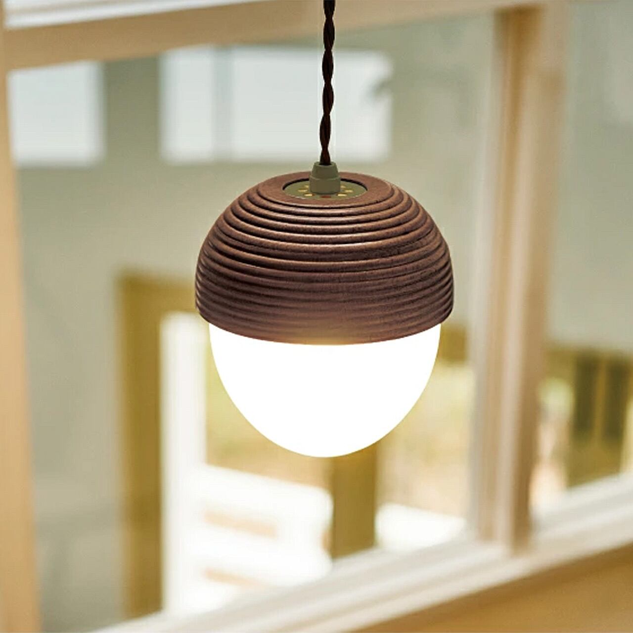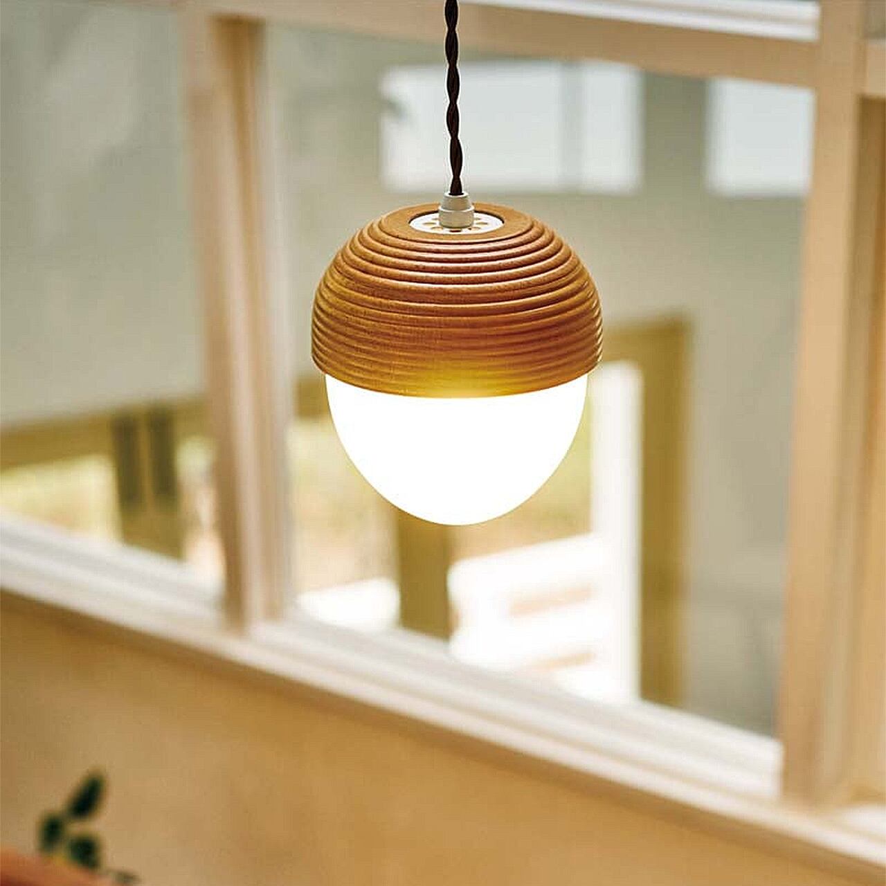 どんぐりを模した小さくてかわいいフォルムから柔らかな光が漏れる優しいデザインが出来ました。木とガラスを組み合わせたキュートな存在感はコーディネイトの中でも立派なアクセントになってくれます。美しい木目が楽しめるカラーは「ブラウン」と「ナチュラル」の2色から。木目によってソケットのカラーもカーキ、ホワイトをチョイスしました。どんぐりをモチーフにした愛らしいデザインがピースフルな空間へと導いてくれます。木のカバーの表面は緩やかな凸凹デザインに仕上げました。ガラスセードにはフロスト加工を施しています。光源が直接目に入らず、心地よい光を広げます。ガラスセードを取り付けるソケットは強度のあるスチール製です。長さの調節もでき、余分なコードはシーリングカップの中にスッキリと収納できます。シーリングカップはソケット部分と同じカラーです。とても柔らかい印象のフォルムが、さらに緩やかでほのぼのする外観に。人気の北欧系や和室にも合うシンプルさも魅力です。