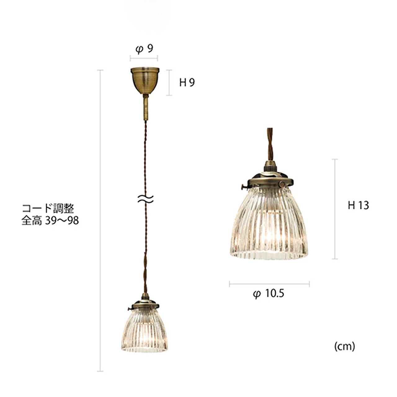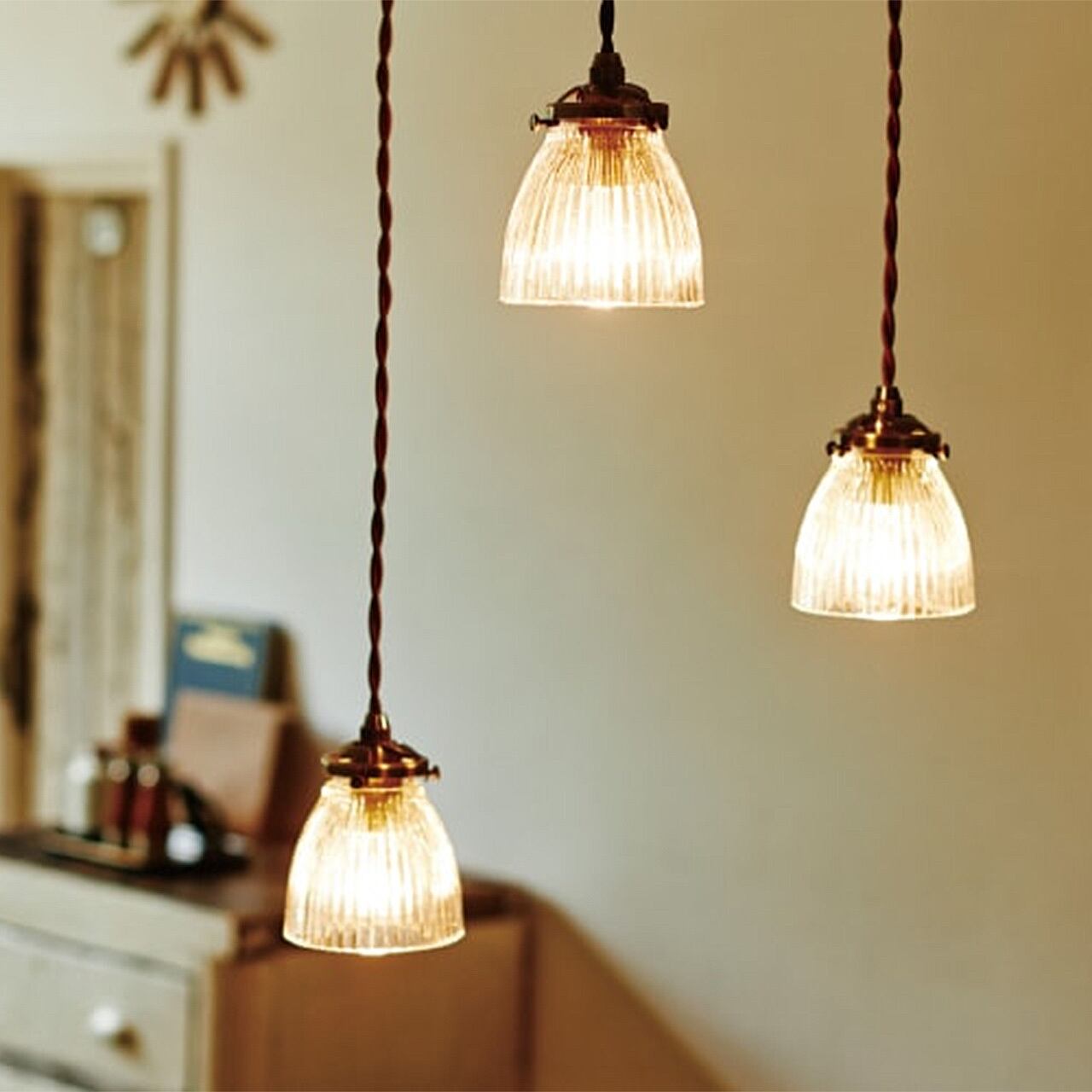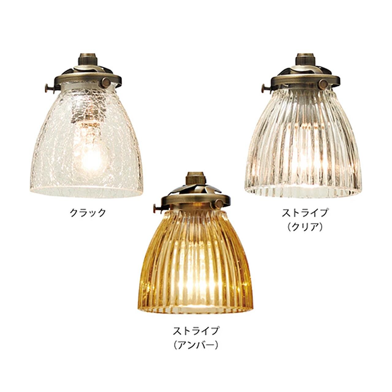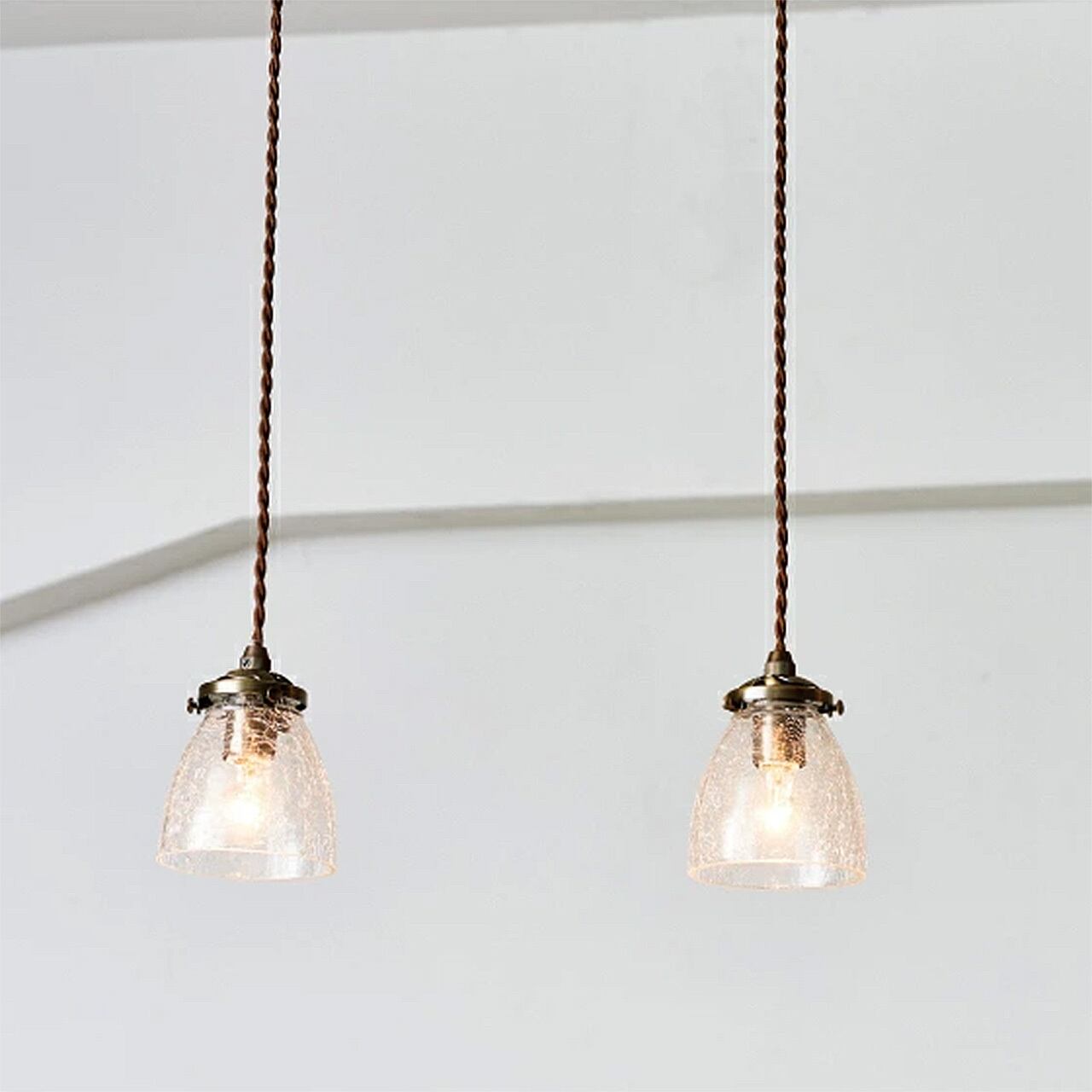 アンティークな表情と小ぶりなサイズのガラスセードが素朴ながら独特な輝きを放つ、懐かしいのに新しい、レトロなペンダントライトです。ガラスのデザインはひび割れ加工のクラックとギザギザの凹凸が特徴のストライプから。ストライプはクリアとアンバーの2色をご用意しました。小さなサイズなので、見た目にもキュートな印象に。点灯させるとガラスセードを通して屈折する光が美しい点も見所です。キッチンやダイニングでの複数使いもおすすめです。凹凸やひび割れ模様などデザインガラスのセードは空間を彩るようにキュートな印象をプラスします。レトロな雰囲気を出すためにあえてガラスのよれや不均一な厚みを残したままにしています。アンティークゴールドのソケットとブラウンの縒りコードを採用することで、よりレトロな佇まいになりました。長さの調節もでき、余分なコードはシーリングカップの中にスッキリと収納できます。和風にも洋風にも合うクラシカルなイメージは、人気の北欧テイストや昭和レトロな場所まで幅広く馴染みます。