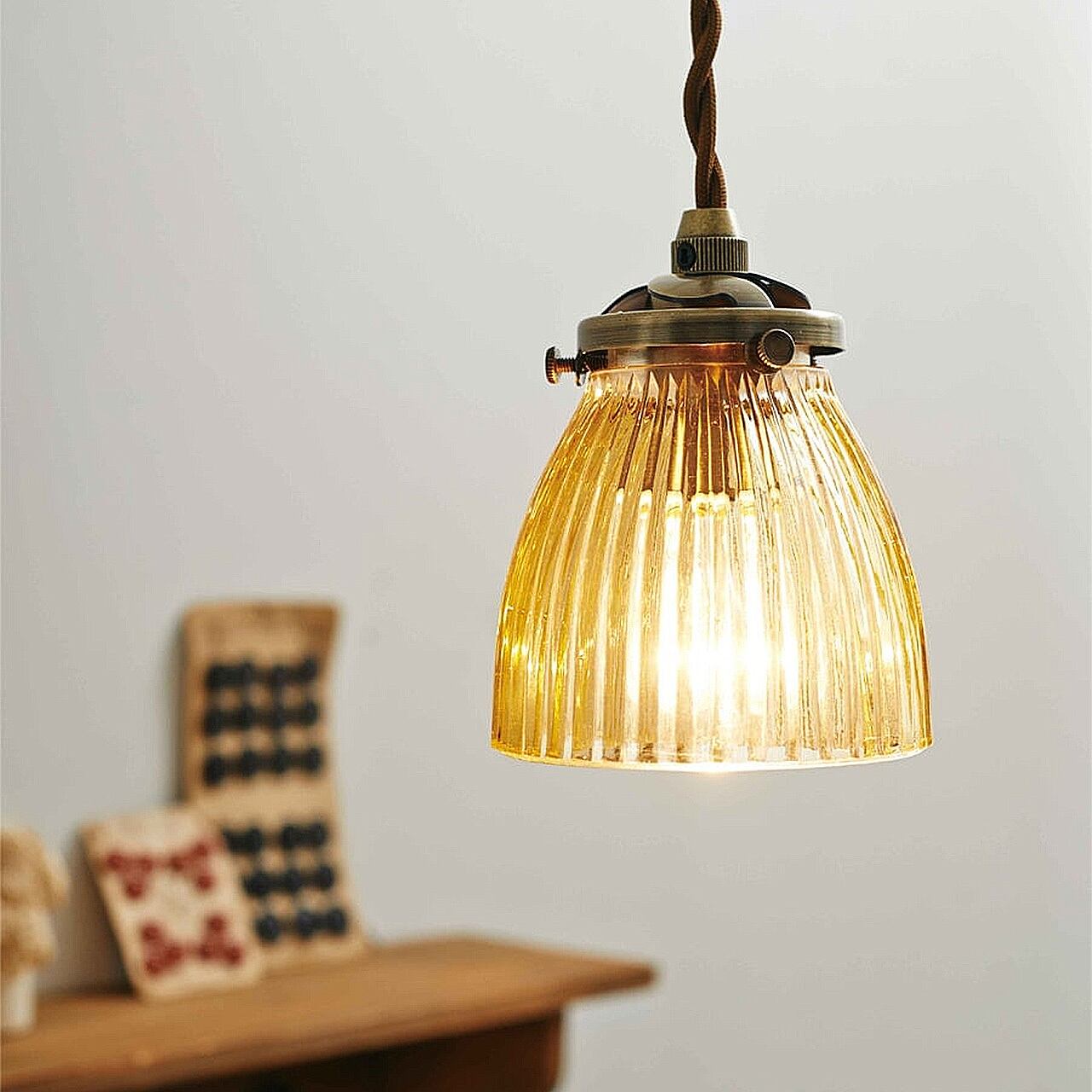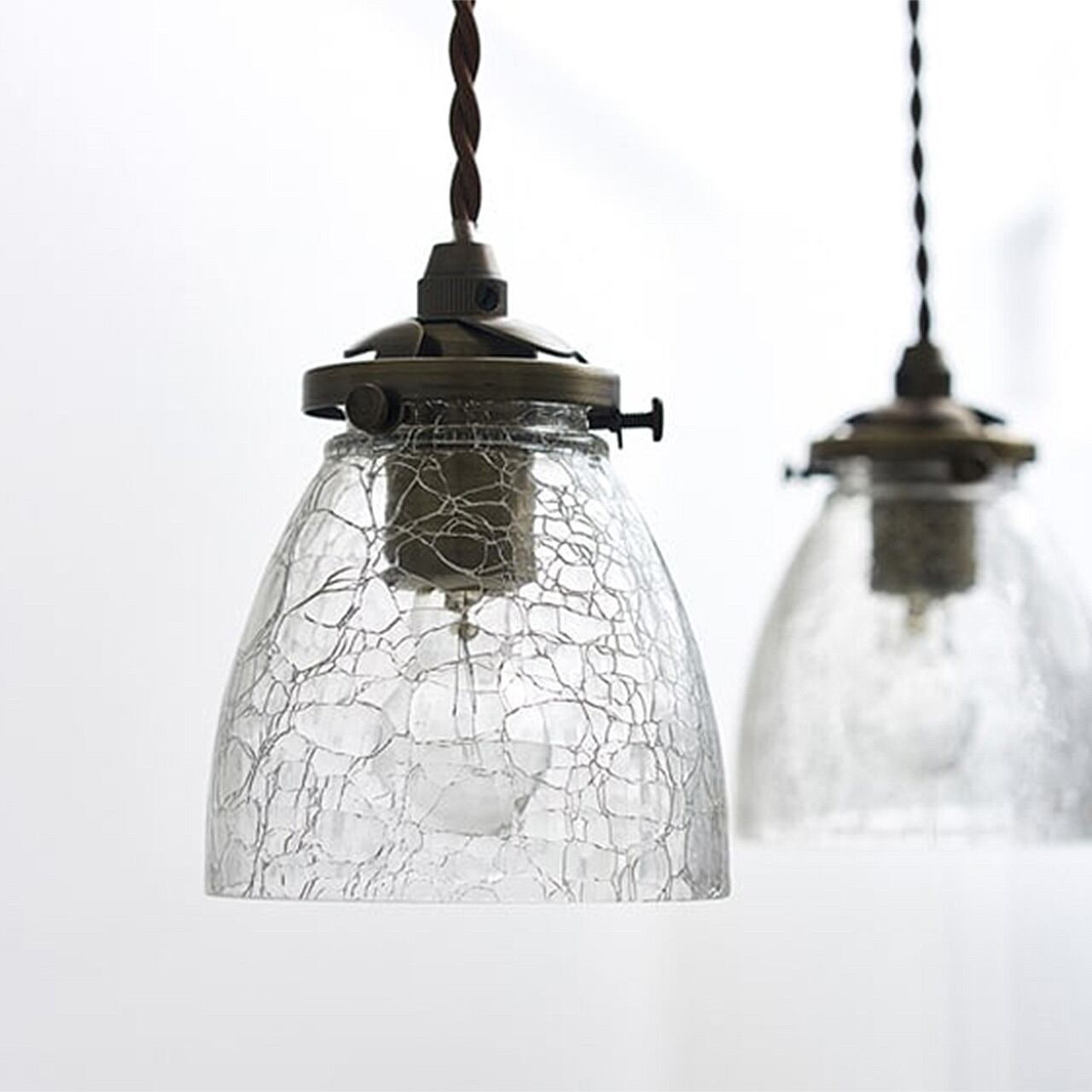 レトロな表情のガラスセードが趣のある空間を演出してくれる3灯タイプのペンダントライトです。ガラスのデザインはひび割れ加工のクラックとギザギザの凹凸が特徴のストライプの2種類から。ストライプはクリアとアンバーの2色をご用意しました。デザインガラスのセードは空間を彩るようにキュートな印象をプラスします。レトロな雰囲気を出すためにあえてガラスのよれや不均一な厚みを残したままにしています。小さなサイズなので、見た目にもキュートな印象に。点灯させるとガラスセードを通して屈折する光が美しい点も見所です。ひとつで複数吊りが楽しめます。アンティークゴールドのソケットとブラウンのねじりコードを採用することでよりレトロな佇まいになりました。コードの長さをそれぞれに調節できるので、段違いにして奥行きを出したり、短くそろえたりとお好みのスタイリングが可能です。余分なコードはウッドアームの中に収納できます。本体のアームには木を、中心部分にはアンティークゴールドのスチールを合わせました。素材のコントラストがおしゃれな雰囲気を演出します。和風にも洋風にも合うクラシカルなイメージは、人気の北欧テイストから、昭和レトロな場所まで幅広く馴染みます。
