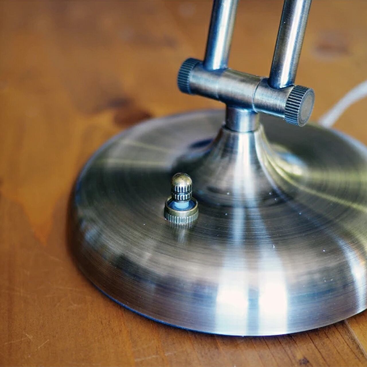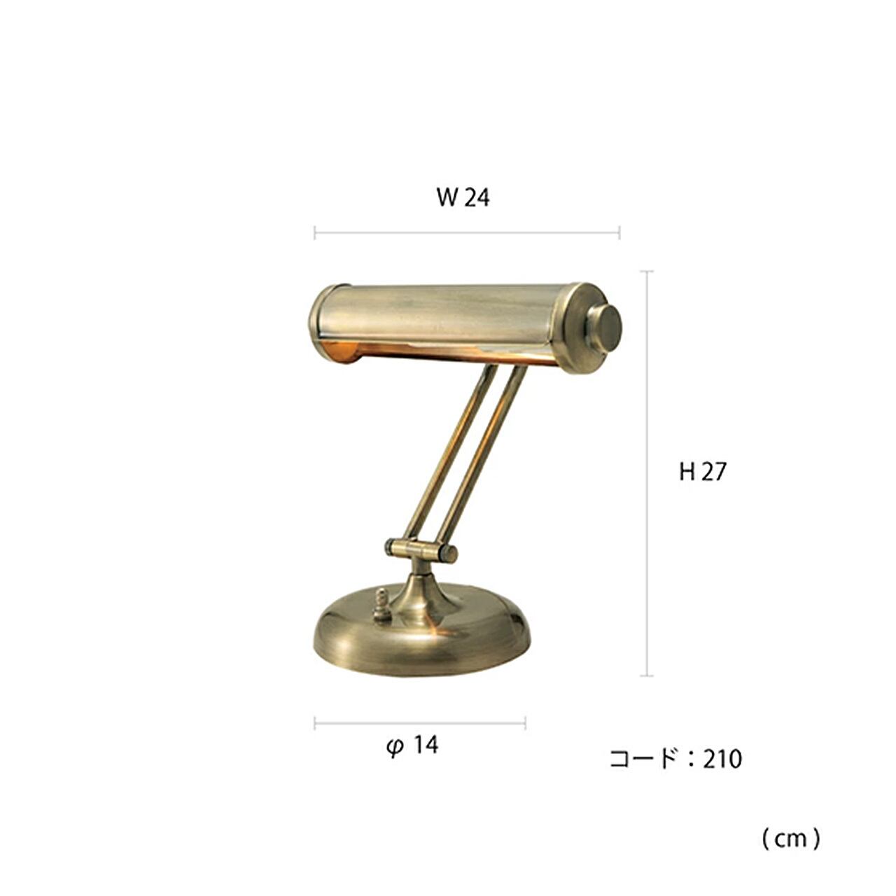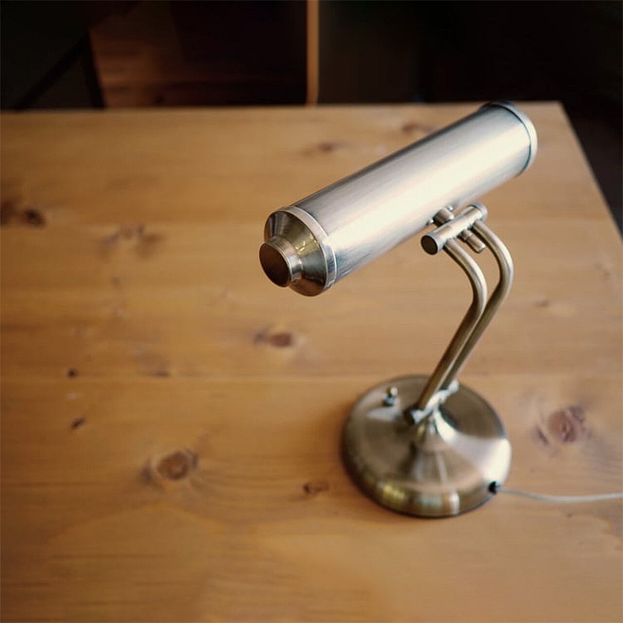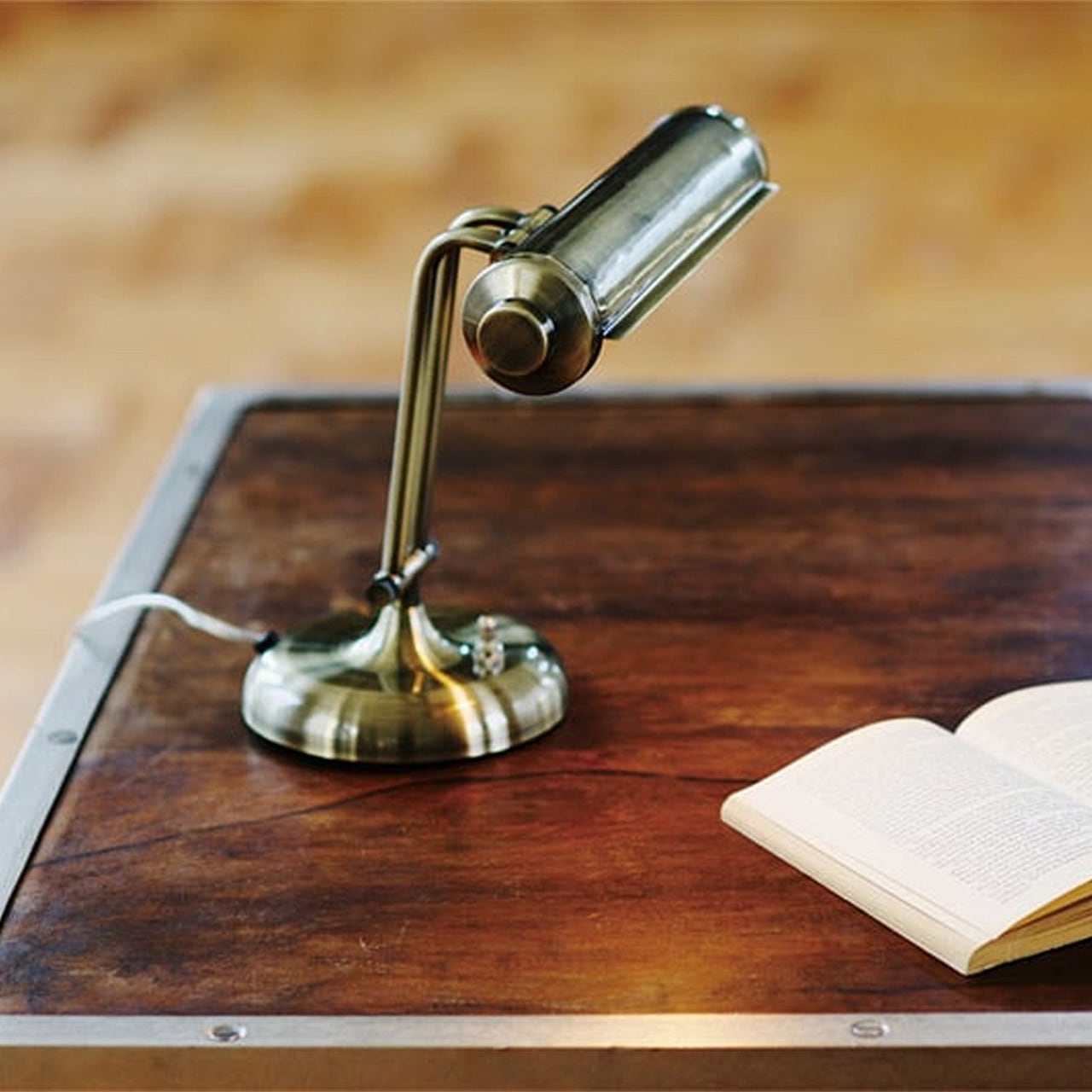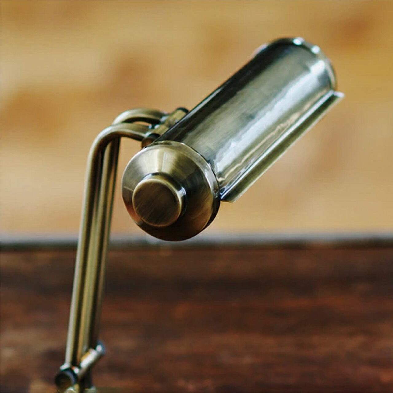 真鍮色のカラーリングと細部までこだわったデザインがアンティークな風合いを醸し出すデスクライトです。手元を照らす機能はもとより、映画の小道具のような完成度の高いオブジェとしてもお楽しみいただけます。フレンチアンティークをオマージュしたヘアライン加工が特徴的な真鍮カラーと、バランスの取れたフォルムが人気です。横長のセードが下方向に光を集中させ、手元をくっきりと照らします。コンパクトなサイズ感や手軽な使用感など、書斎やデスクの心地よいアクセントとしてフィットします。アーム部分の2か所のつまみで角度を変えることができます。