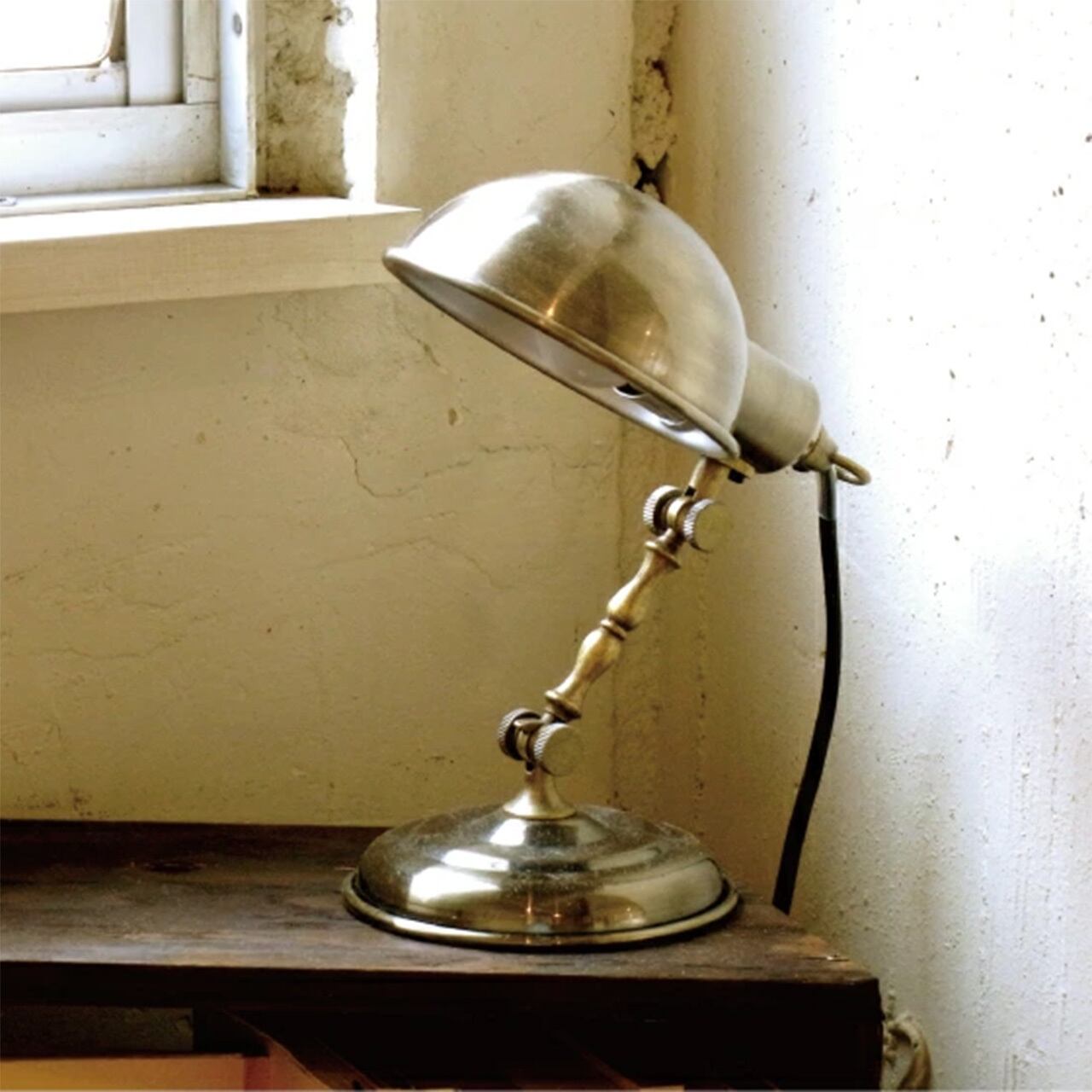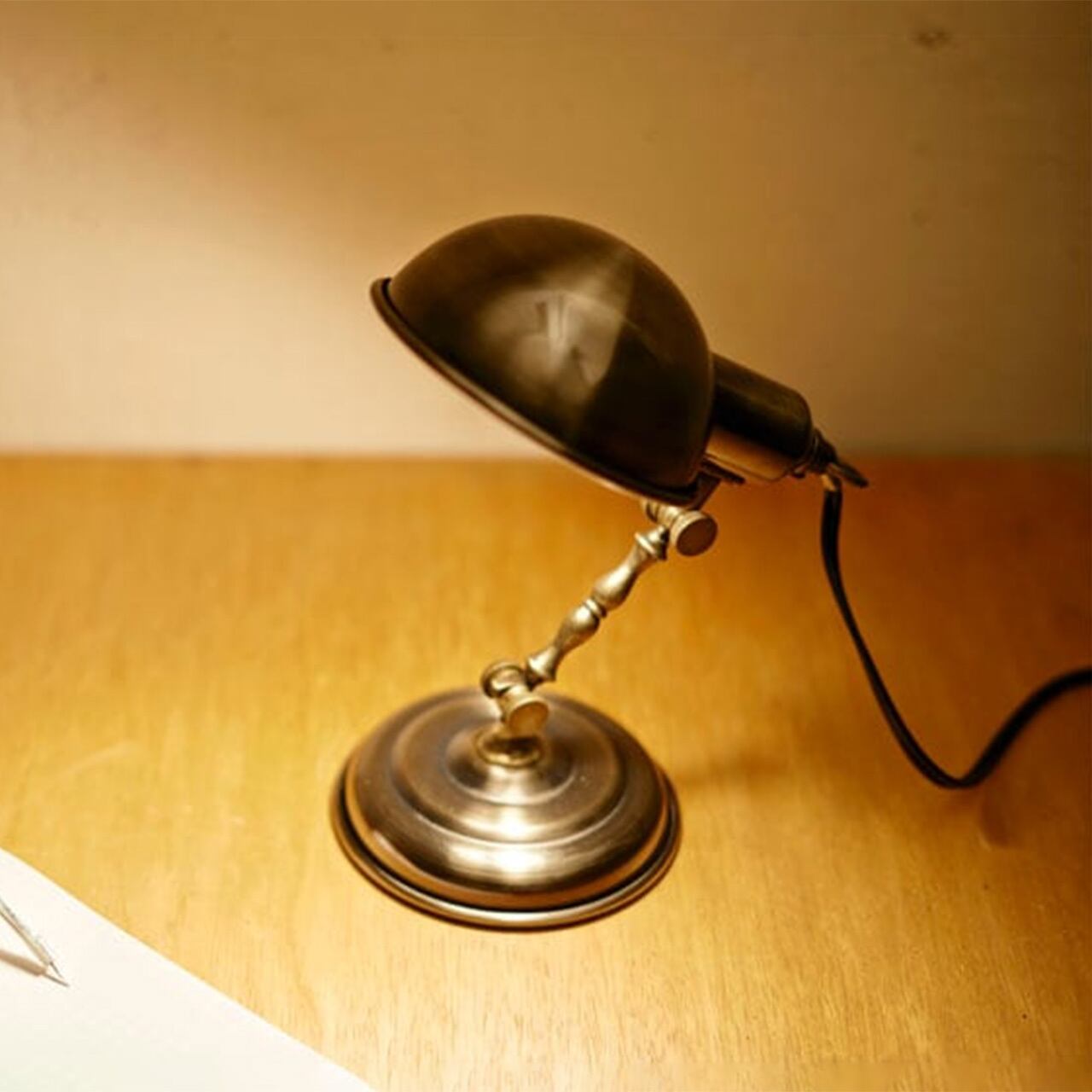 真鍮色のカラーリングと細部までこだわったデザインがアンティークな風合いを醸し出すデスクライトです。手元を照らす機能はもとより、映画の小道具のような完成度の高いオブジェとしてもお楽しみいただけます。フレンチアンティークをオマージュしたヘアライン加工が特徴的な真鍮カラーと、台座からアームにかけてのクラシカルなデザインなど、バランスの取れたフォルムが人気です。半球型のセードが下方向に光を集中させ、手元をくっきりと照らします。コンパクトなサイズ感や手軽な使用感など、書斎やデスクの心地よいアクセントとしてフィットします。アーム部分の2か所のつまみで角度を変えることができます。スイッチとコードはシックなブラックカラーで統一しました。台座の直径が10.5cmと手のひらより一回り大きいサイズ感なので、見た目に比べて手軽な使い勝手も評判です。