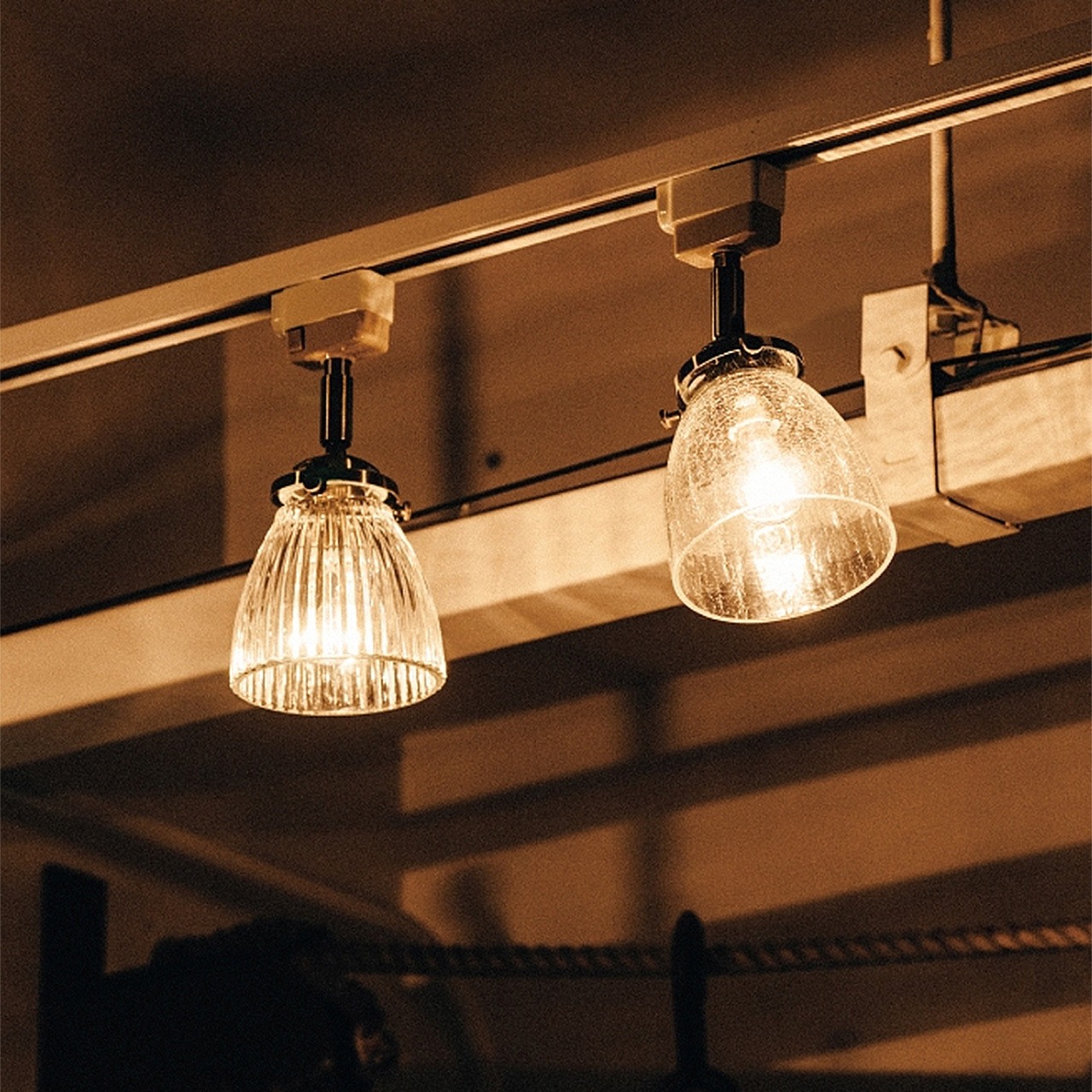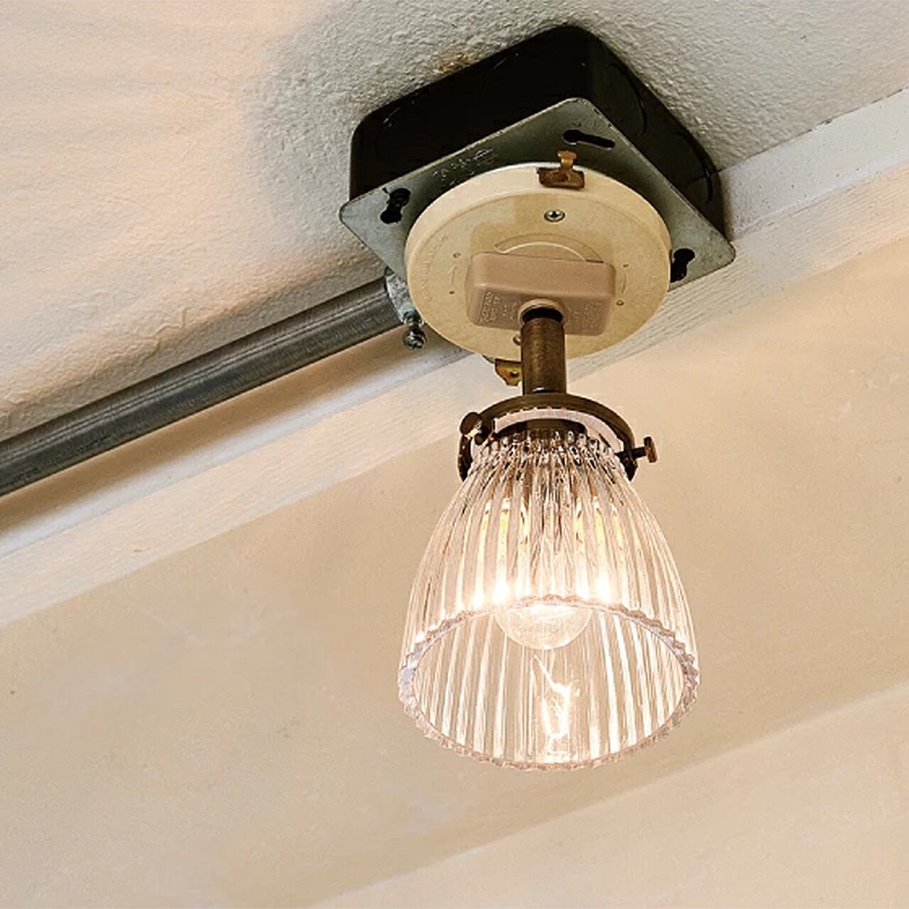 アンティークな表情と小ぶりなサイズのガラスセードが素朴ながら独特な輝きを放つスポットライトとして登場。ガラスのデザインはひび割れ加工のクラックとギザギザの凹凸が特徴のストライプから。小さなサイズなので、見た目にもキュートな印象に。点灯させるとガラスセードを通して屈折する光が美しい点も見どころです。キッチンやダイニングでの複数使いもおすすめです。凹凸やひび割れ模様などデザインガラスのセードは空間を彩るように落ち着いた印象をプラスします。レトロな雰囲気を出すためにあえてガラスのよれや不均一な厚みを残したままにしています。ガラスセードのスポットライトの特徴は天井側にも光が漏れること。厚みのあるガラスを通して広がる、印象的な影模様も魅力です。スチールのソケット部分はアンティークなゴールドカラーでレトロな雰囲気に。角度を変えて、思いの場所を照らすことができます。昭和レトロな和風から洋風まで幅広いシーンでコーディネイトしていただけます。