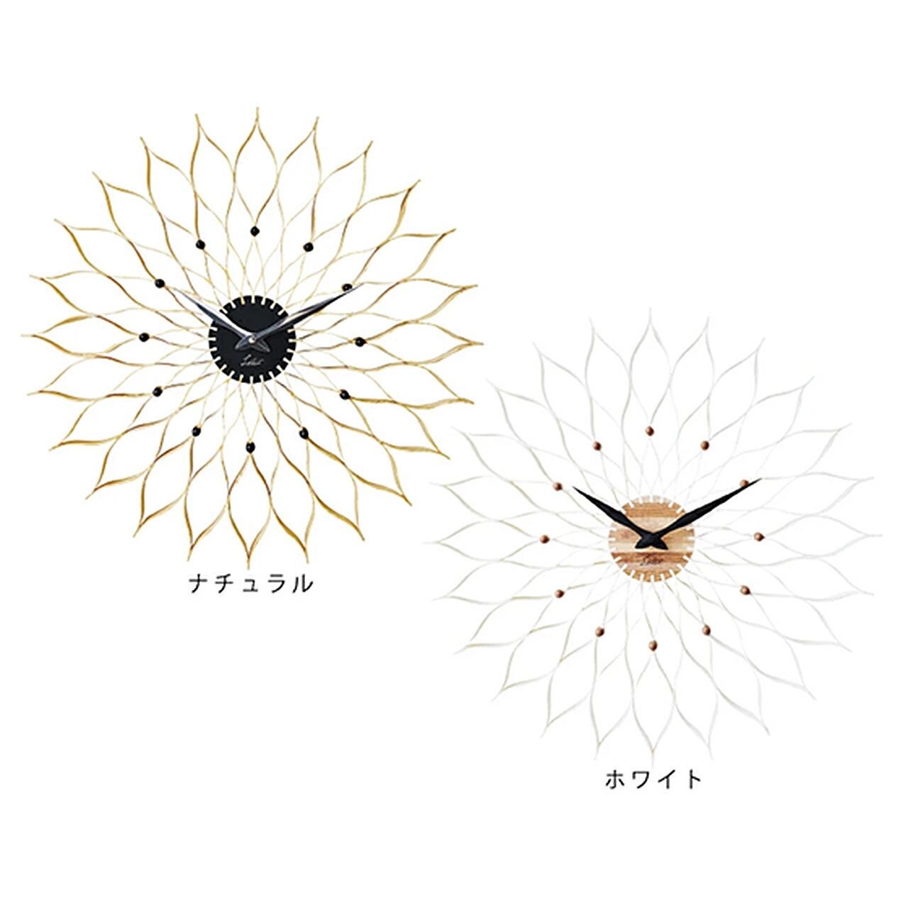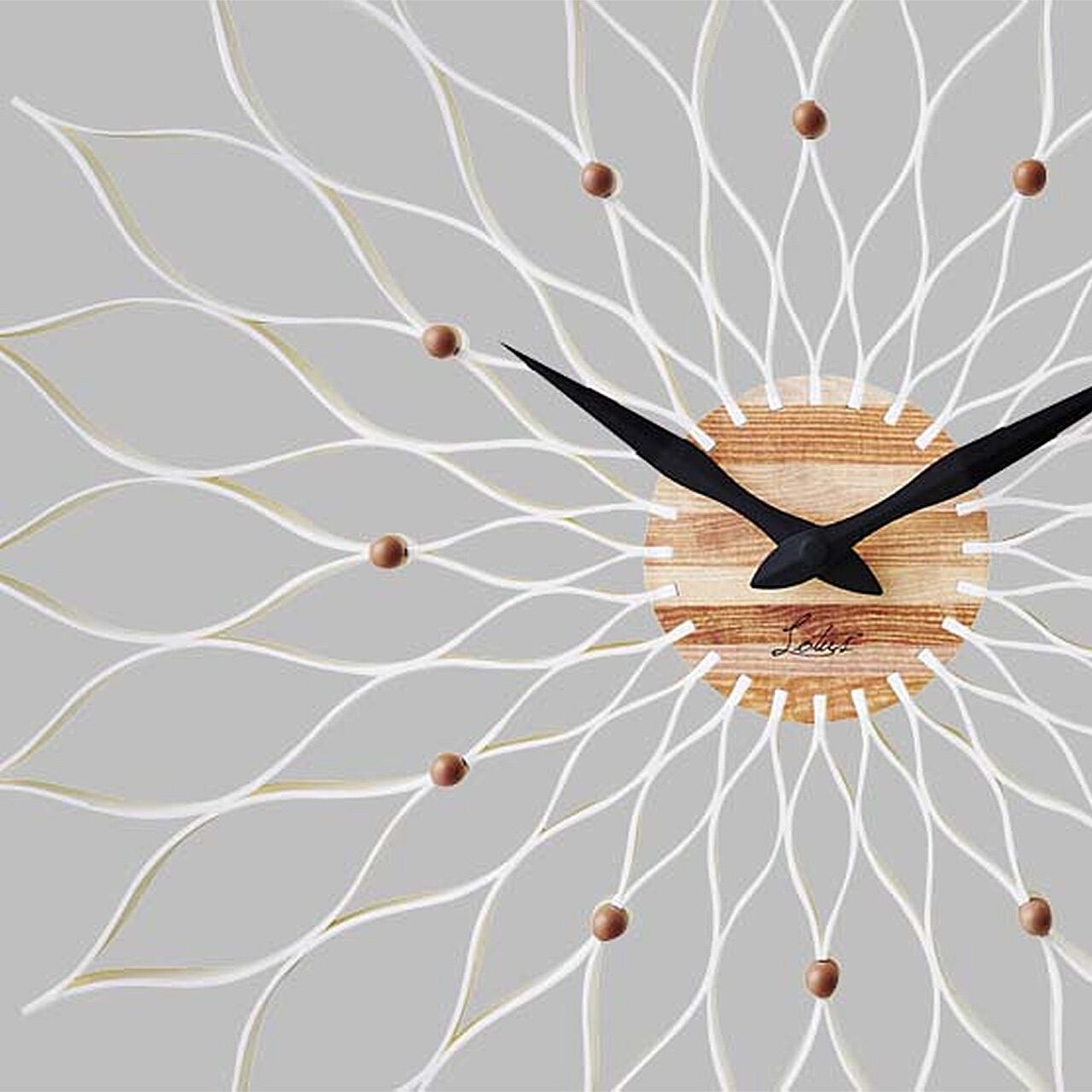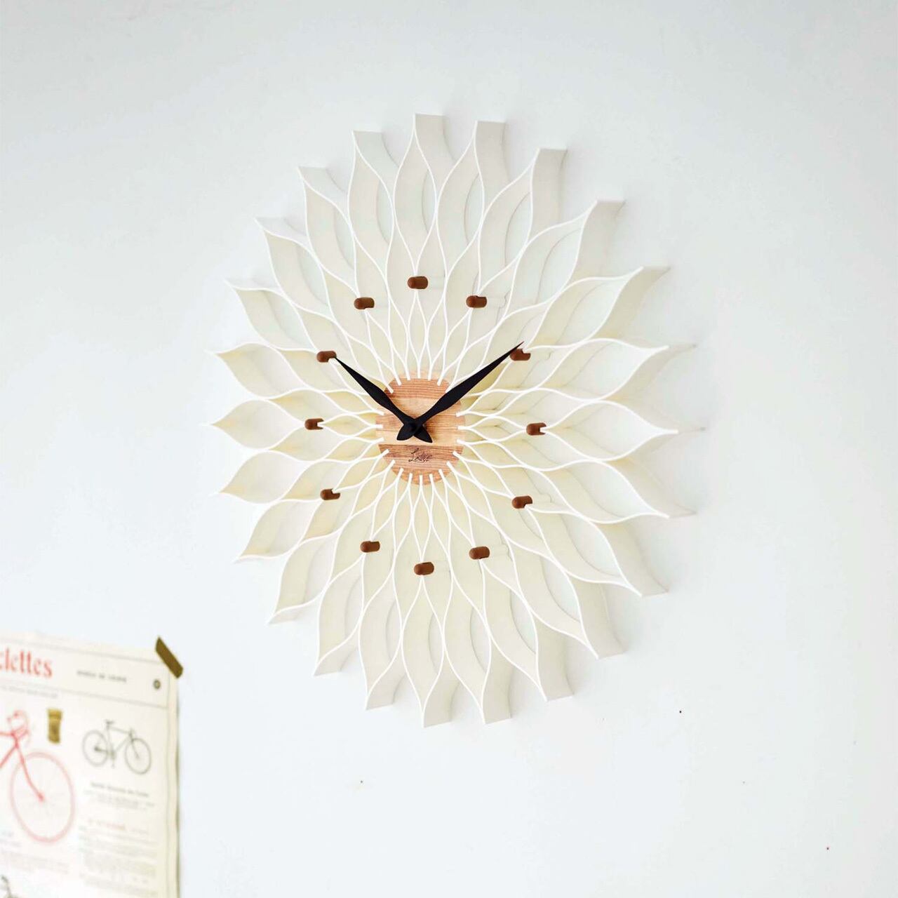 として最適です。5cmの奥行きが壁に落とすシルエットの影が、独特の立体感を生み、さらに存在感を示します。見る角度によってその姿も変わっていくオブジェのような側面も魅力です。ホワイトカラーは中央に、ナチュラルカラーは文字盤に木目調のデザインを取り入れることで温かみのある仕上がりに。ナチュラル系のコーディネイトにも合わせやすい不思議な魅力があります。数字の代わりに付けられた12個のプラスチックパーツがいいアクセントになっています。ひとたび飾ればその場がエレガントな空間に一変。どこか洗練された雰囲気に包まれた上品さが広がります。