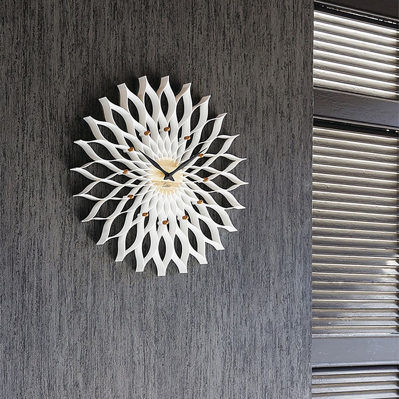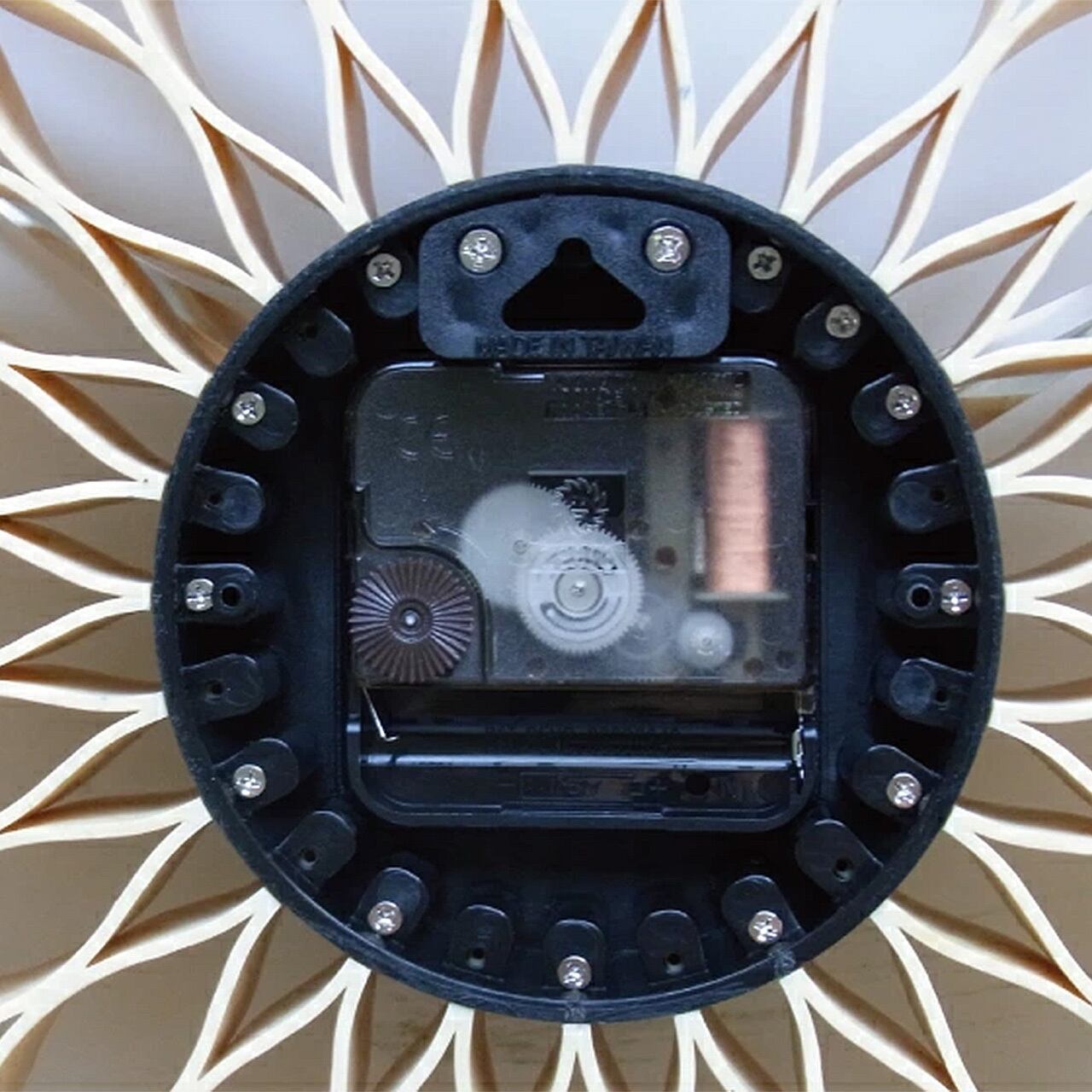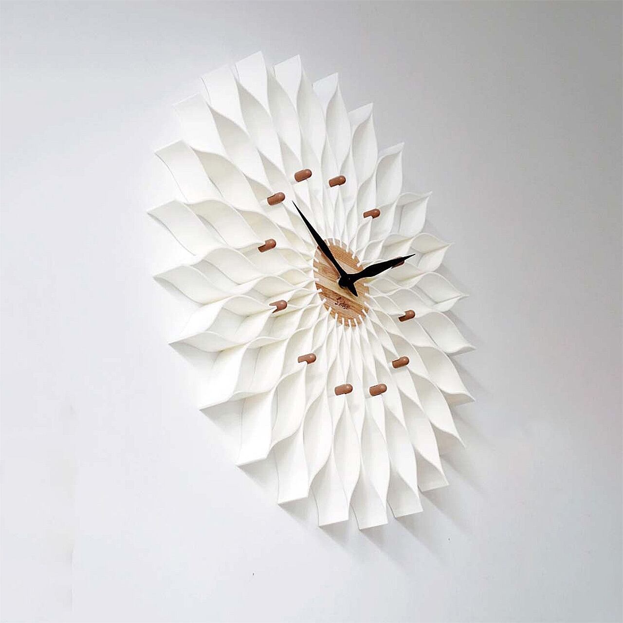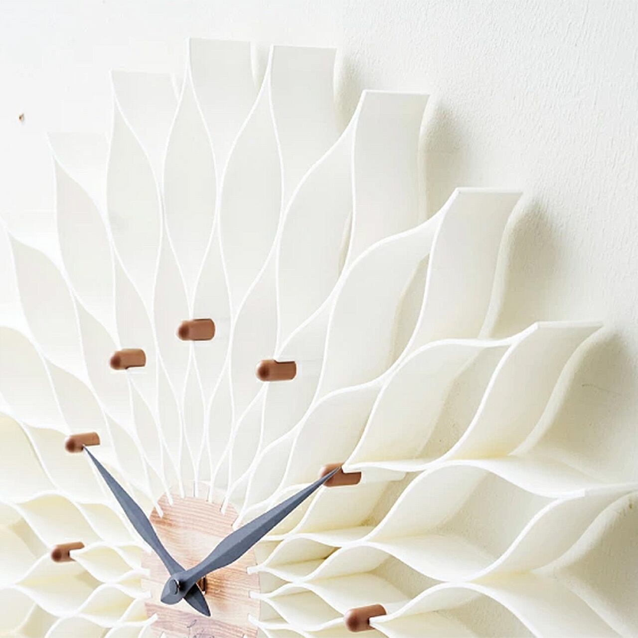 として最適です。5cmの奥行きが壁に落とすシルエットの影が、独特の立体感を生み、さらに存在感を示します。見る角度によってその姿も変わっていくオブジェのような側面も魅力です。ホワイトカラーは中央に、ナチュラルカラーは文字盤に木目調のデザインを取り入れることで温かみのある仕上がりに。ナチュラル系のコーディネイトにも合わせやすい不思議な魅力があります。数字の代わりに付けられた12個のプラスチックパーツがいいアクセントになっています。ひとたび飾ればその場がエレガントな空間に一変。どこか洗練された雰囲気に包まれた上品さが広がります。