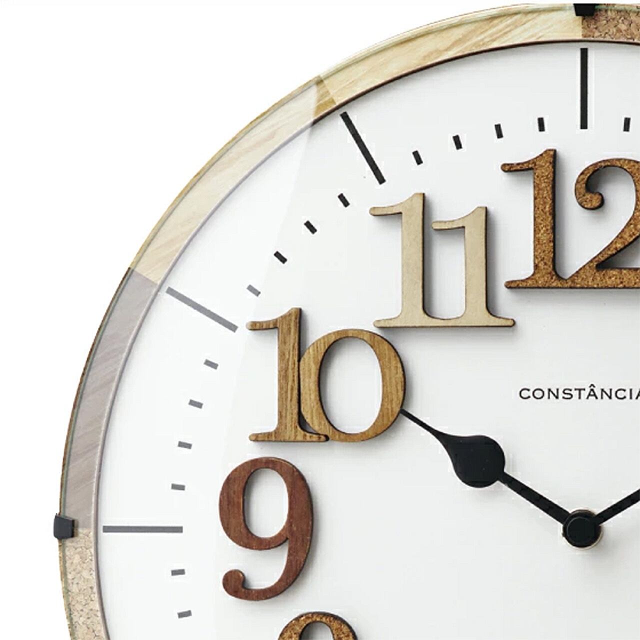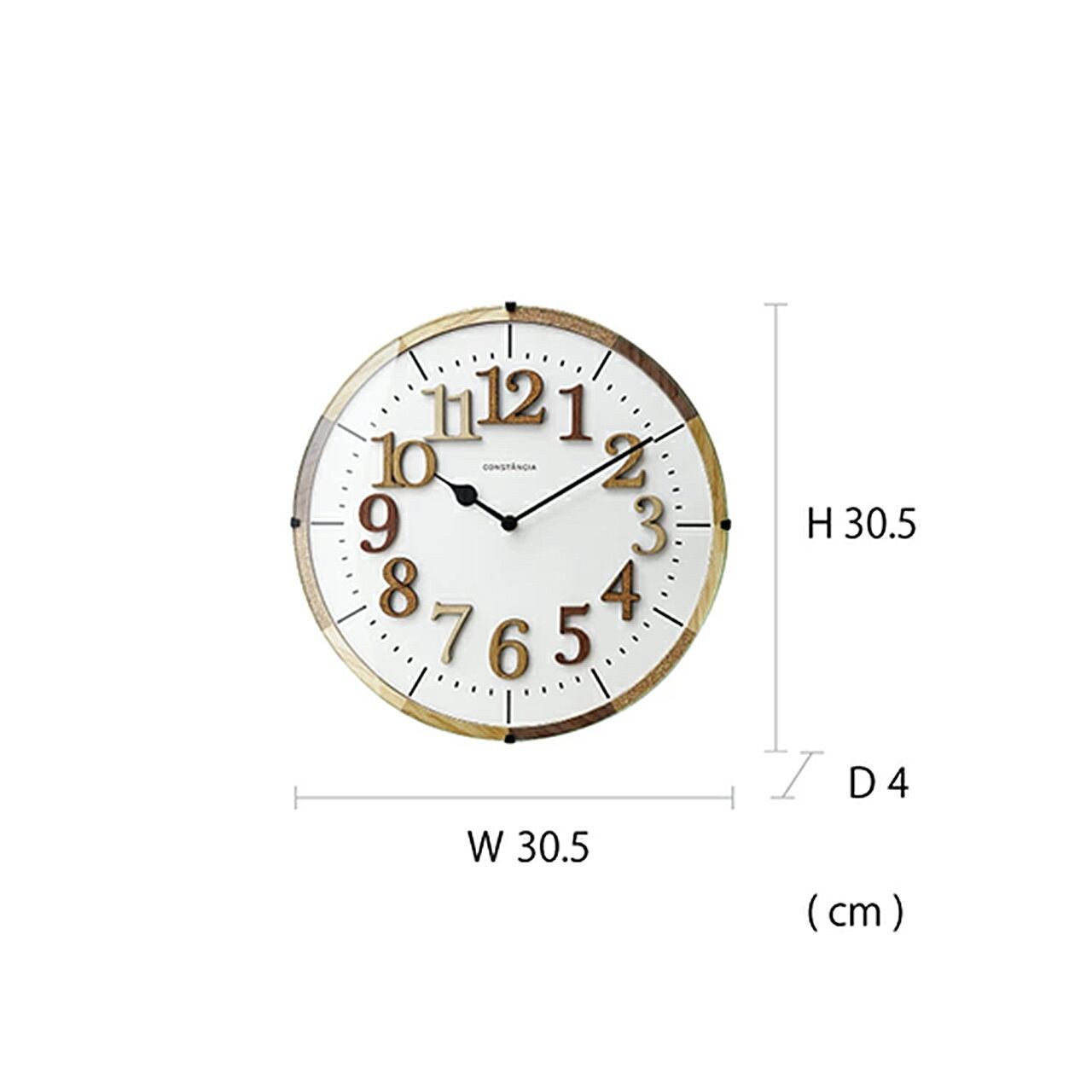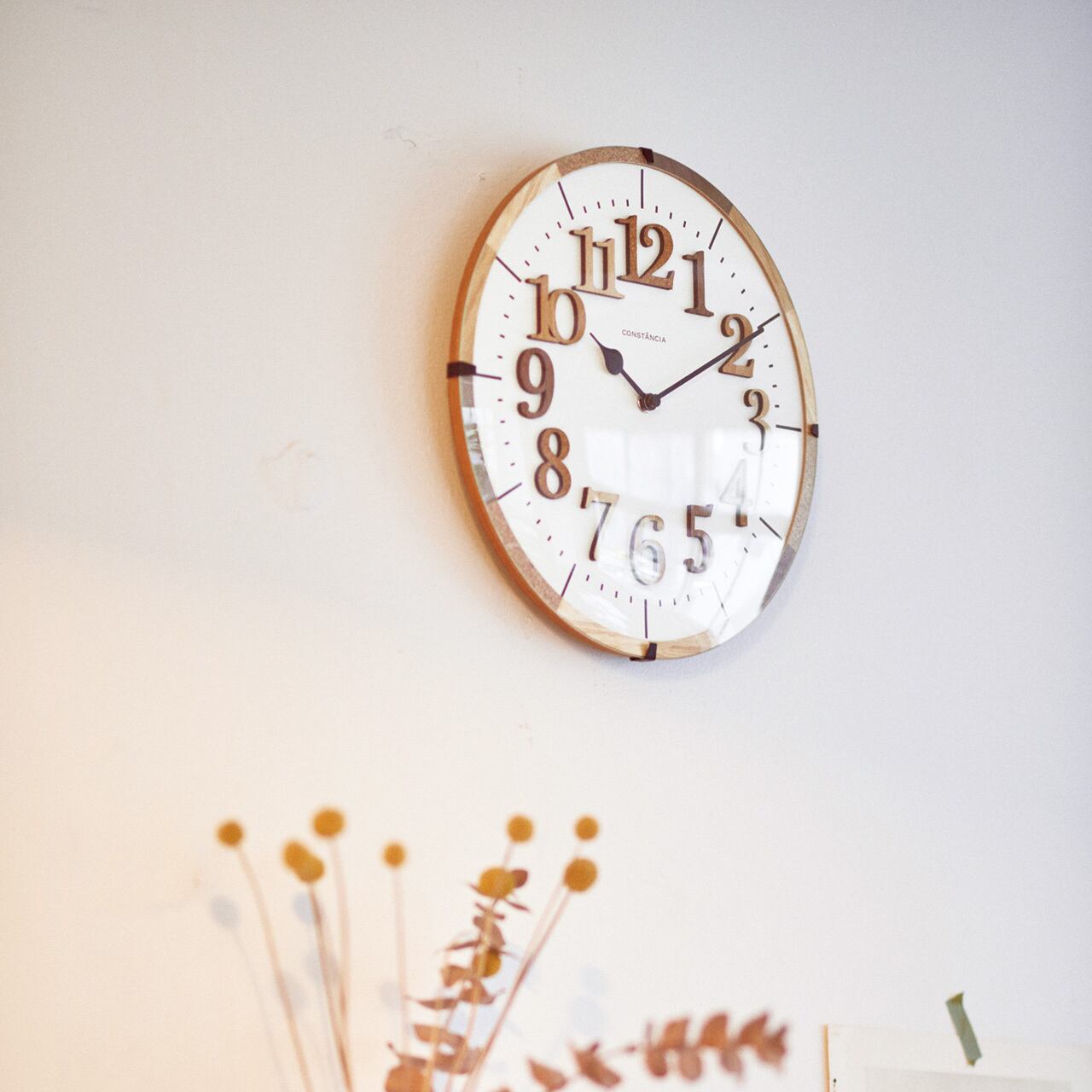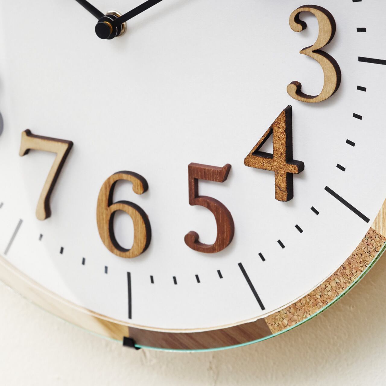 シンプルなデザインに少しずつトーンの異なるブラウンカラーを上品にコーディネイトして、やさしい表情をプラスした壁掛け時計です。立体になった数字に目をやると、木目やコルクなど模様もカラーも違う素材が豊かな表情を作り出しています。淵にもアクセントとして木枠を添えて表面には数字と同じ素材たちをプリントして統一感を持たせました。毎日目にするものだから飽きの来ないデザインを。温かみを忘れない場所にはナチュラルな印象のもので。人が集まる場所に飾りたい、そんなシンプルデザインです。時刻合わせが不要で正確な時刻を表示する人気の電波時計仕様なので贈り物としてもおすすめです。ナチュラルでアットホームな雰囲気は様々なシーンに合わせてお楽しみいただけます。