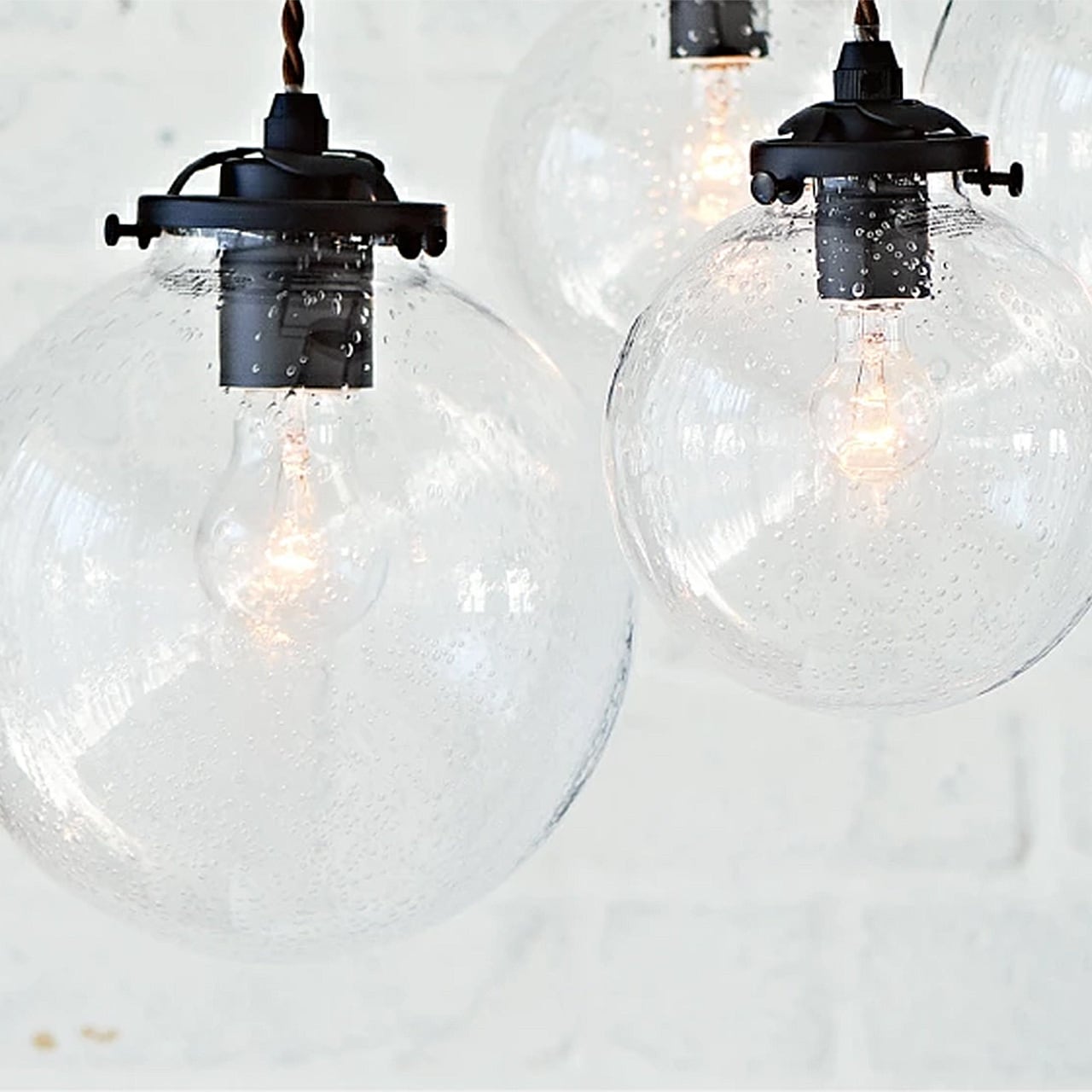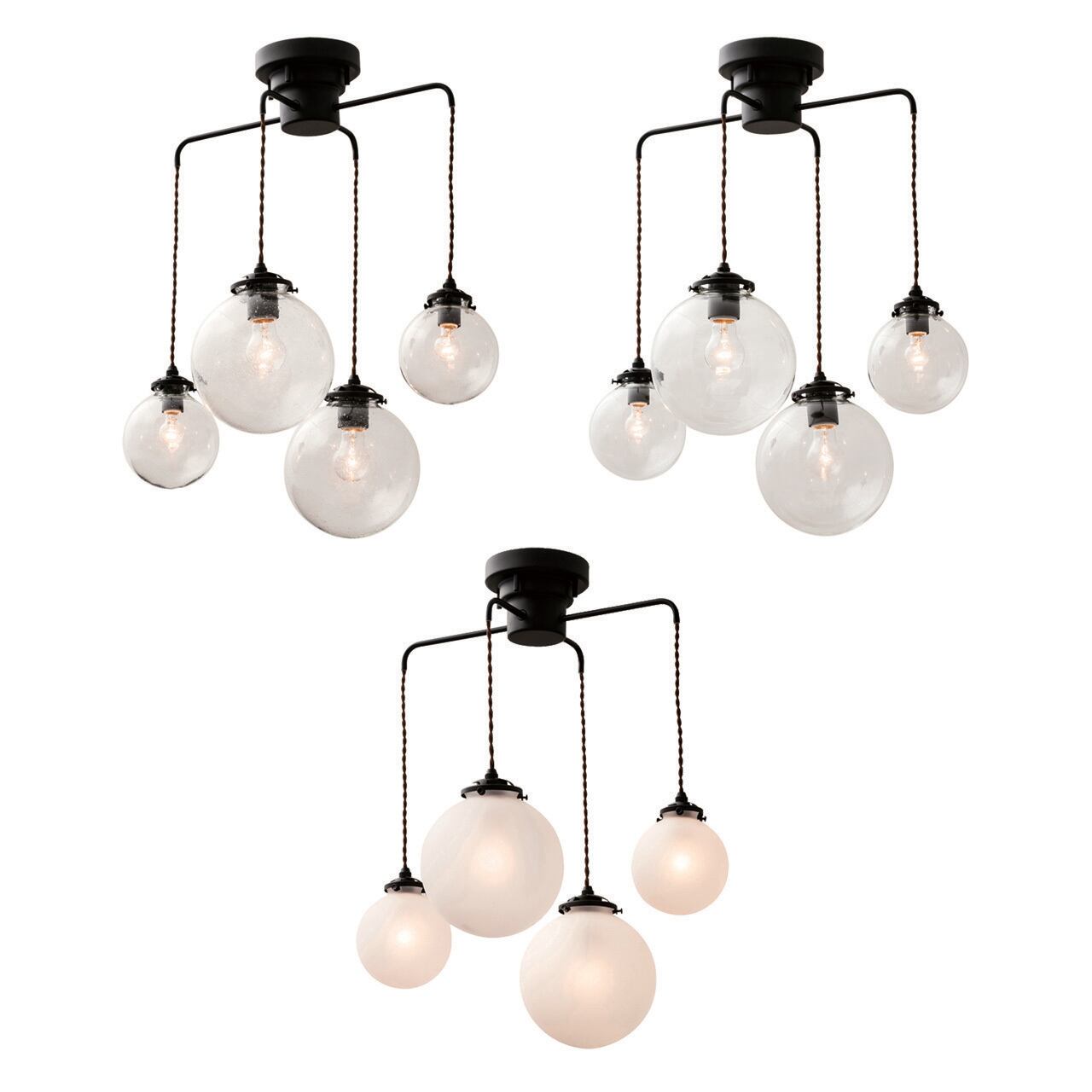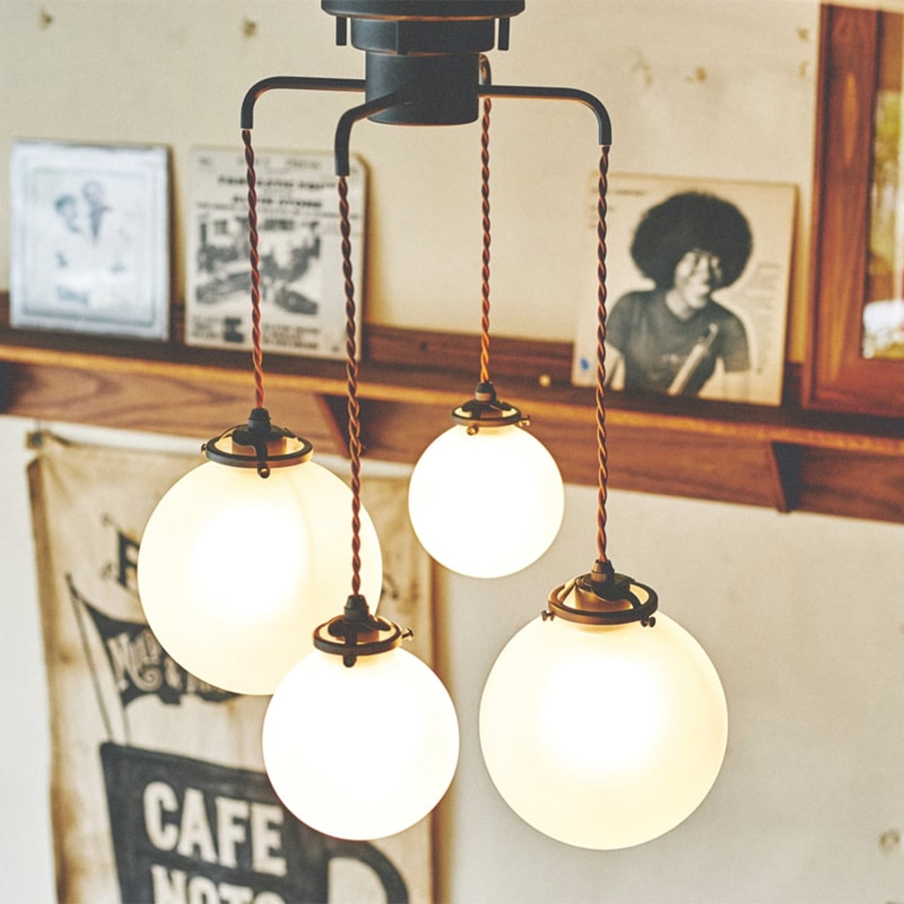 人気のシンプルデザインのガラスセードをサイズ違いで合わせた、ひとつで複数使いを楽しめるペンダントライトです。どこか懐かしさも感じられるデザインが幻想的な空間づくりをお手伝いします。惑星や月が浮かんでいるようなそんな不思議な感覚とねじられたコードやソケット部分のアンティークな要素がミックスされた、主役級のランプです。コードの長さをあえて不揃いにすることで、リズミカルに浮遊するかのような幻想的な光の空間が生まれます。十分な光量を確保できますので、広めのリビングやゴージャスなインテリアとの相性もいいデザインです。マットブラックのソケットとブラウンの縒りコードを採用することで、シャープで落ち着きのある印象です。天井のプラグ部分もマットブラックに統一。予めコードが繋がれています。