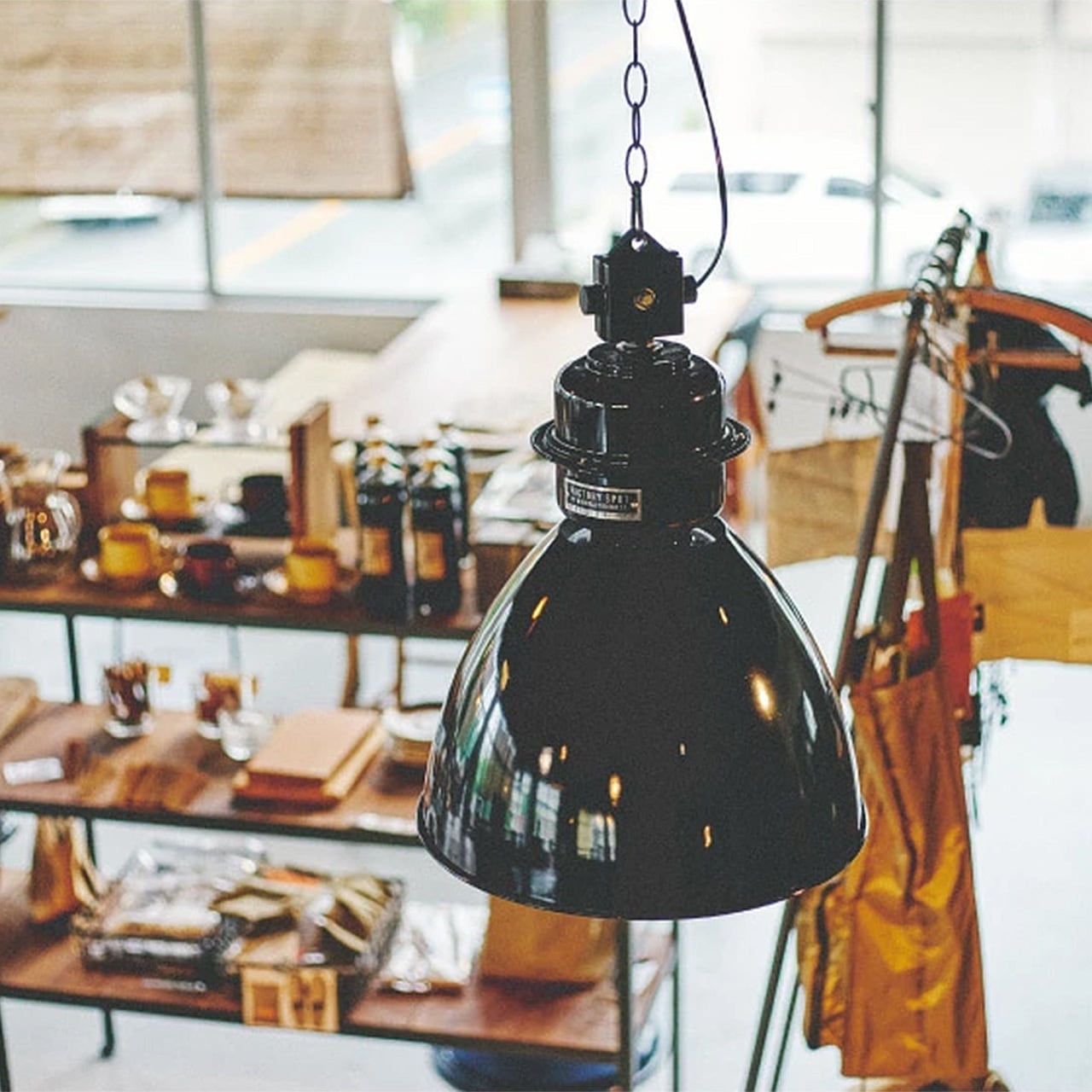 ボリュームのある大胆なフォルムやソケットカバー部のプレートなど、インダストリアルなディテールにこだわった存在感抜群のペンダントライトです。海外の工場やカフェで見られる大きなランプセードのデザインは空間の中でも主役級のアイテムになってくれます。ボリュームのあるセードを吊り下げるチェーンやソケットカバー、アルミのプレートなどアンティークツールのようなプロダクトな雰囲気を再現しました。長さの調節もでき、余分なコードはシーリングカップの中にスッキリと収納できます。通常よりもコードを長く設定しているので、ご家庭だけでなく、天井が高いショップやレストランなどでの使用にも好評です。光源を包み込むようなフォルムは集光性が高く、ダイニングテーブルなどの上に低めに吊るすことで、親密な空間を演出します。複数を並べて吊るせば、海外のカフェやレストランのような雰囲気を演出することもできます。非日常なイメージを取り入れて海外のオシャレスポットのような憧れのインテリアに。