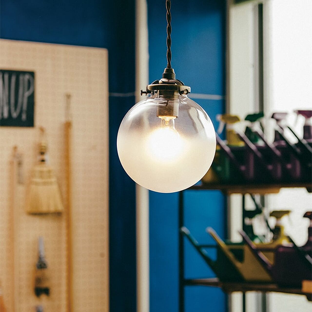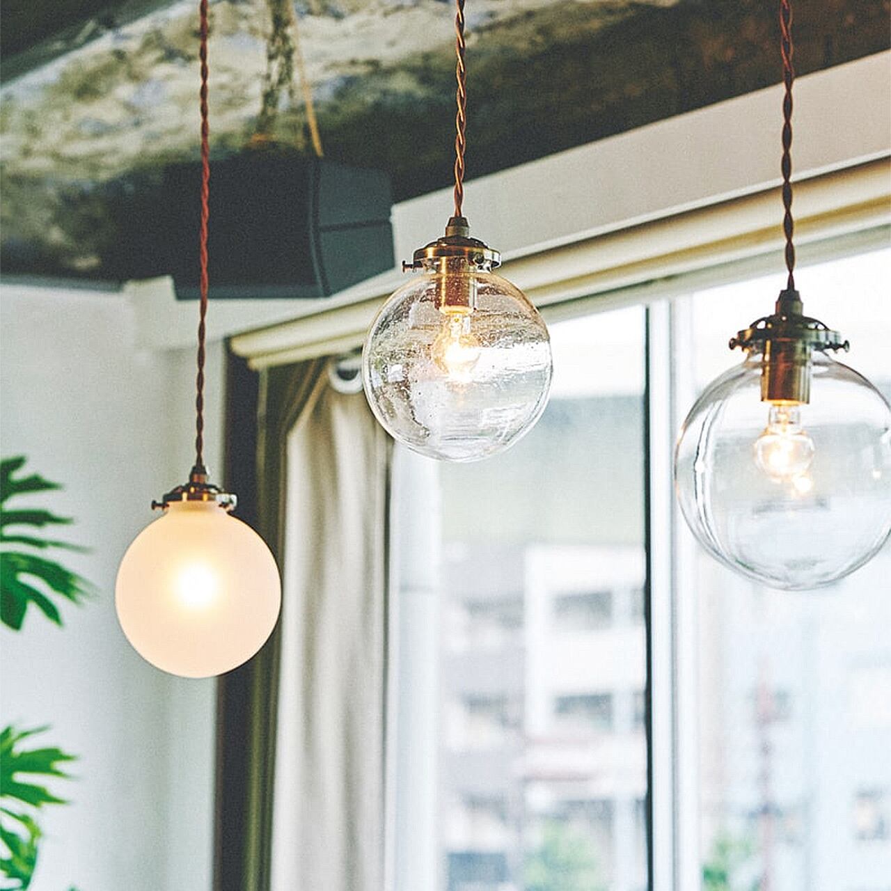 まあるいシャボン玉のようなシンプルフォルムに表情豊かなガラスセードを合わせました。ガラスを通して広がるあかりが幻想的な雰囲気いっぱいのペンダントライトです。惑星や月が浮かんでいるような、そんな不思議な感覚とねじられたコードやソケット部分のアンティークな要素がミックスされたコーディネイトしやすいランプです。ひとつひとつ手作業で仕上げた少し厚めの丸いガラスは、全部で5種類。汎用性の高いシンプルなガラスセードは合わせるインテリアのテイストを選びません。アンティークゴールドのソケットと縒りコードの組み合わせが少しレトロな雰囲気に。長さの調節もでき、余ったコードはシーリングカップの中にスッキリと収納できます。気泡やガラス片加工は灯した時に広がる影も魅力のひとつです。複数で吊るせば、華やかな印象に変わります。
