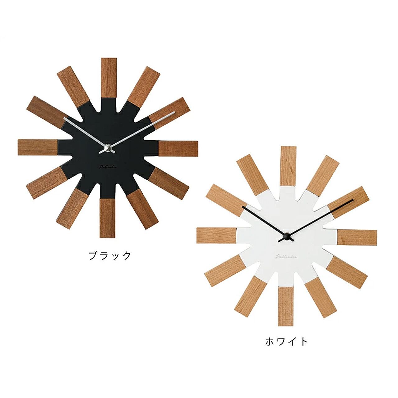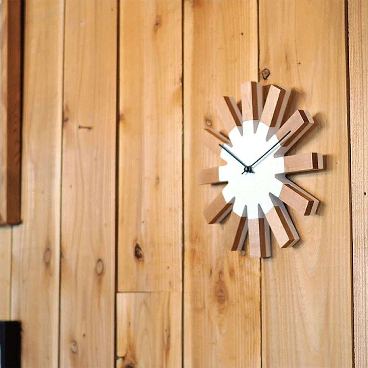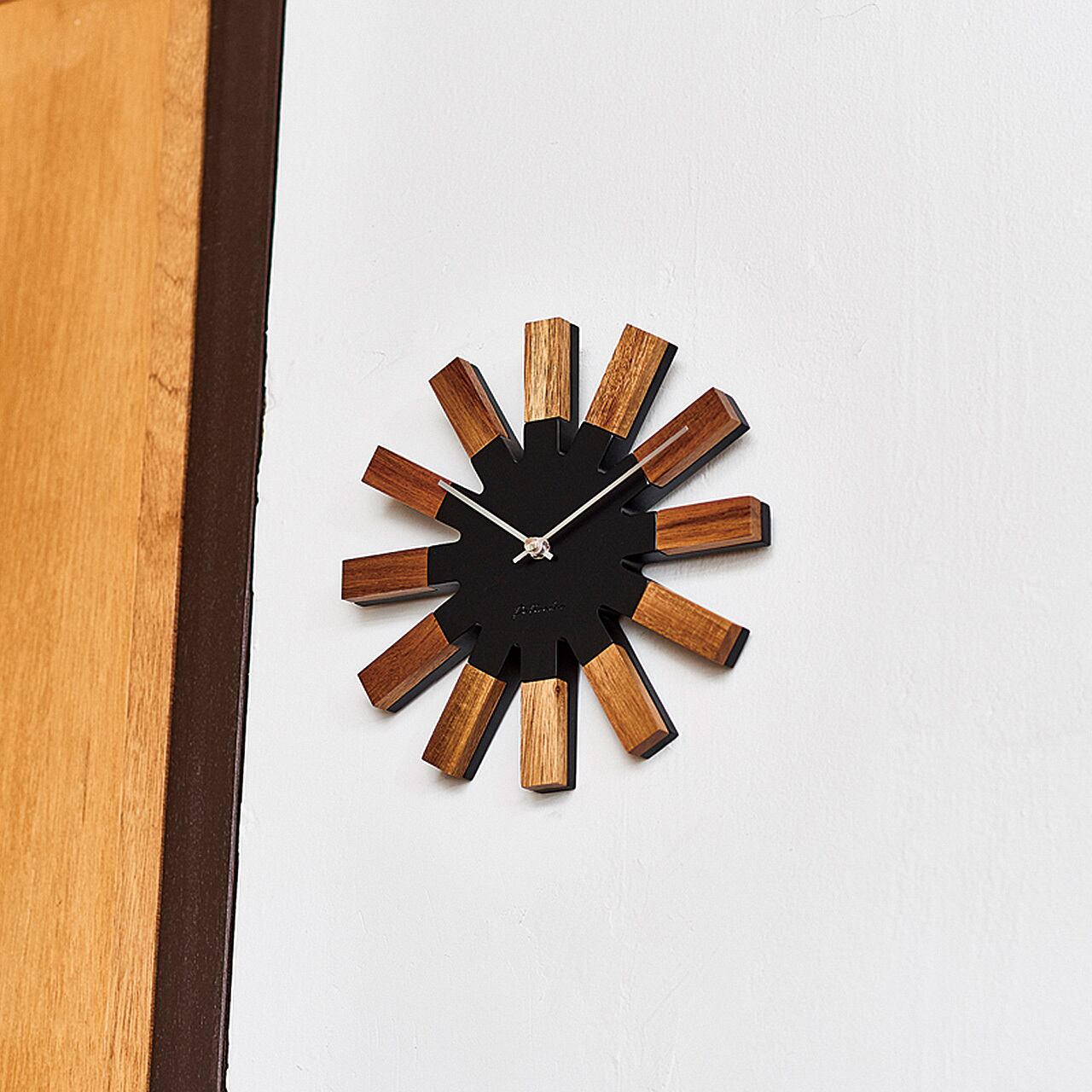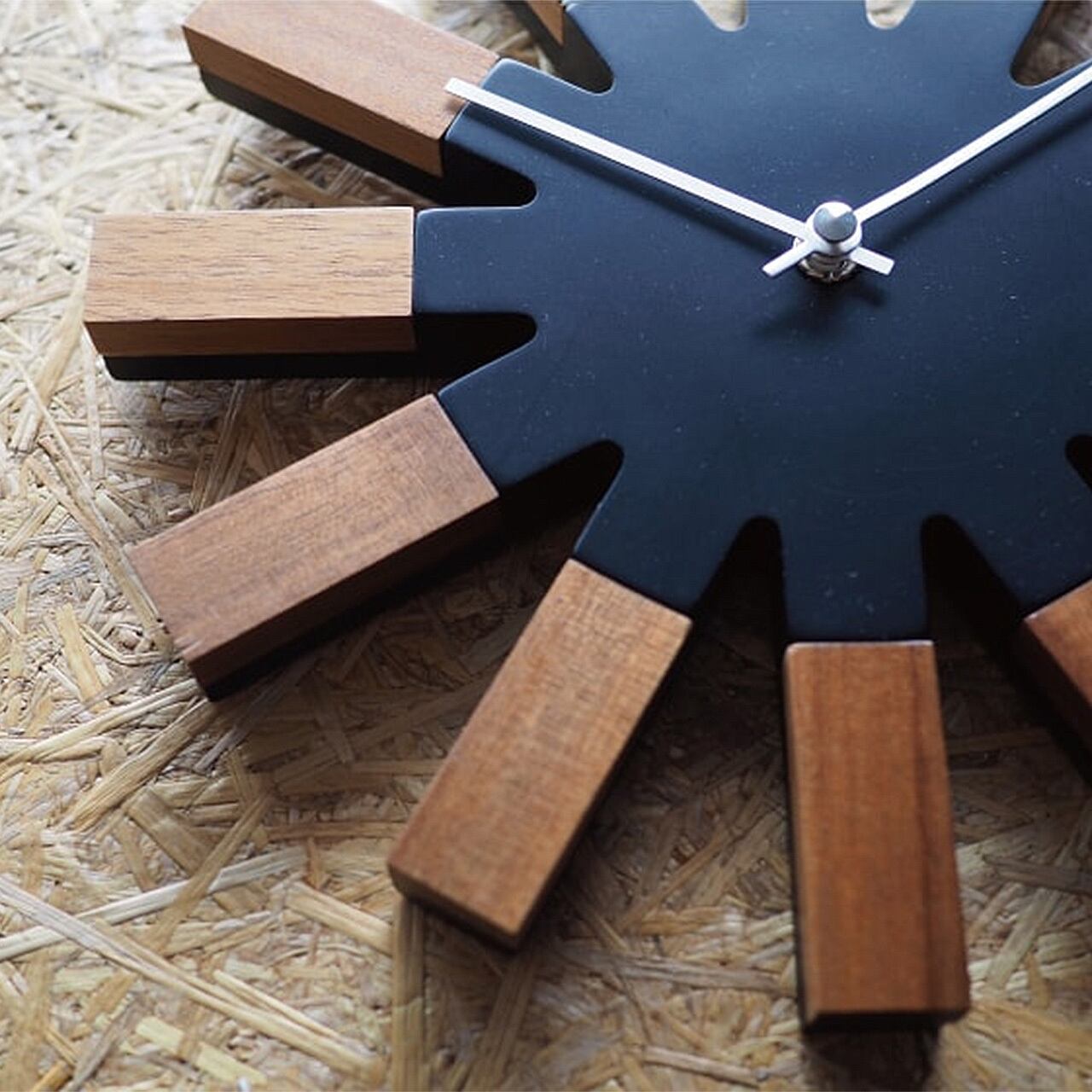 歯車のような、アスタリスクのような、太陽のような。見方によって、見る人によっていろんな印象を与えてくれるフォルムの壁掛け時計です。カラーは定番のブラックとホワイトをご用意しました。定番の北欧テイストはもちろん、モダンやナチュラルな空間によく馴染む仕上がりです。異素材を組み合わせて、特徴的なフォルムに親しみをプラスしました。12本のインデックス部分に木を加えることで、ナチュラルな要素に加えてモダンなリズムが生まれます。本体には陶器のようななめらかな表面とずっしりとした質感が特徴のポリレジン素材を使用しました。マットに仕上げているので落ち着いた印象になっています。直径が25cmと少し小さめのサイズ感がかわいい存在です。典型的な時計とは一線を画すオブジェ的な要素があるのもポイントです。秒針のコチコチ音がしない静音タイプのムーブメントを使用しているので、寝室や枕元など静かな場所でも気兼ねなくお使いいただけます。