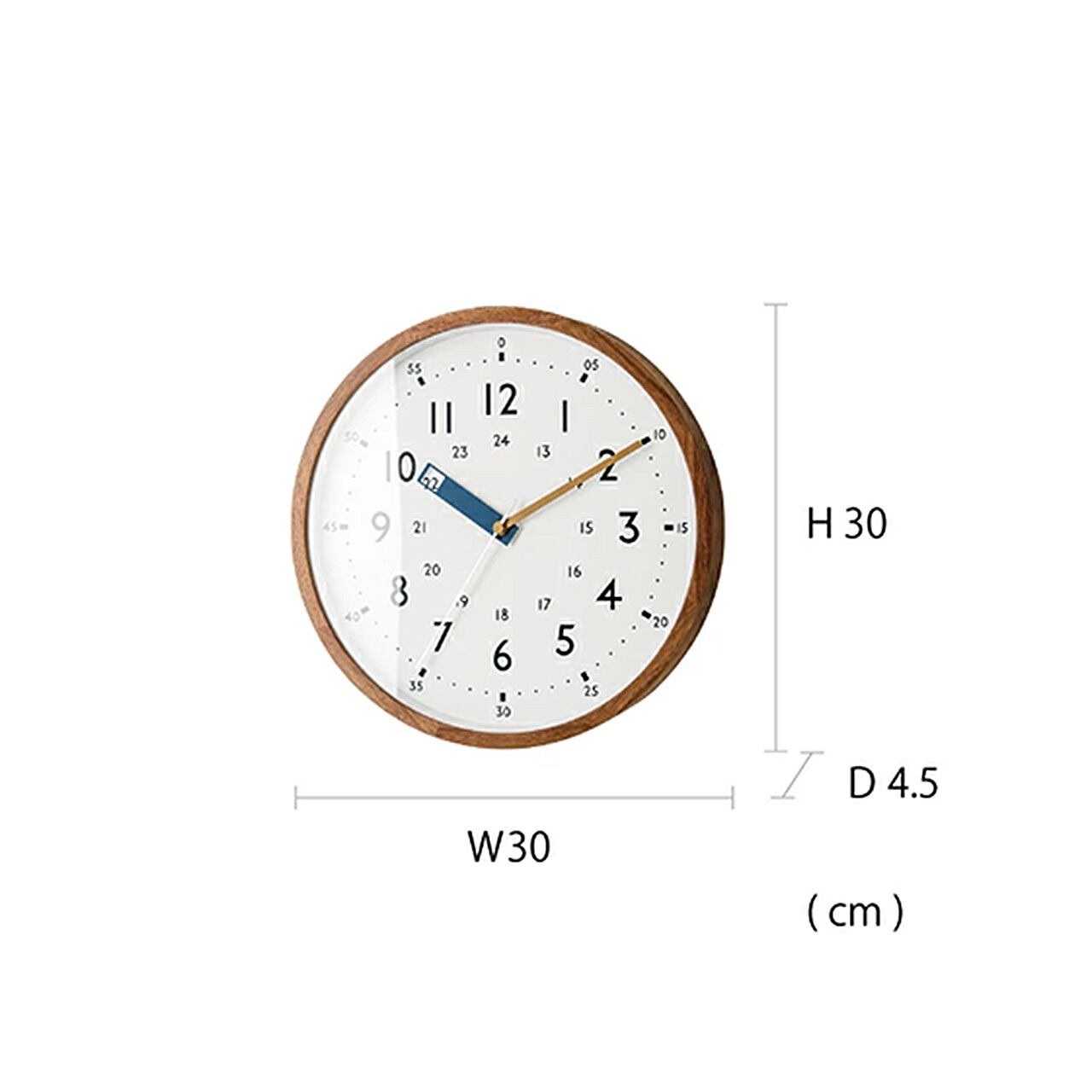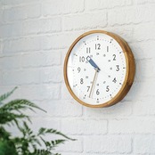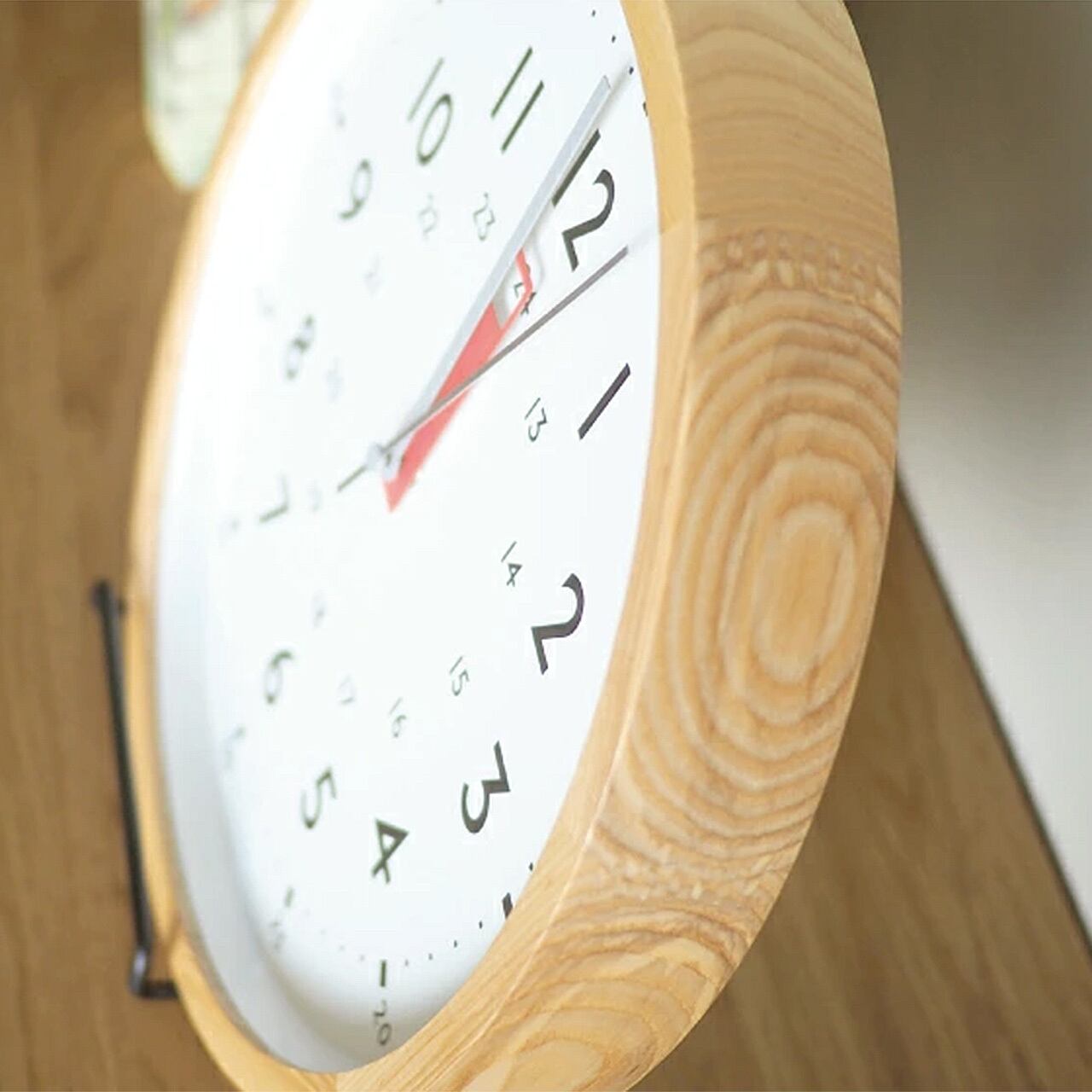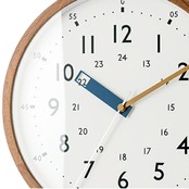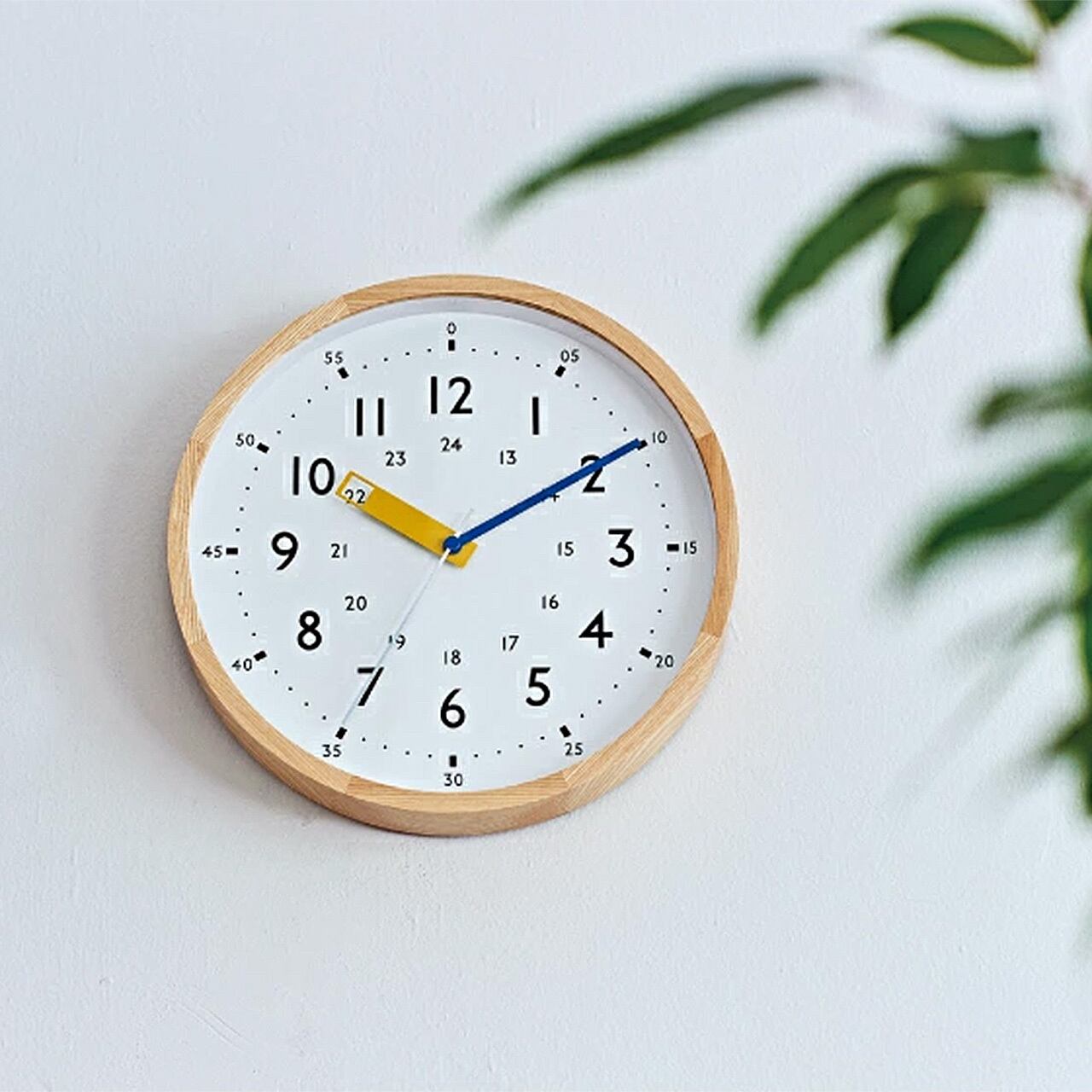 たくさんの数字が配置されながらも、極力シンプルに仕上げた文字盤の上で、カラフルな針たちがポイントになった壁掛け時計です。よーく見てみると、時計の読み方のヒントが隠されています。ホワイトの文字盤に映えるカラフルなカラーリングが3種類。子供っぽくなりすぎない組み合わせがポイントです。36もの数字に加えてインデックスが並んだ文字盤を、うるさくならないように絶妙なバランスでデザインしました。家族の集まる場所におすすめの仕上がりです。1日は24時間、1時間は60分・・・。同じ5時でも17時なんて言い方もする。数字を覚えた子供たちにぜひ教えたい時間の数え方。これが教えるとなると意外と難しい。そんな場面にピッタリのデザインができました。秒針と長針の先、一番外側には60までの数字が小さく書かれています。そして時間を指す短針に開けられた小さな窓の向こうに現れるのは24時間表示の午後の部分。時計をみるだけで「午後10時は22時」が一目瞭然!これは大人も助かるかも。毎日眺めるものなので自然と覚えられそうです。フレームは木目の美しさが堪能できる木製フレームを合わせました。よく見るとパズルのように複数のパーツを組み合わせた、とってもクラフトテイストのある上品な仕組みです。時刻合わせが不要で正確な時刻を表示する人気の電波時計仕様なので贈り物としてもおすすめです。ナチュラルでアットホームな雰囲気は様々なシーンに合わせてお楽しみいただけます。