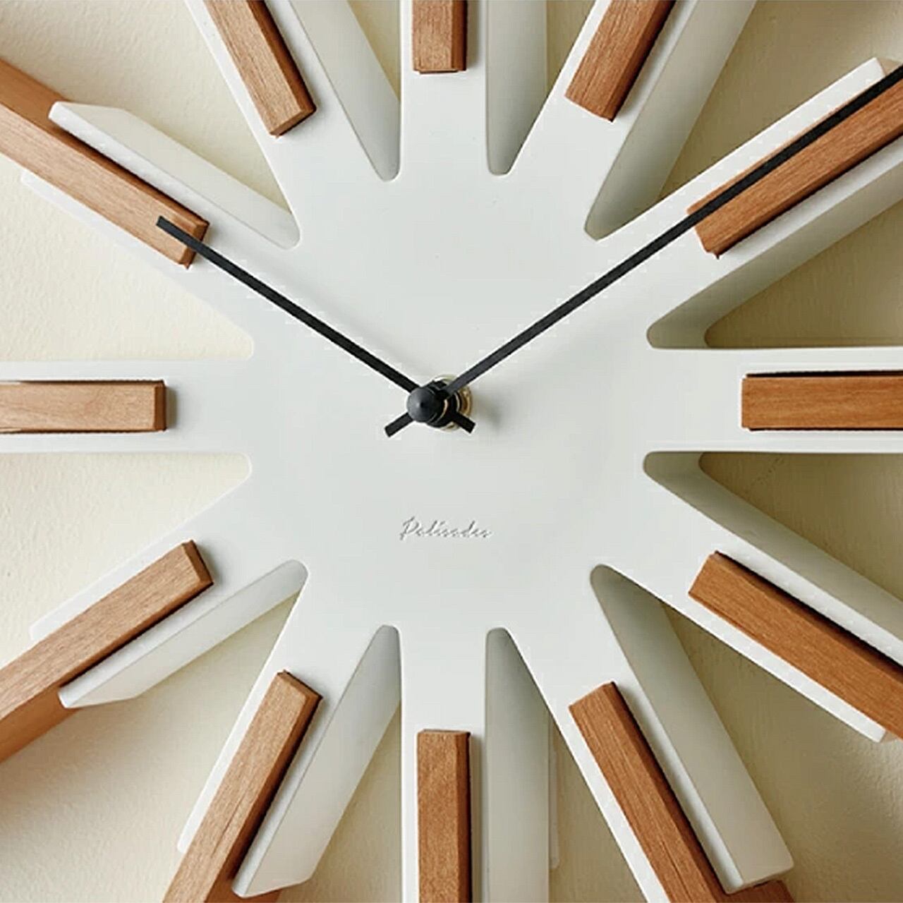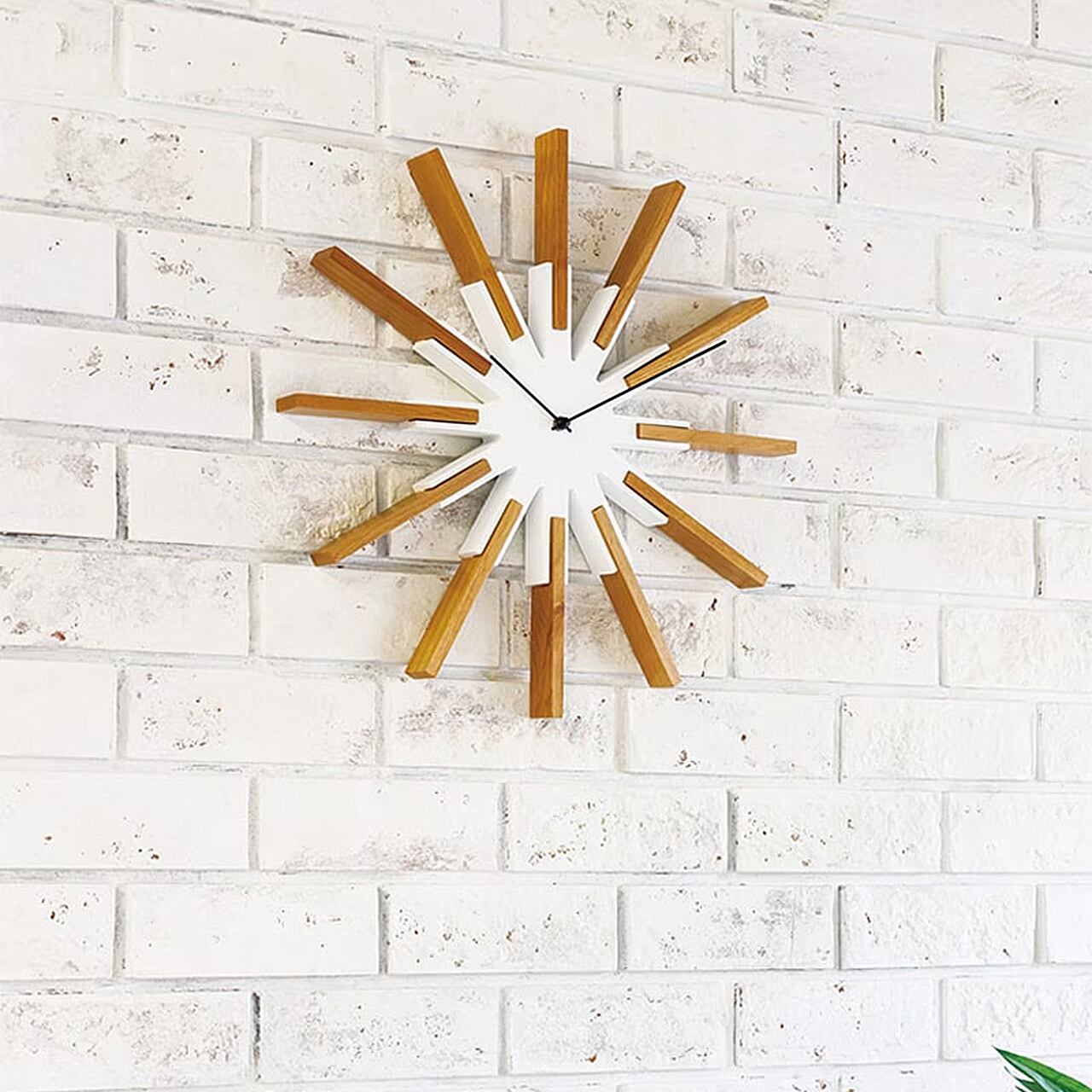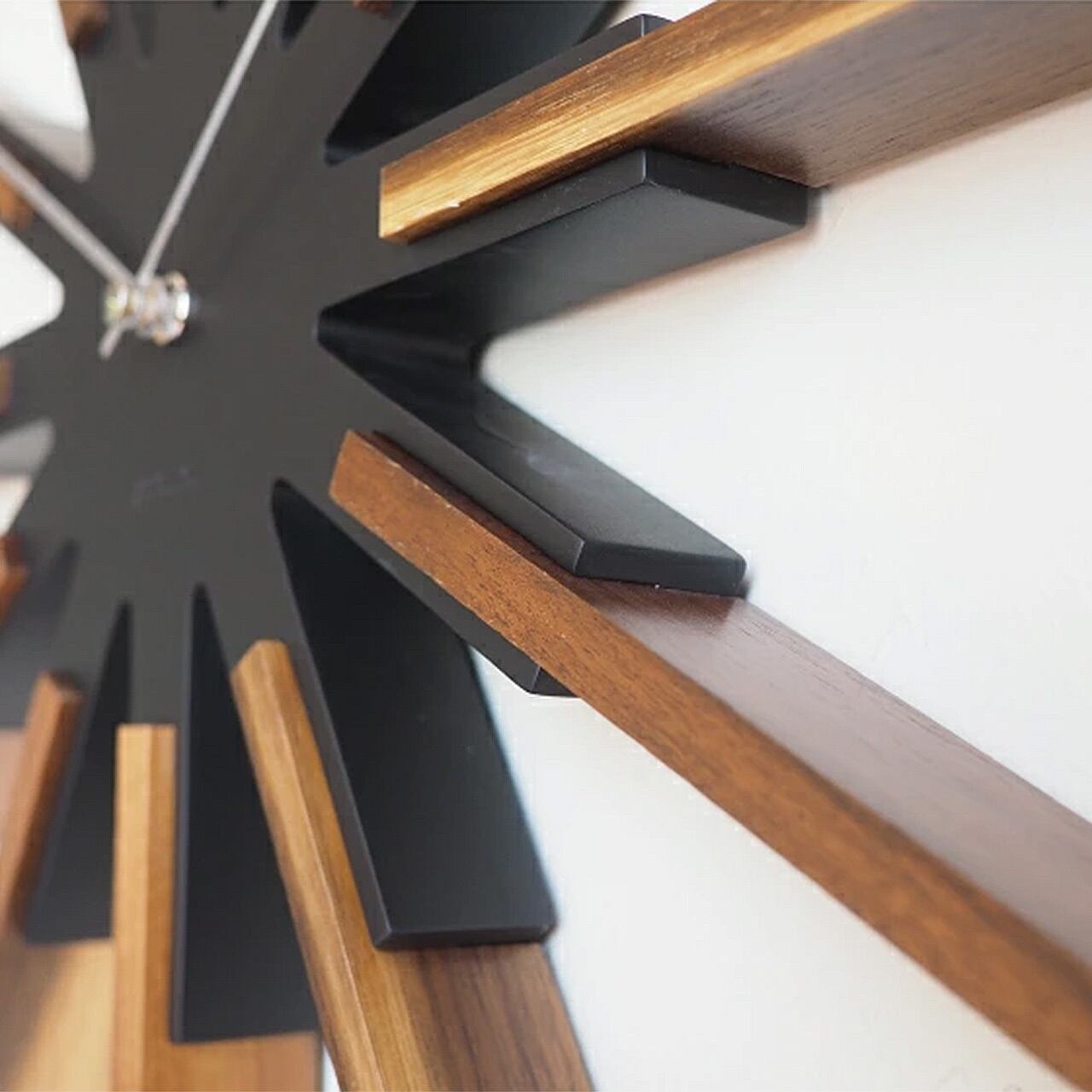 直線的なラインと大きめサイズが印象的なシンプルモダンな壁掛け時計です。ポリレジンと木を組み合わせることで表情が広がり、いろいろなシチュエーションにフィットするデザインになりました。カラーは定番のブラックとホワイトの2色から。モダンやシンプルな空間にもよく馴染む仕上がりです。歯車を思わせる放射型のデザインは直径44cmと大きめサイズながら細く直線的なラインなので、圧迫感もなく悪目立ちしない存在感があります。文字盤に使用したのは陶器のような質感のポリレジンと木目が味のある木の2種類。異素材の組み合わせが一層個性的なルックスに。中央のポリレジンと木のパーツをパズルのように組み合わせました。少し段差を付けることでクラフトテイストのある質感を演出しています。秒針のコチコチ音がしない静音タイプのムーブメントを使用しているので、寝室や枕元など静かな場所でも気兼ねなくお使いいただけます。